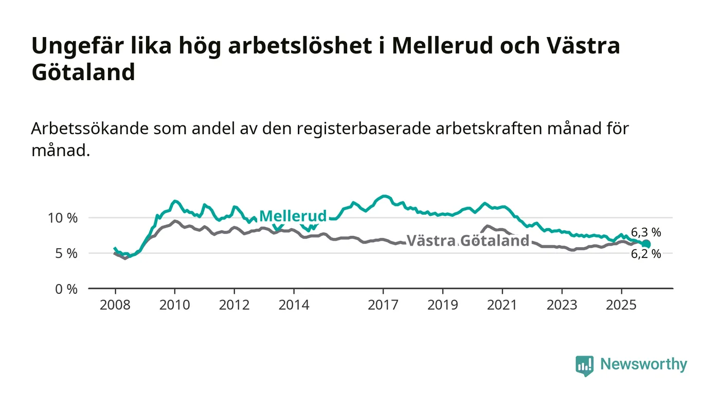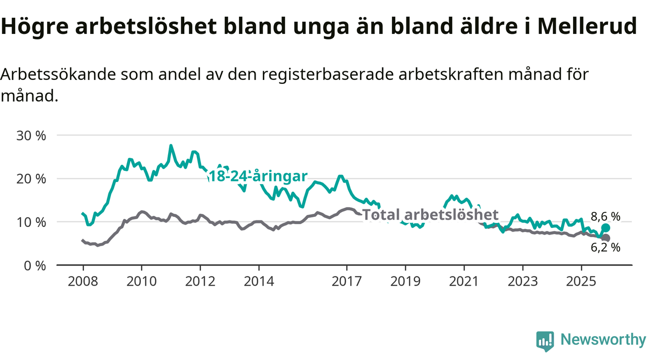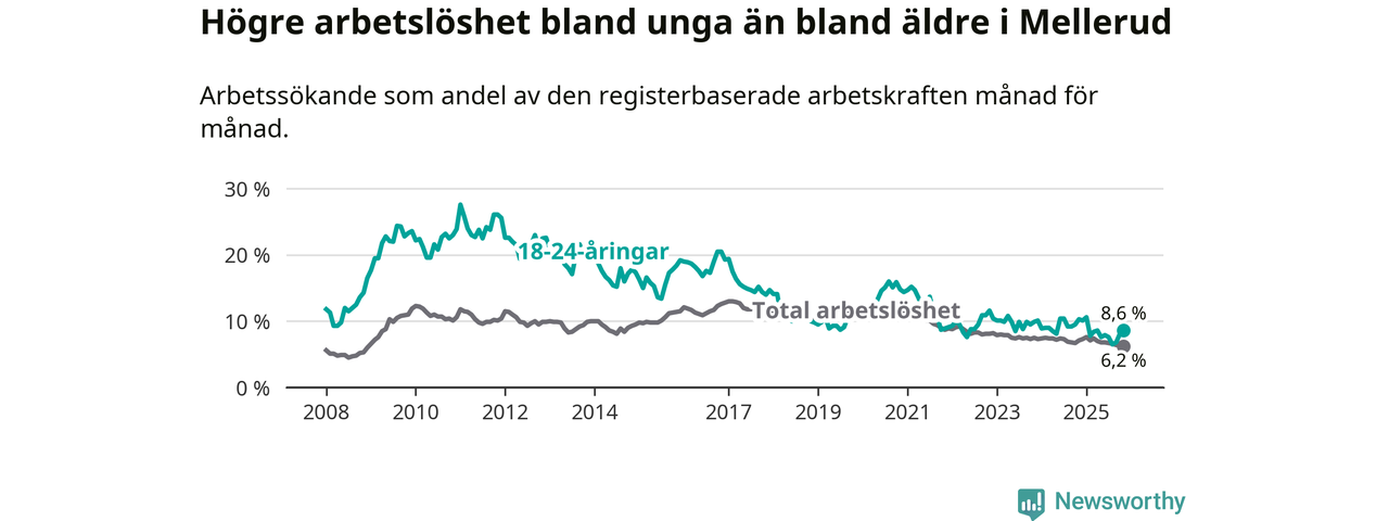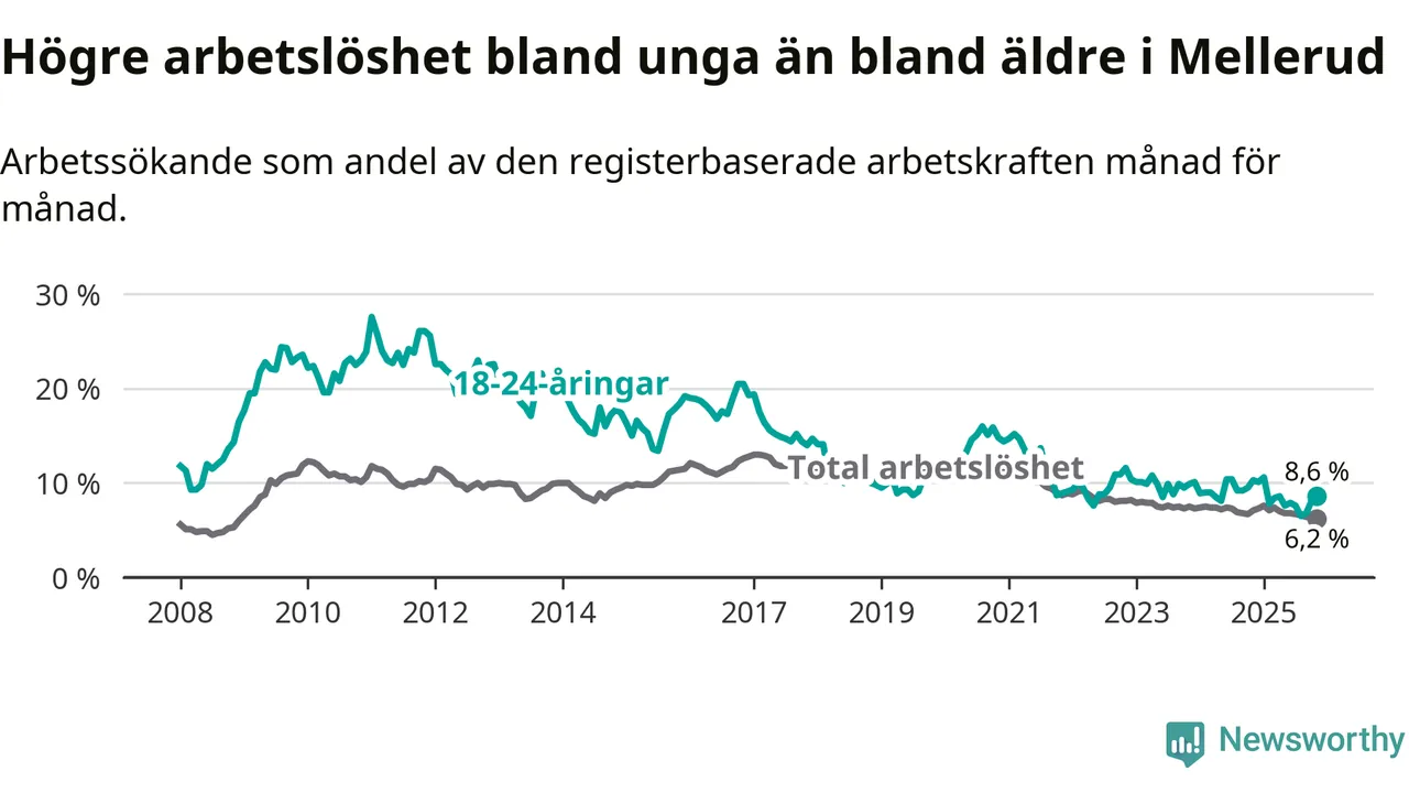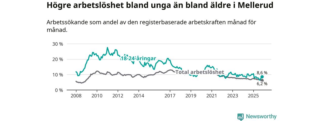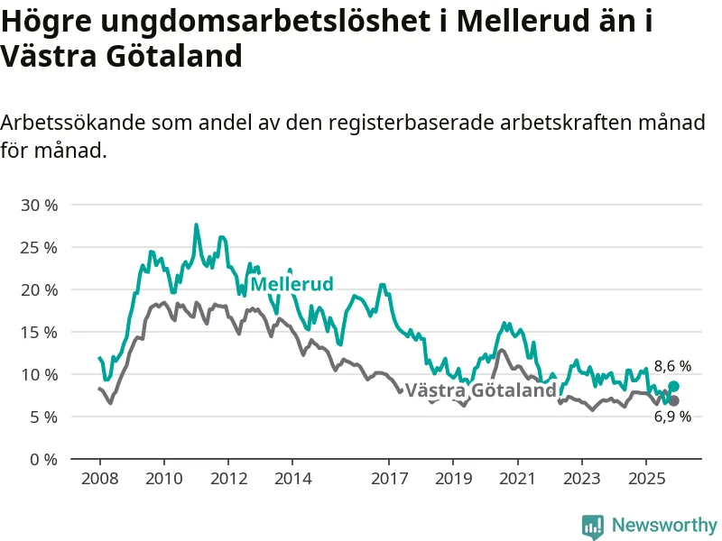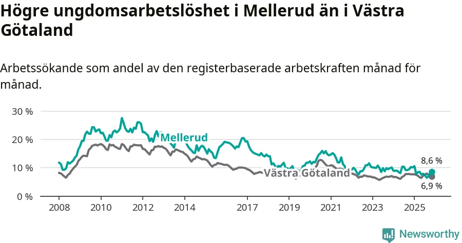 Medan Mellerud har ungefär samma total arbetslöshet som Västra Götaland, ligger ungdomsarbetslösheten 1,7 procentenheter högre i Mellerud.