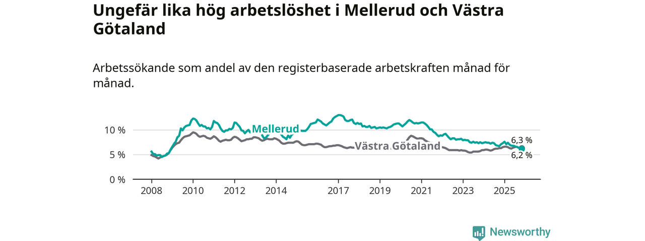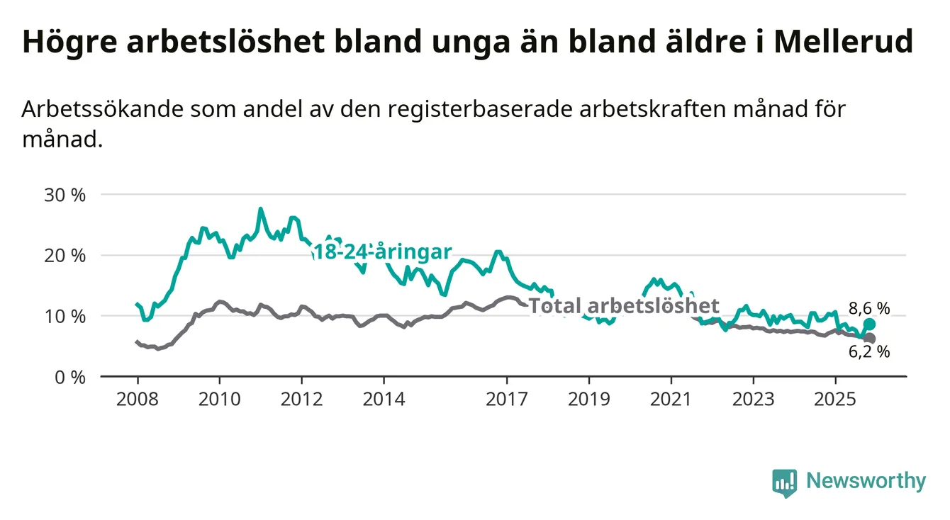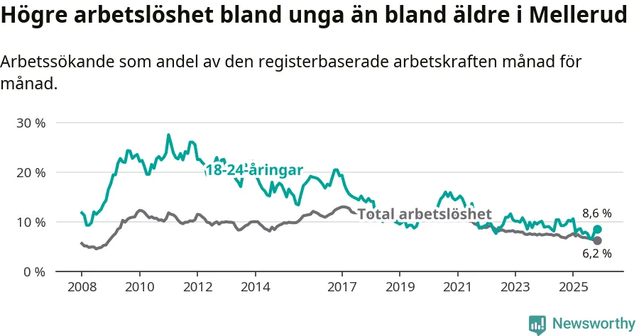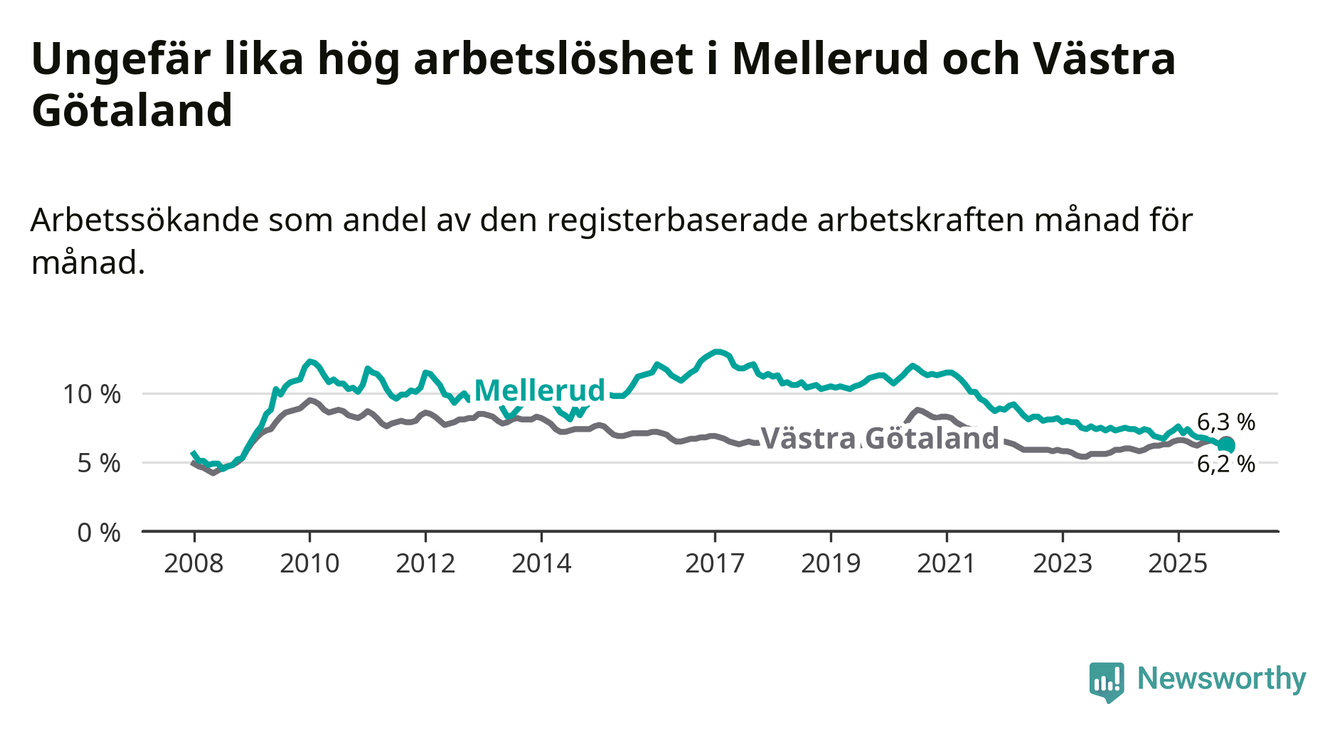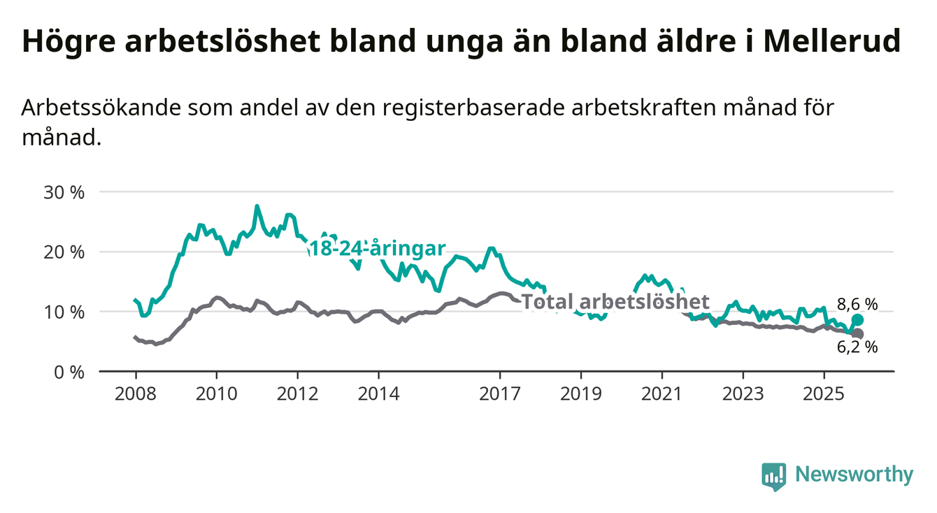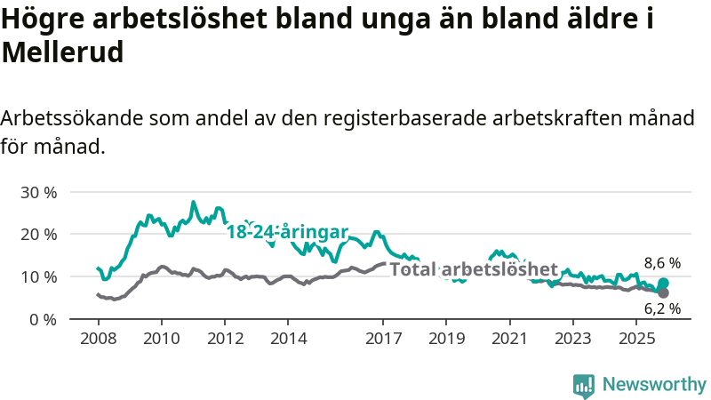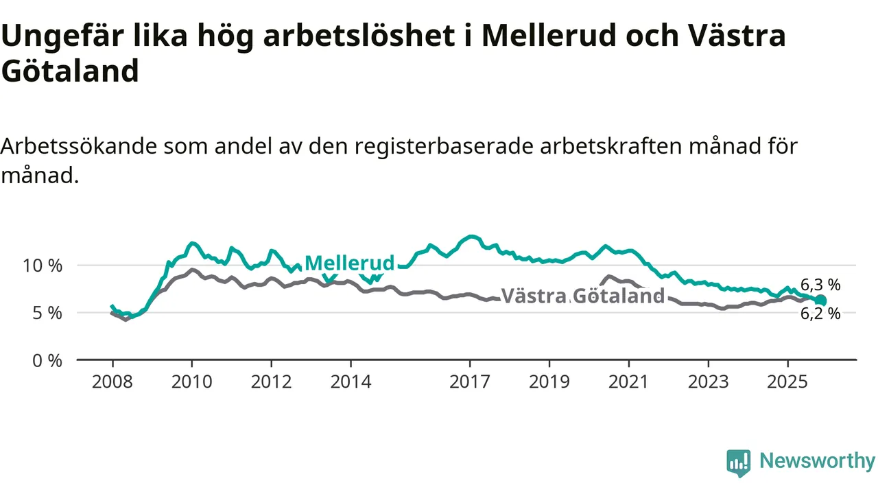 Medan Mellerud har ungefär samma total arbetslöshet som Västra Götaland, ligger ungdomsarbetslösheten 1,7 procentenheter högre i Mellerud.