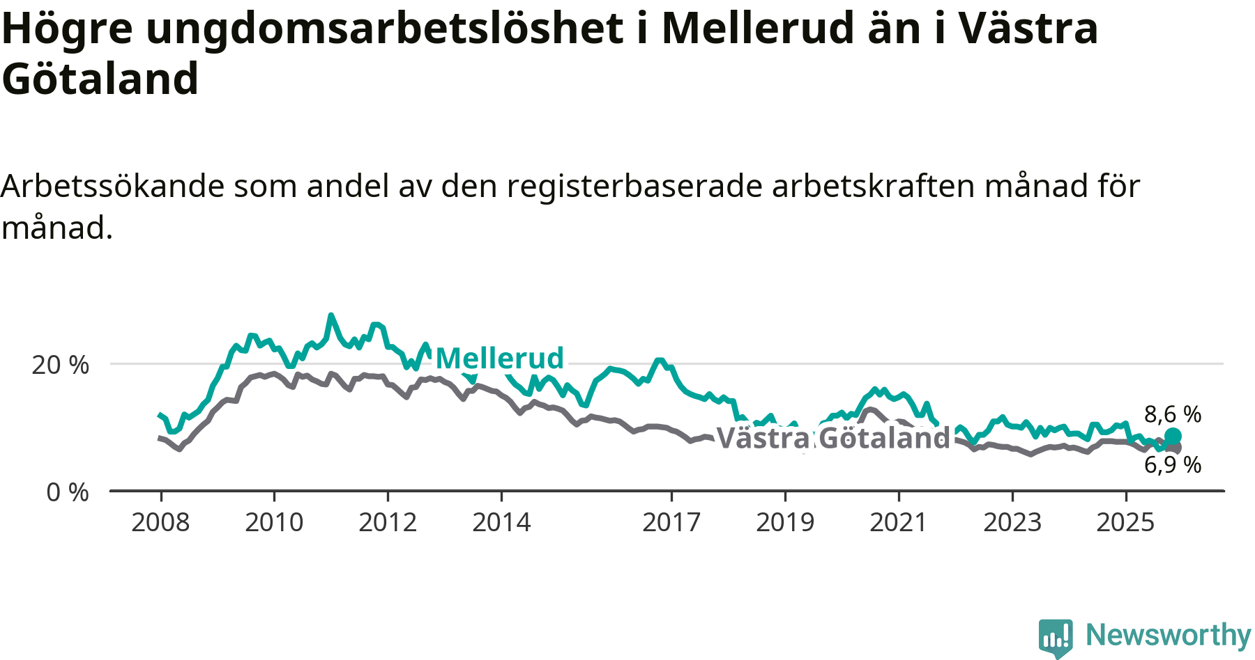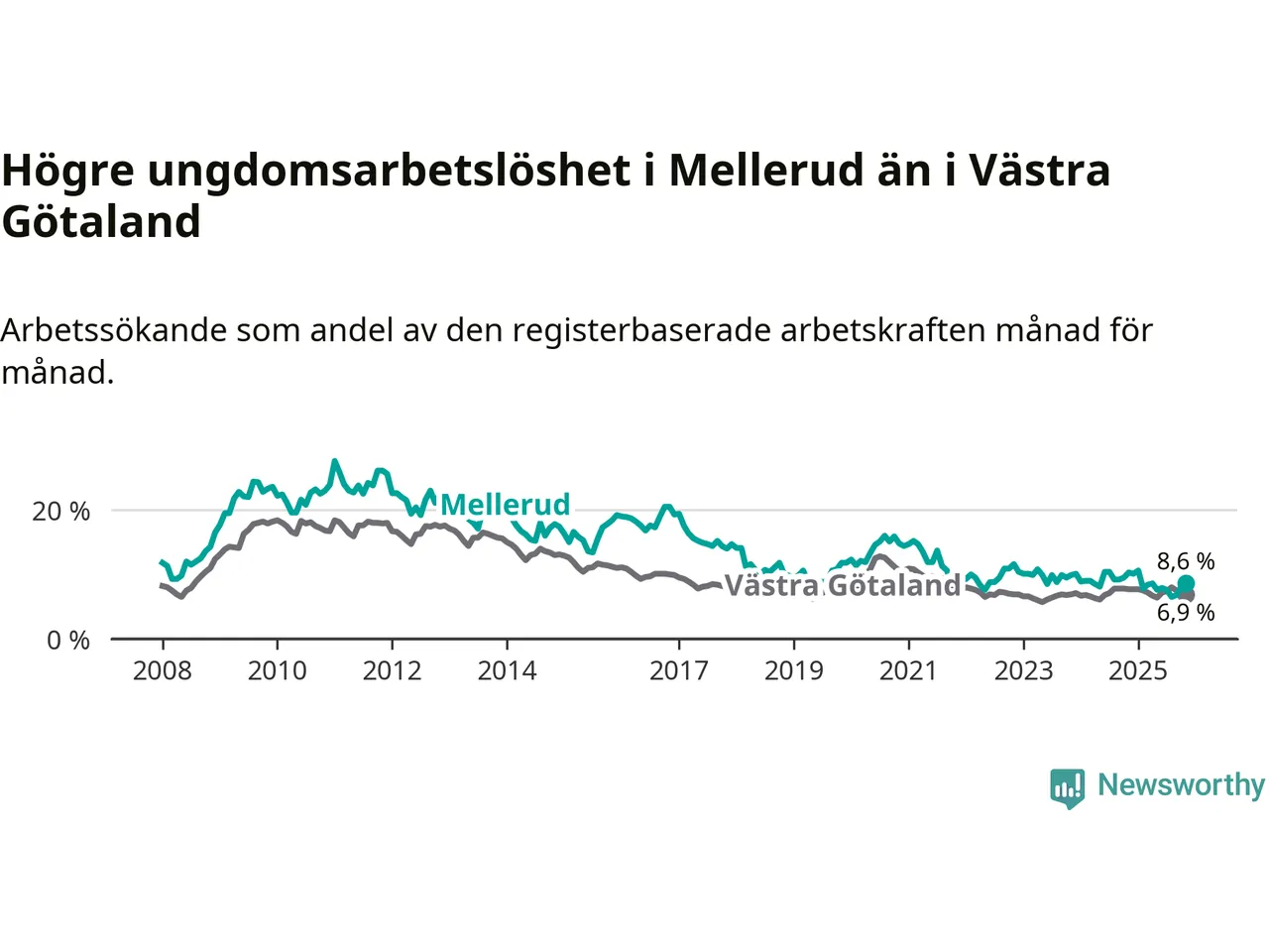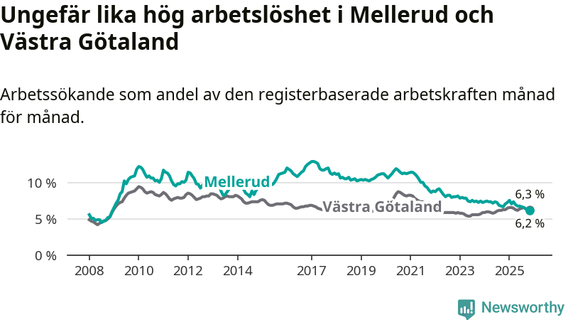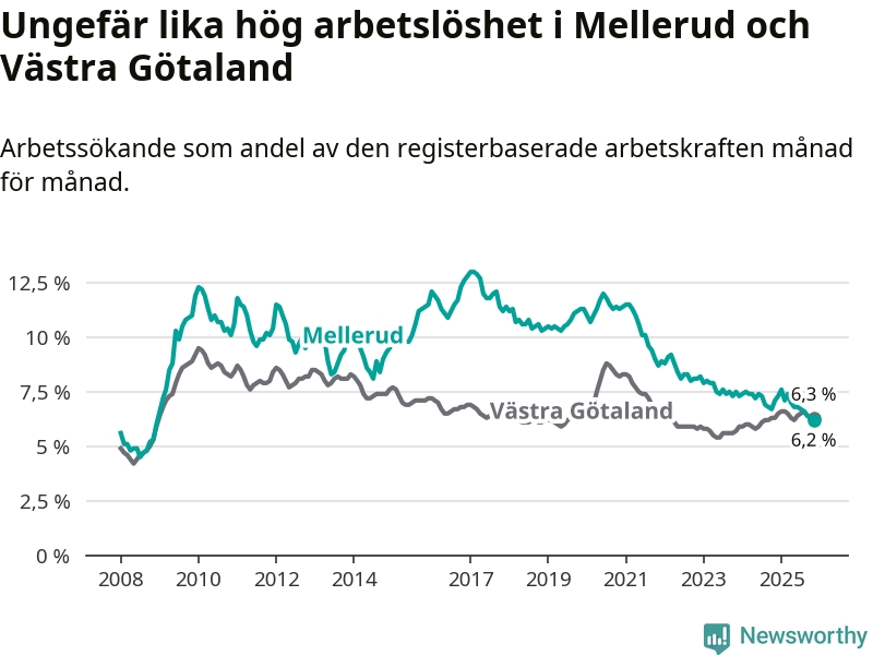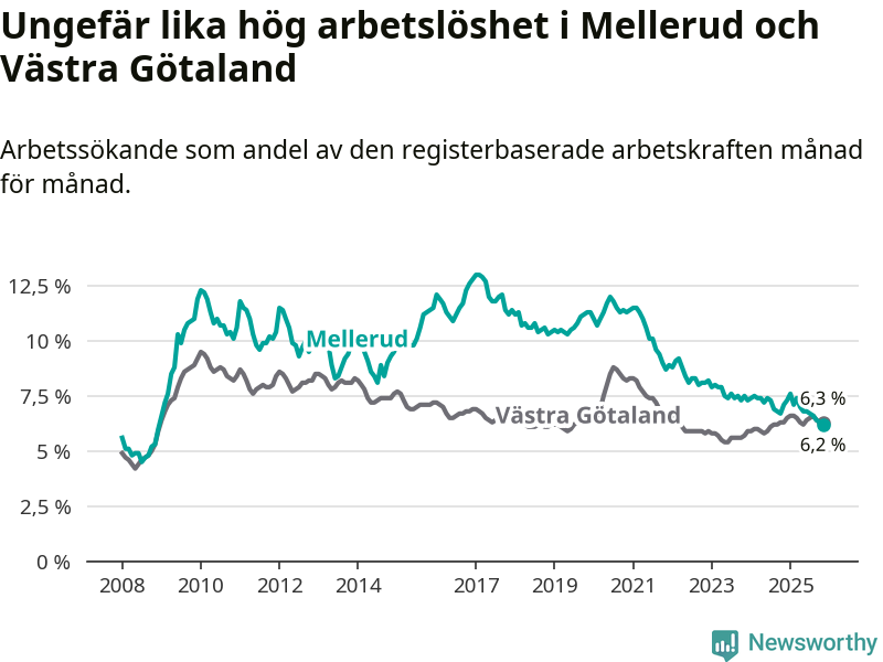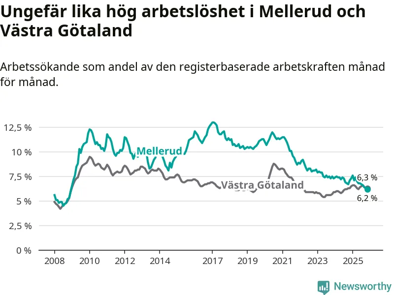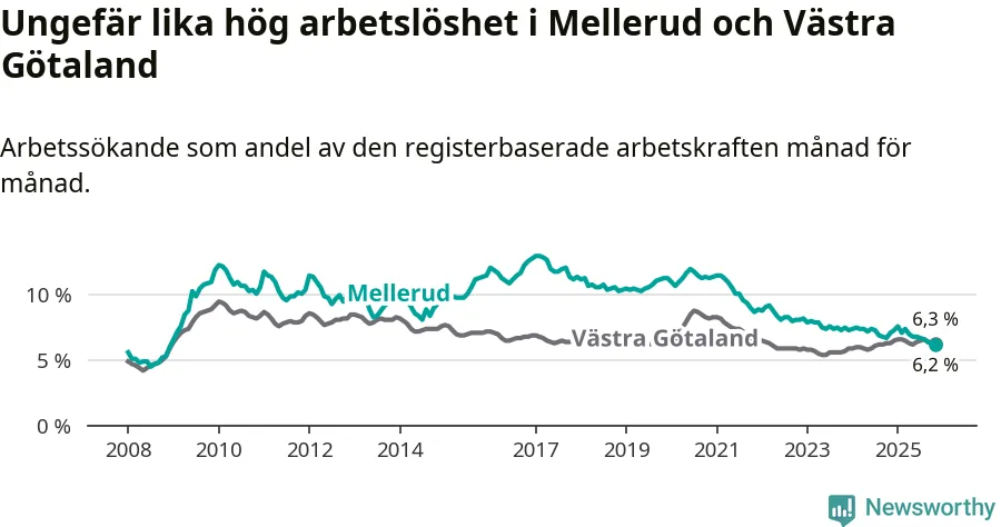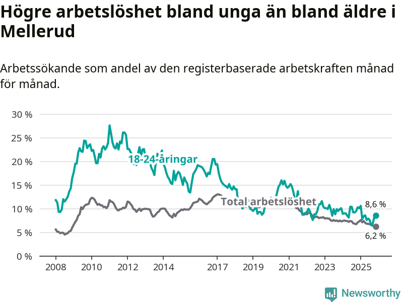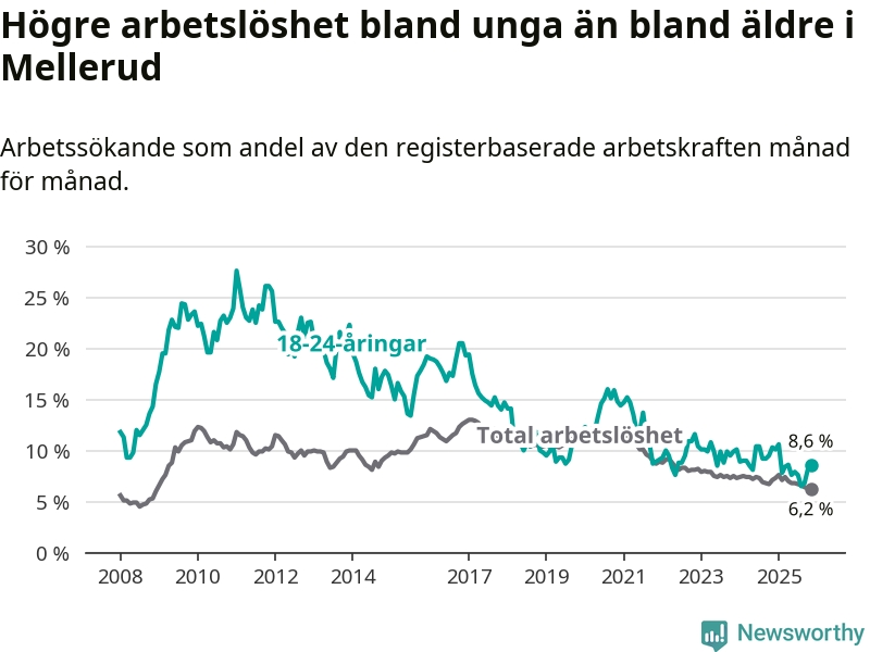 Medan Mellerud har ungefär samma total arbetslöshet som Västra Götaland, ligger ungdomsarbetslösheten 1,7 procentenheter högre i Mellerud.