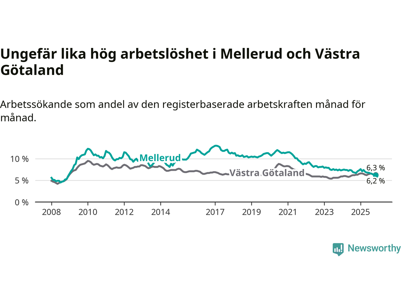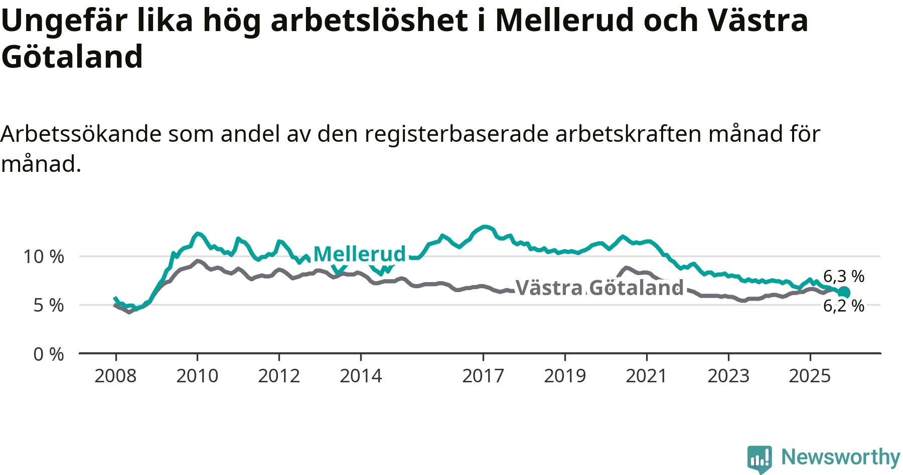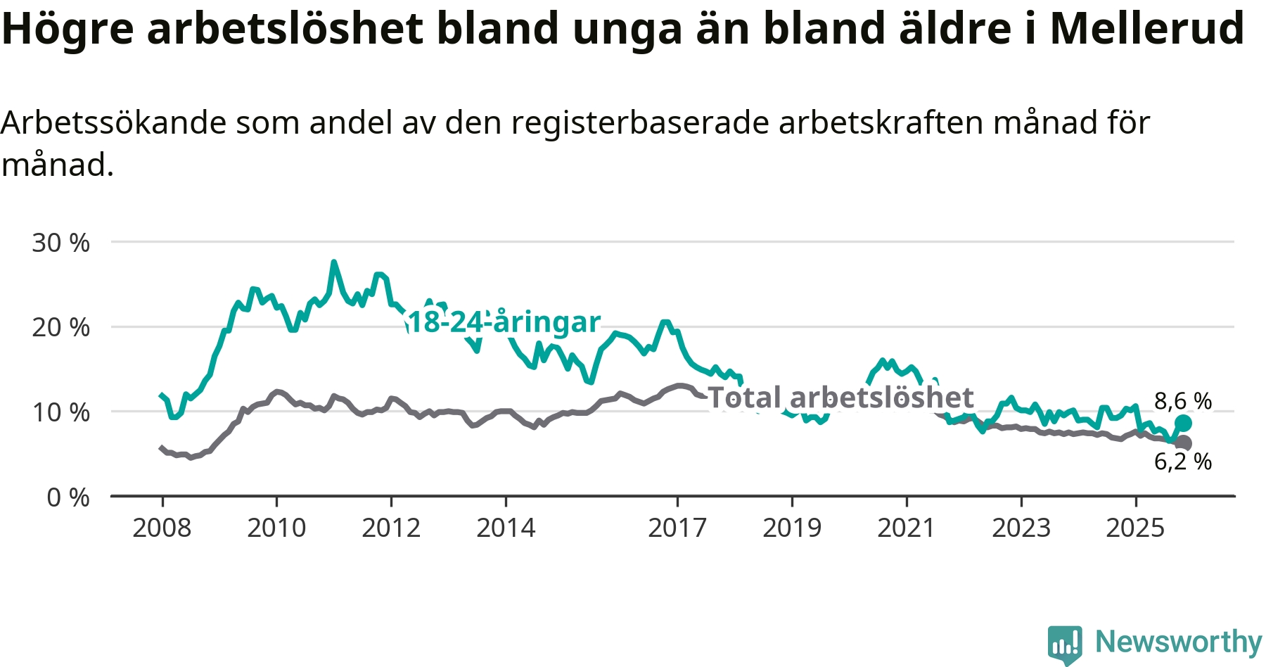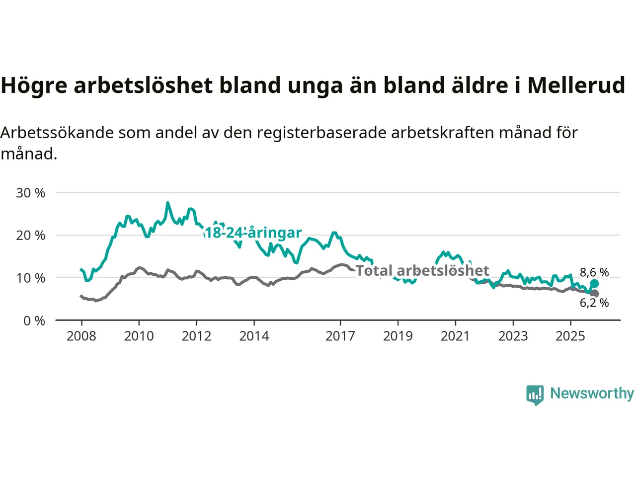 Medan Mellerud har ungefär samma total arbetslöshet som Västra Götaland, ligger ungdomsarbetslösheten 1,7 procentenheter högre i Mellerud.