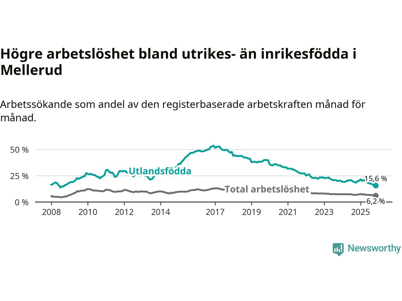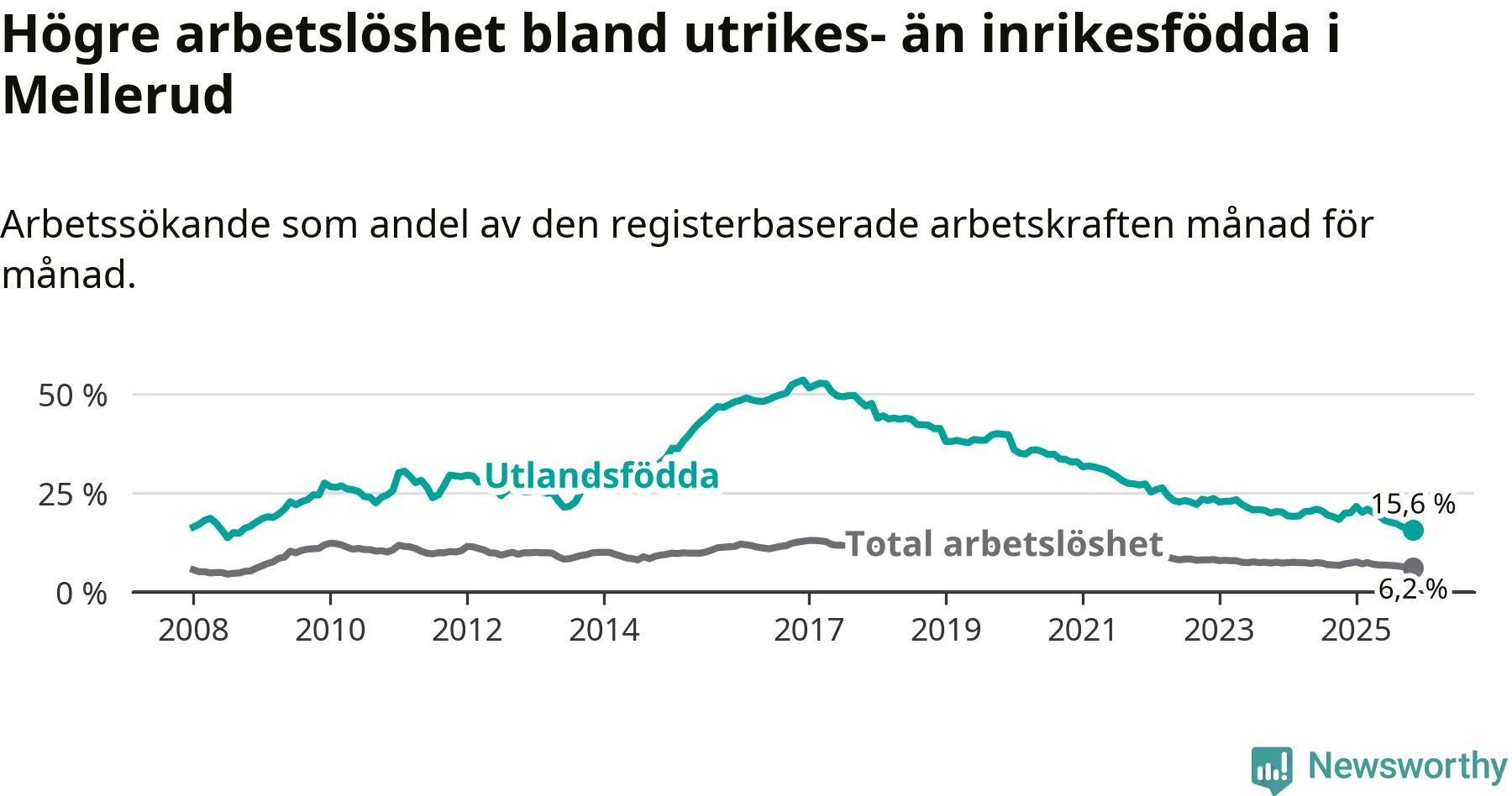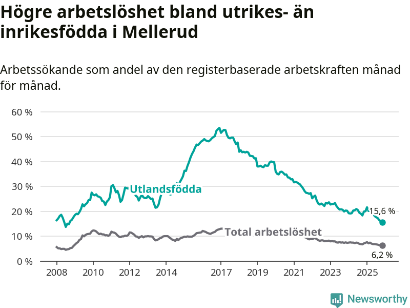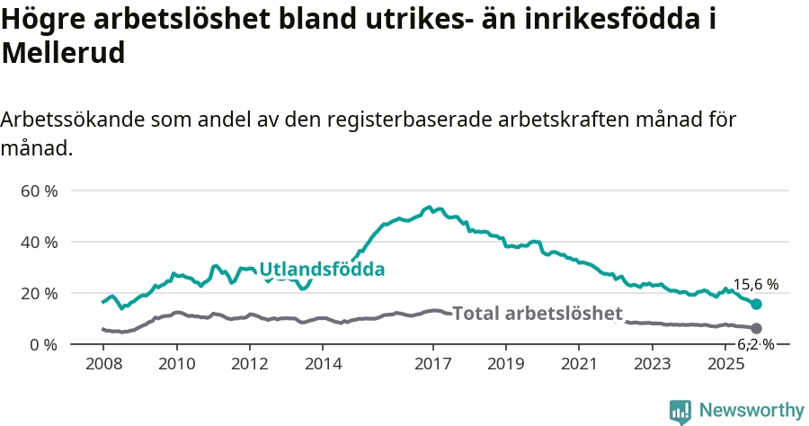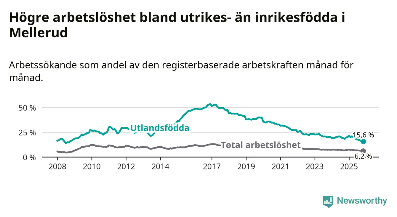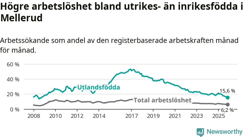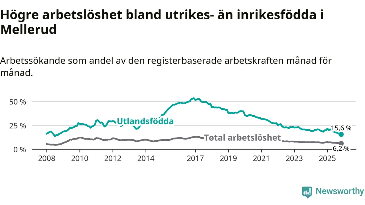 Skillnaden i arbetslöshet mellan utrikesfödda och hela befolkningen är 9,4 procentenheter i Mellerud. Det är en betydligt mindre skillnad än för ett år sedan (−3,4 procentenheter).