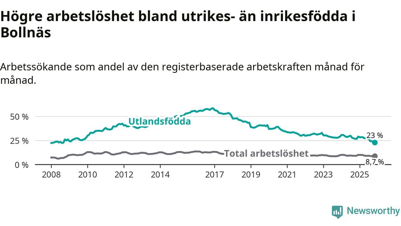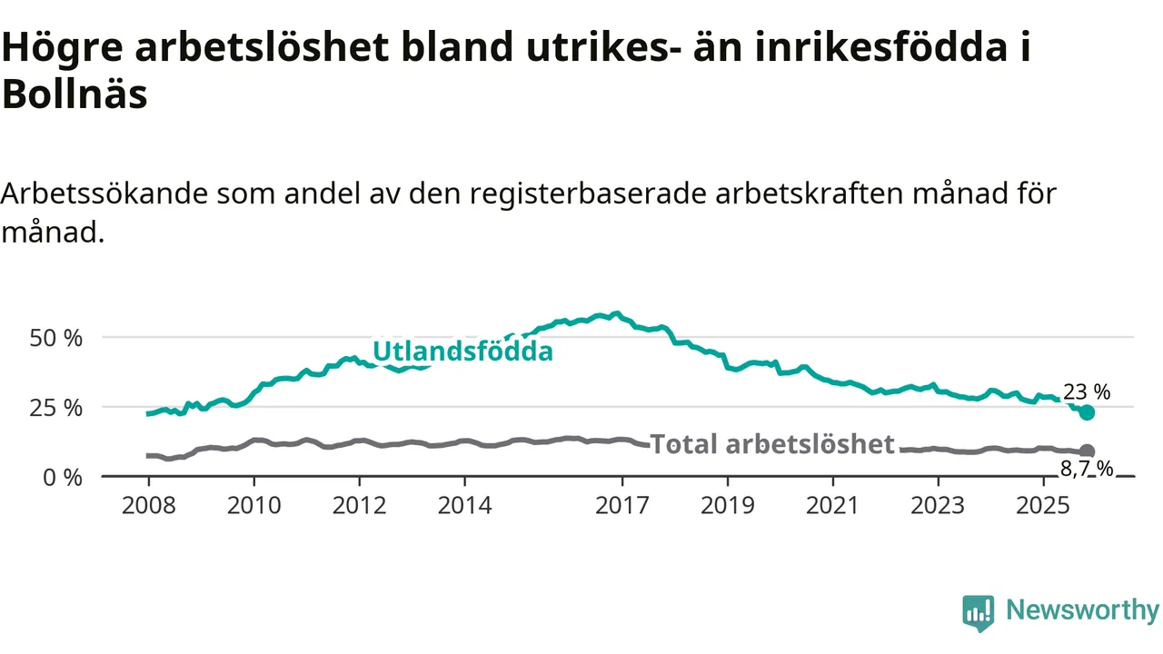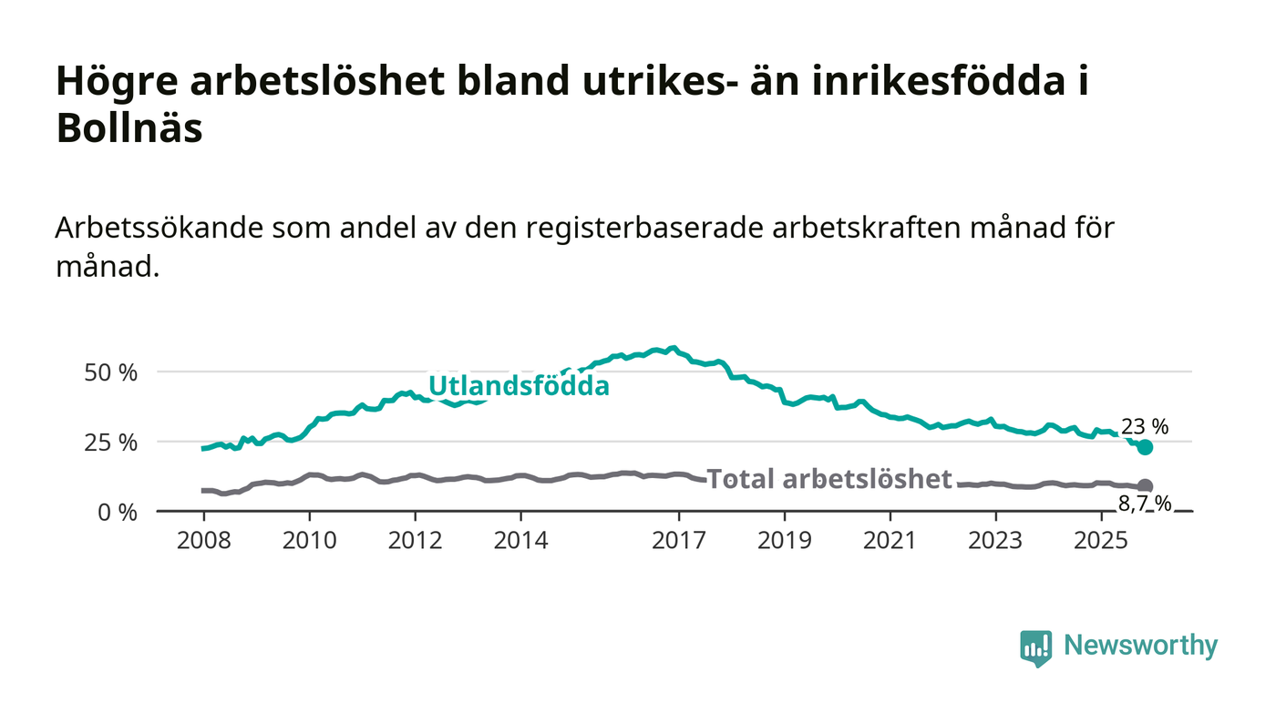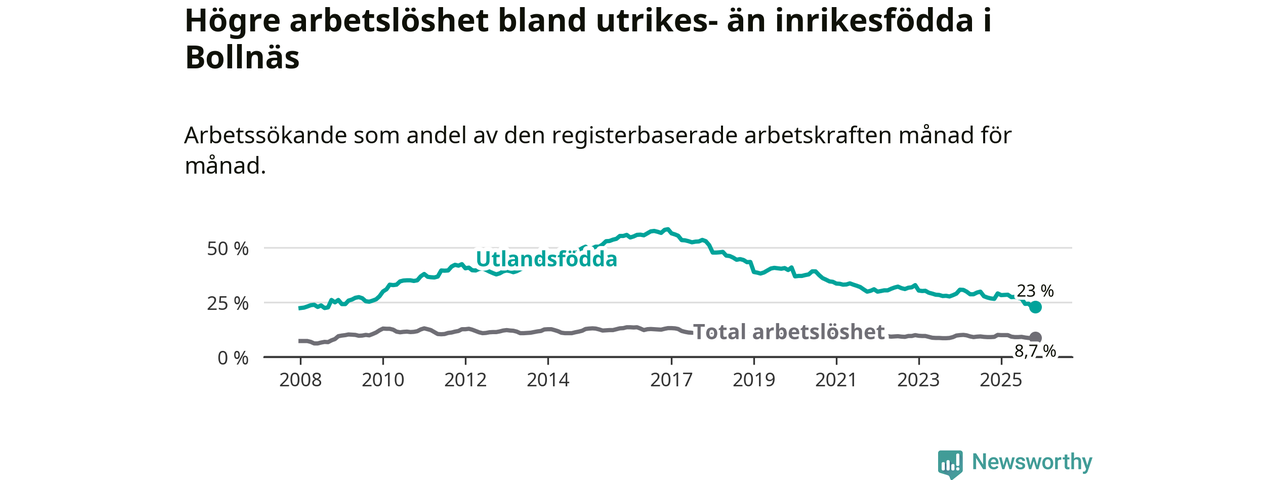 Arbetslösheten bland utlandsfödda var 23,0 procent i Bollnäs under november månad, motsvarande 418 av 1 817 personer. Det är 3,6 procentenheter färre än vid samma tidpunkt i fjol (−68 om man räknar personer). Därmed är de utlandsföddas arbetslöshet lägre än vid samma tidpunkt i fjol för elfte månaden i följd. Sedan december 2024 har arbetslösheten bland utlandsfödda minskat från 29,1 till 23,0 procent.