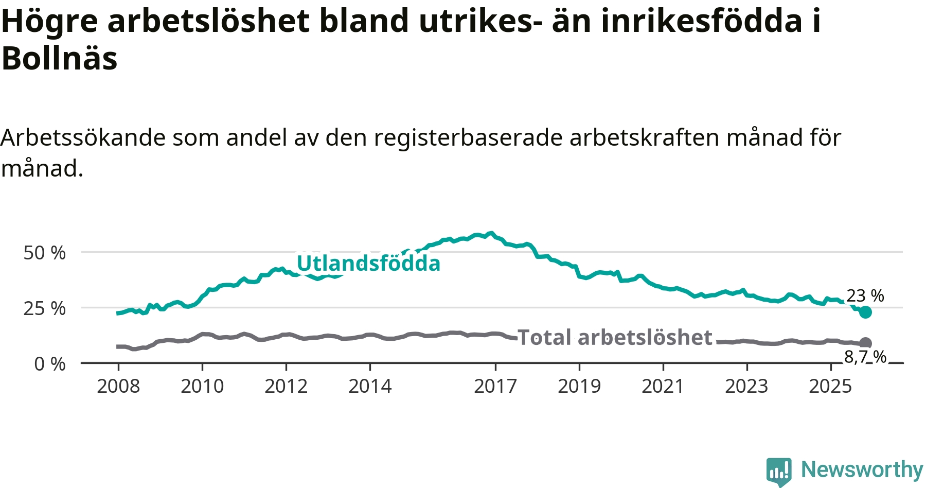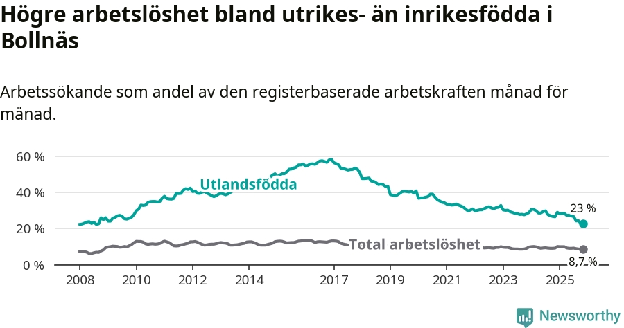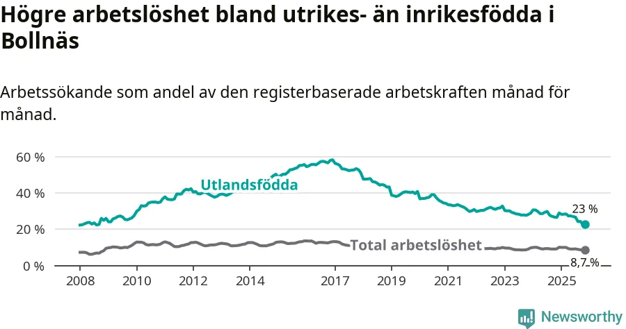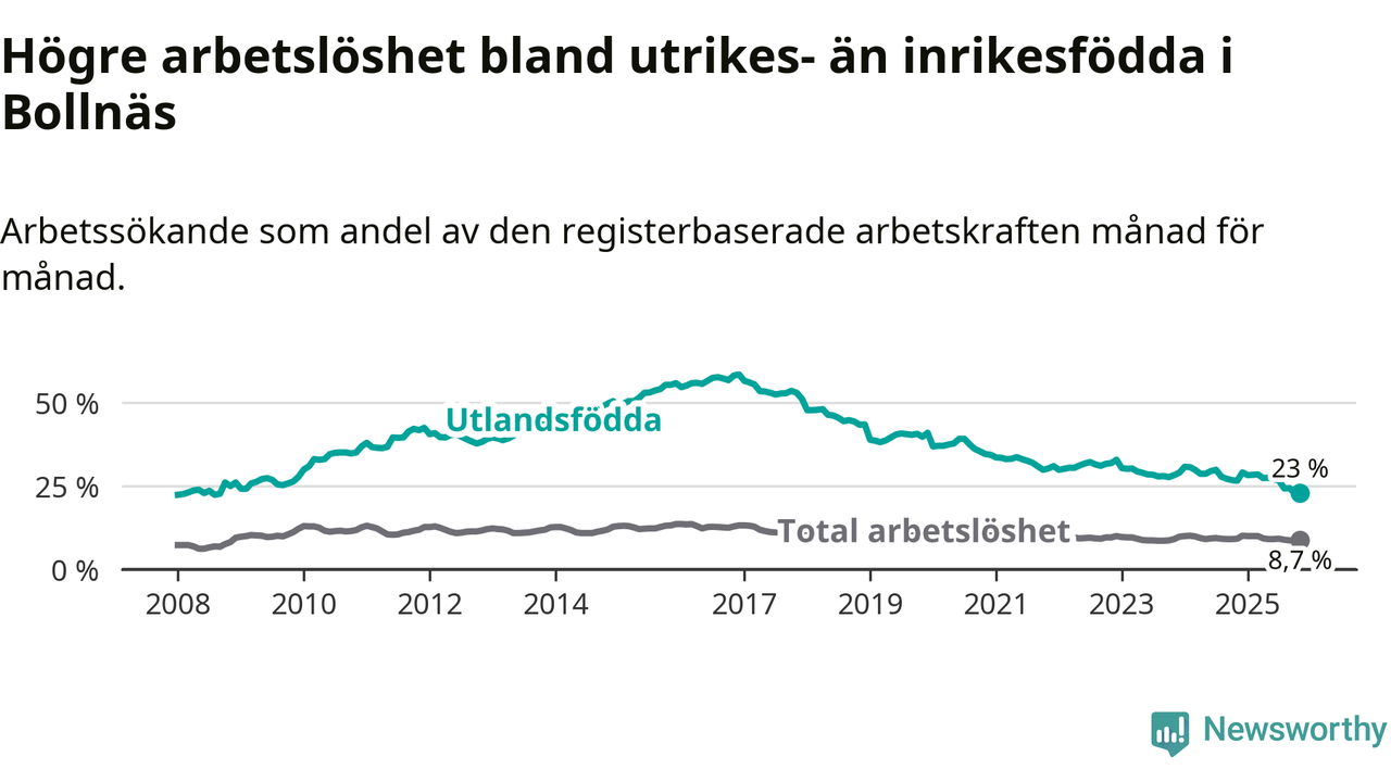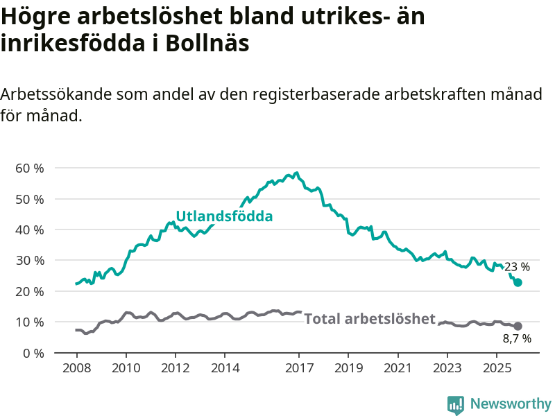 Arbetslösheten bland utlandsfödda var 23,0 procent i Bollnäs under november månad, motsvarande 418 av 1 817 personer. Det är 3,6 procentenheter färre än vid samma tidpunkt i fjol (−68 om man räknar personer). Därmed är de utlandsföddas arbetslöshet lägre än vid samma tidpunkt i fjol för elfte månaden i följd. Sedan december 2024 har arbetslösheten bland utlandsfödda minskat från 29,1 till 23,0 procent.