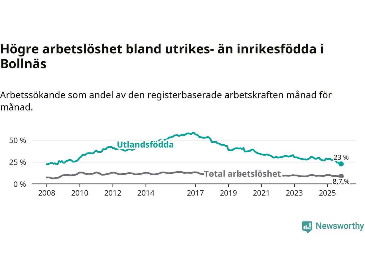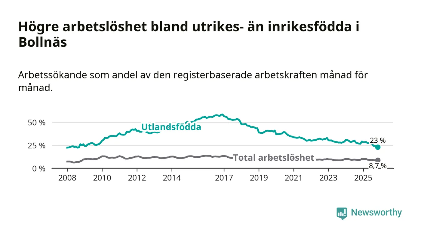 Skillnaden i arbetslöshet mellan utrikesfödda och hela befolkningen är 14,3 procentenheter i Bollnäs. Det är en betydligt mindre skillnad än för ett år sedan (−3,1 procentenheter).