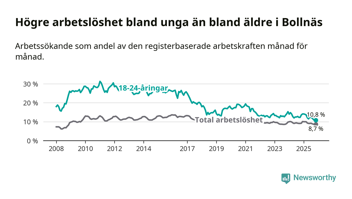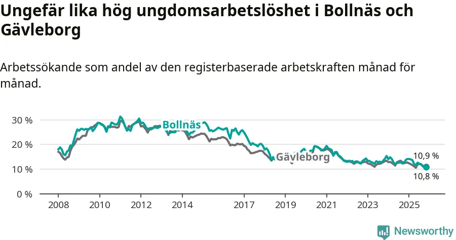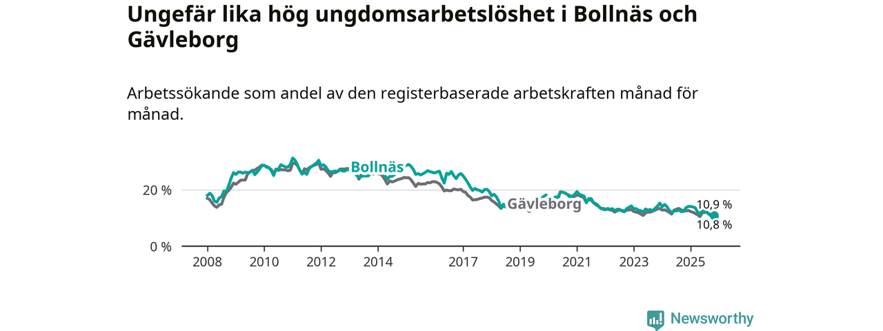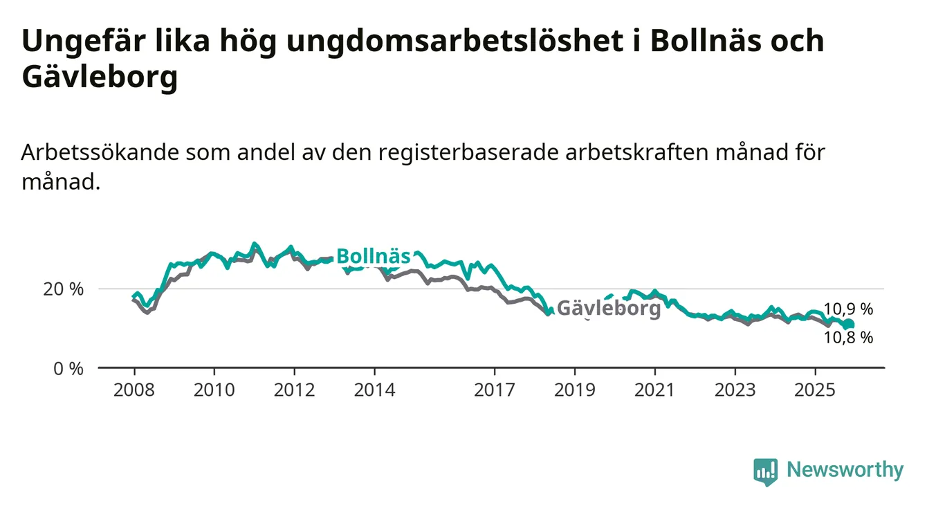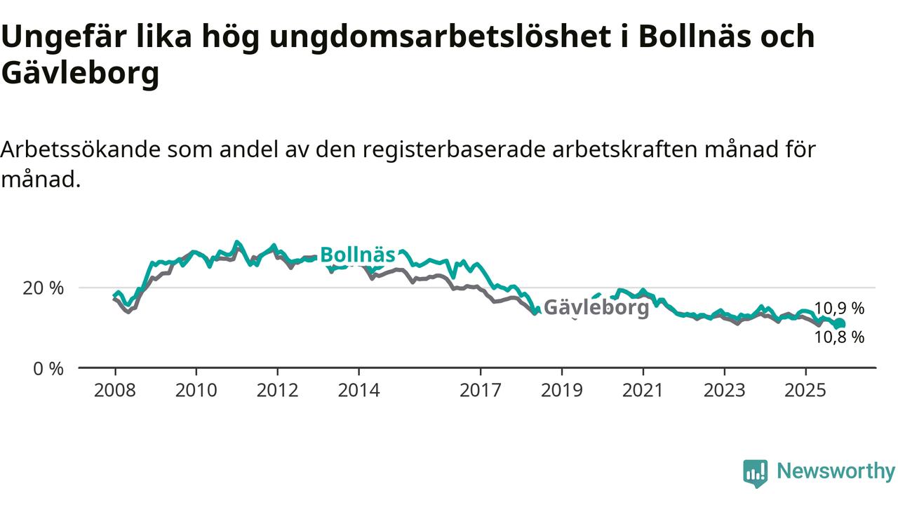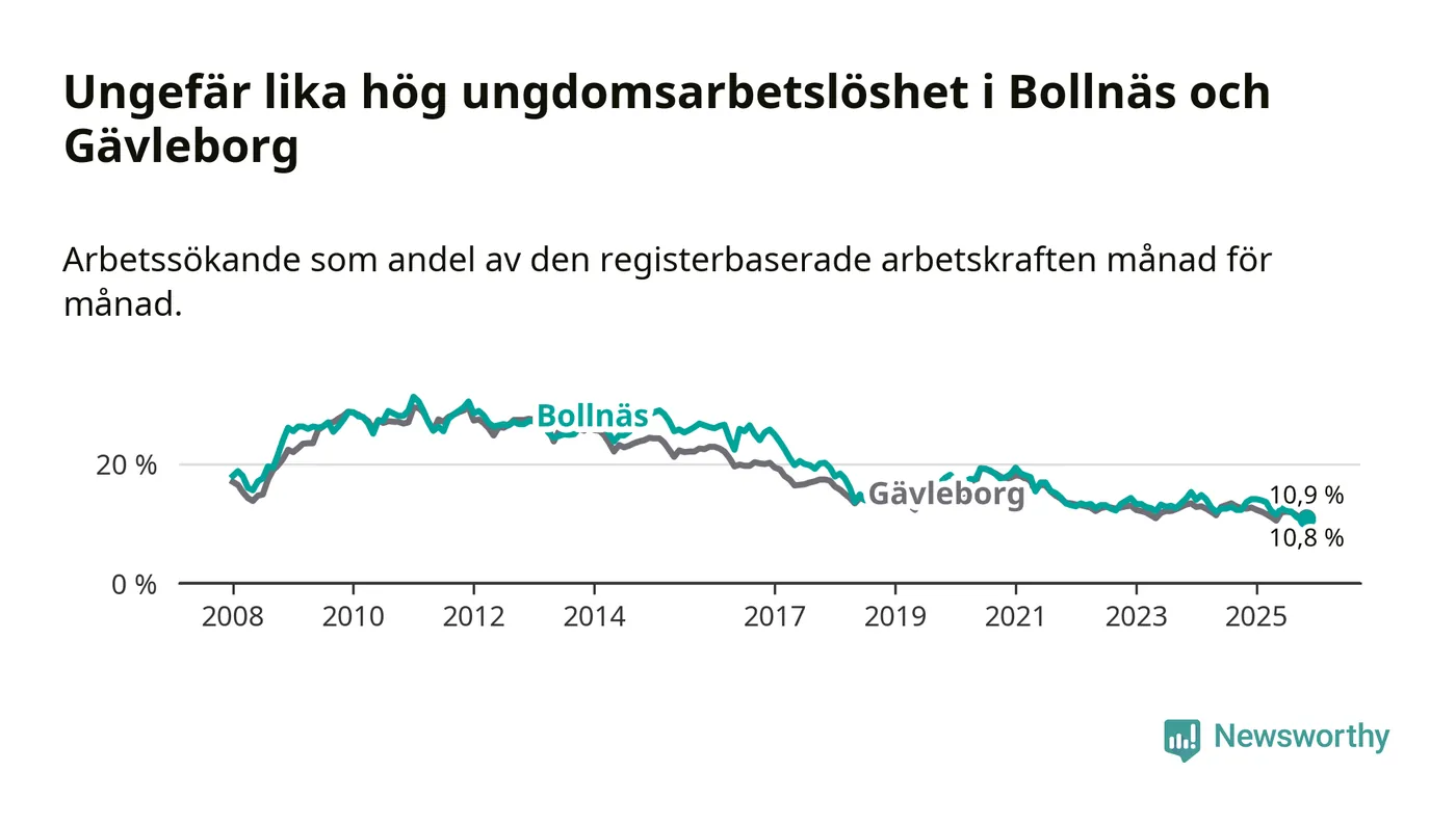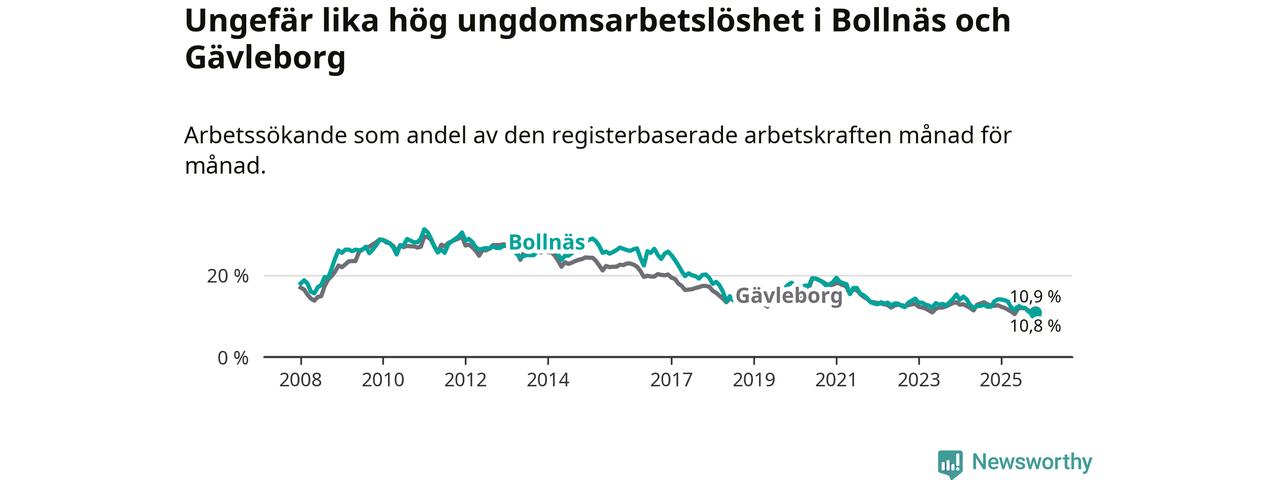 Medan Bollnäs har högre total arbetslöshet än Gävleborg, ligger ungdomsarbetslösheten på i stort sett samma nivå.