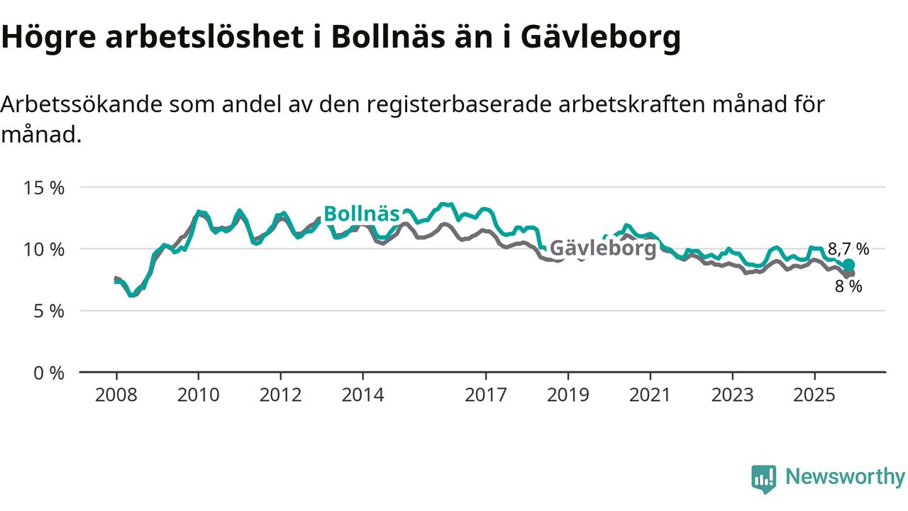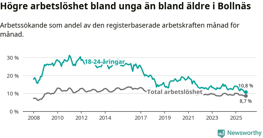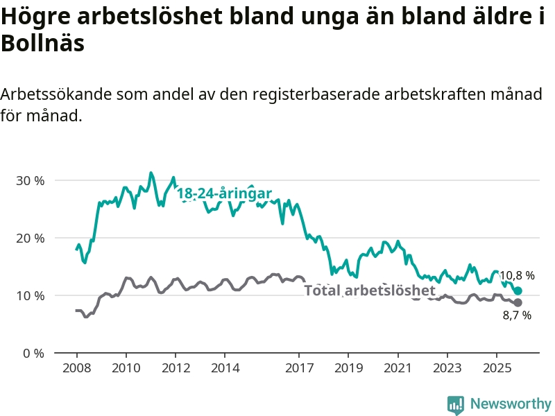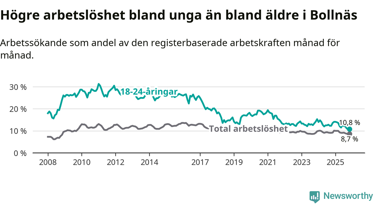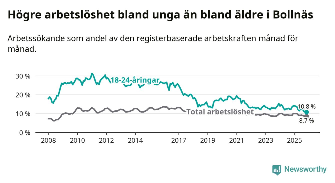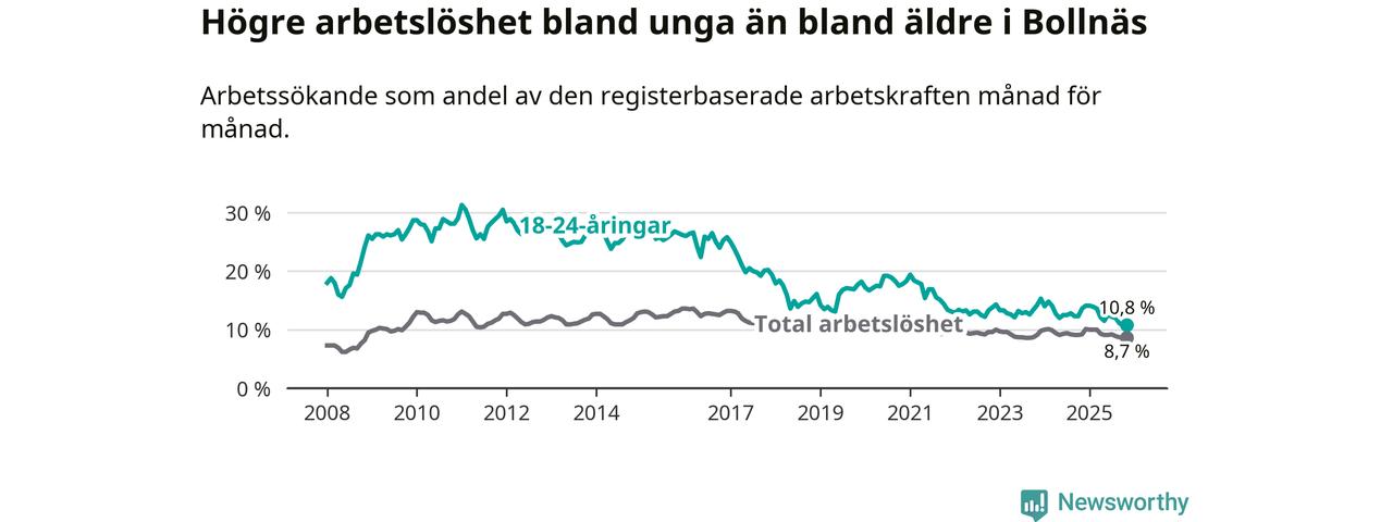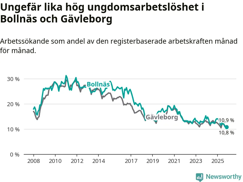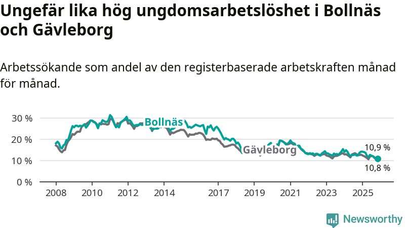 Medan Bollnäs har högre total arbetslöshet än Gävleborg, ligger ungdomsarbetslösheten på i stort sett samma nivå.