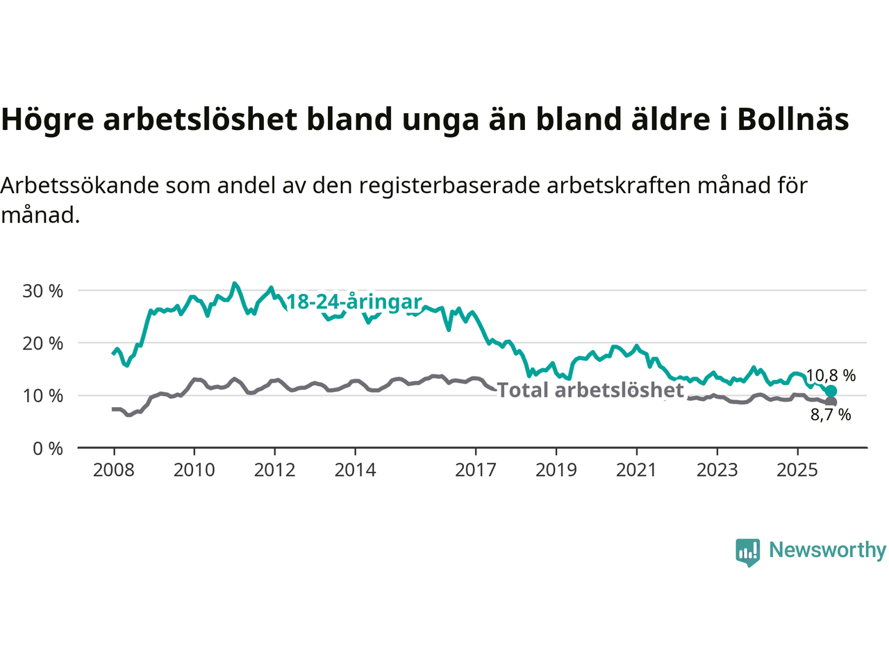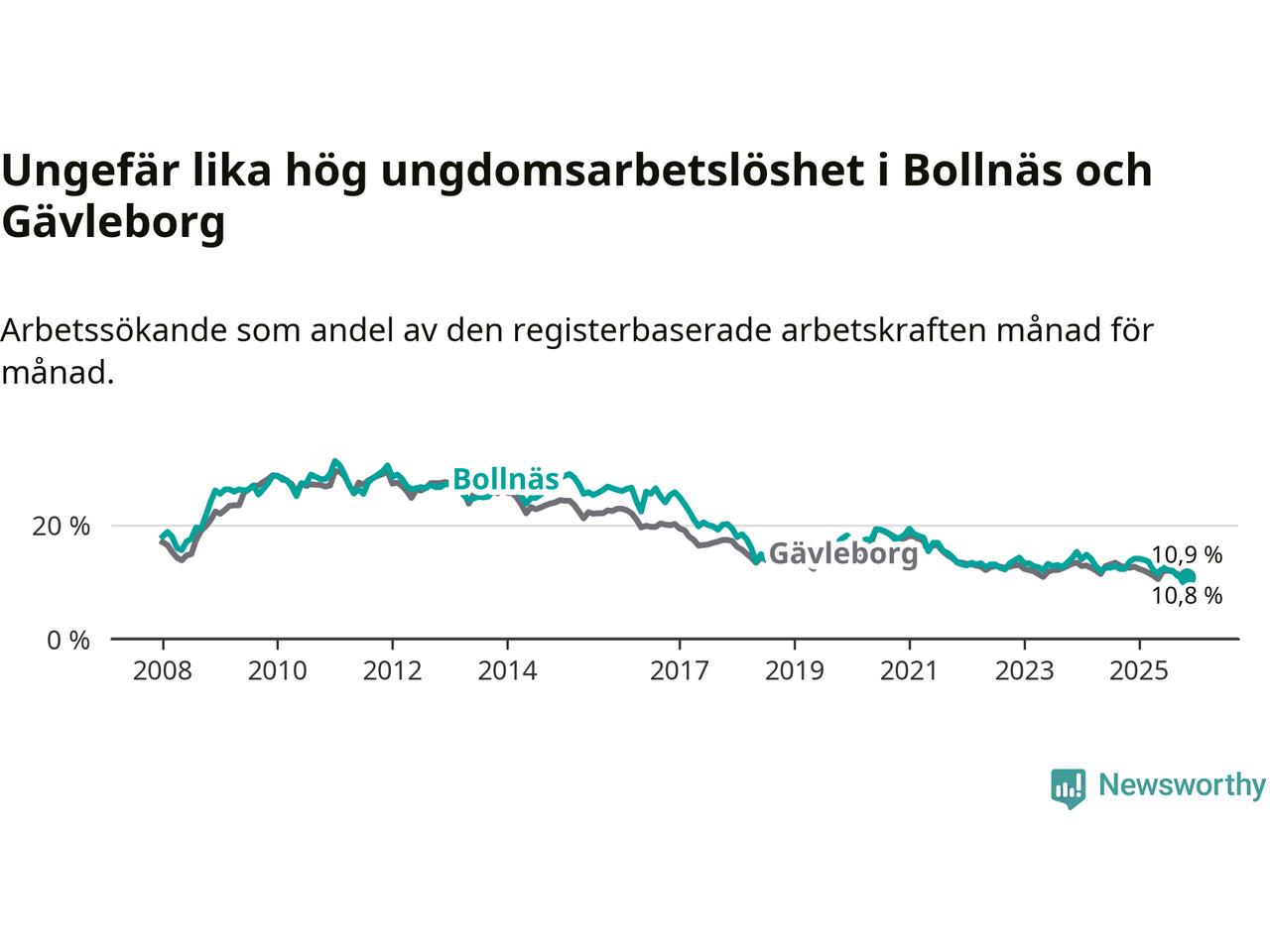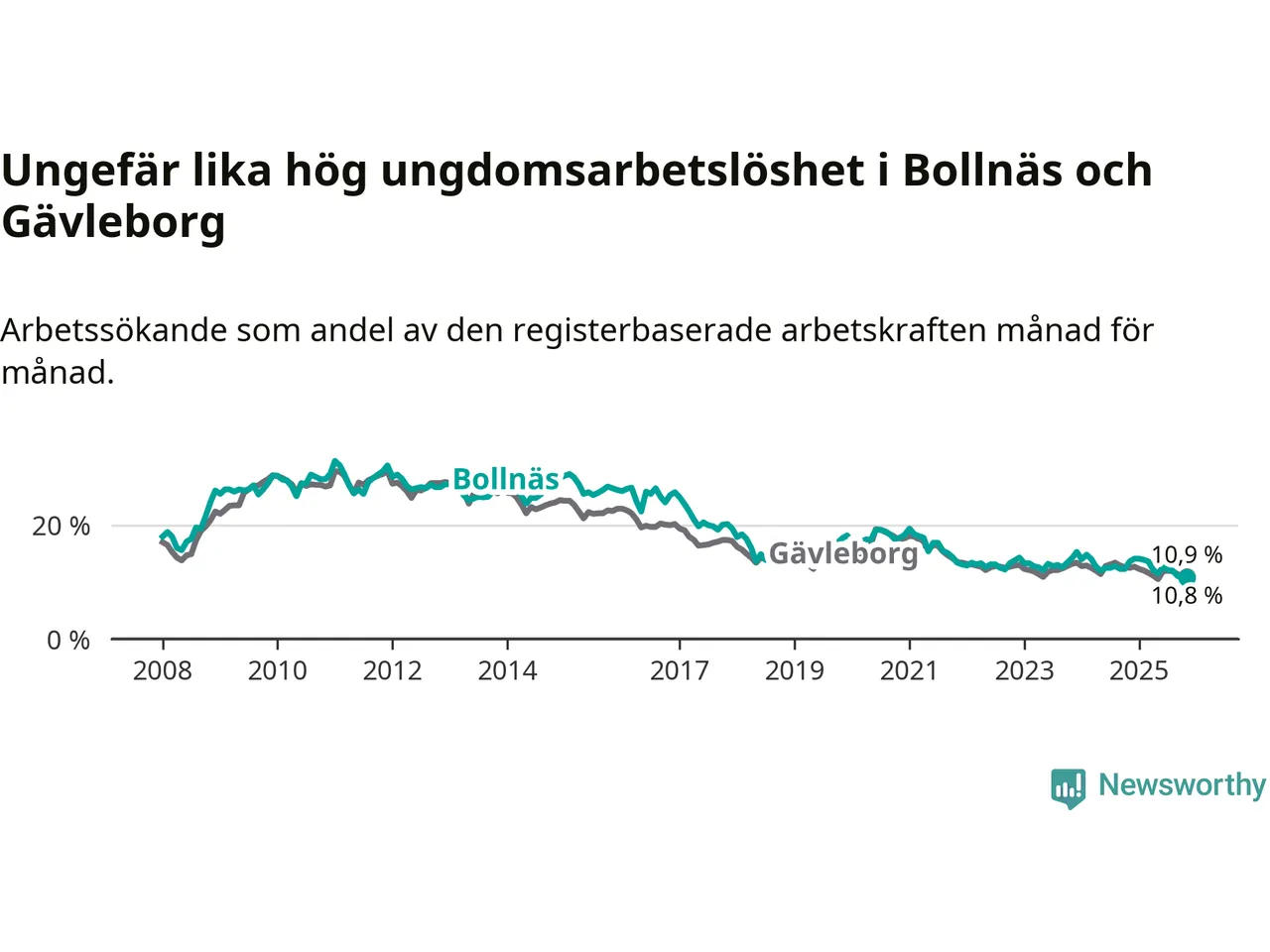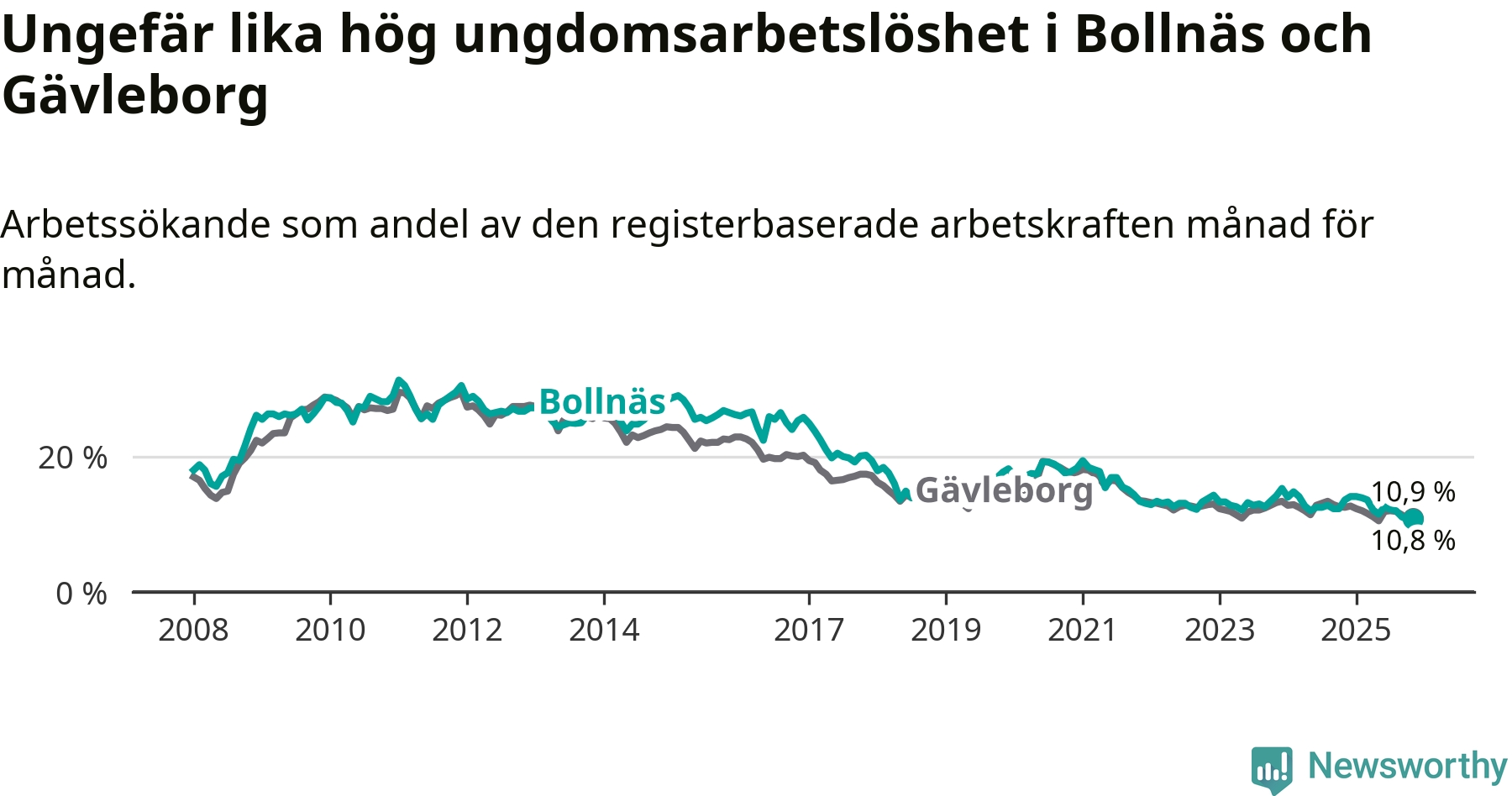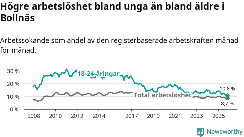 Medan Bollnäs har högre total arbetslöshet än Gävleborg, ligger ungdomsarbetslösheten på i stort sett samma nivå.