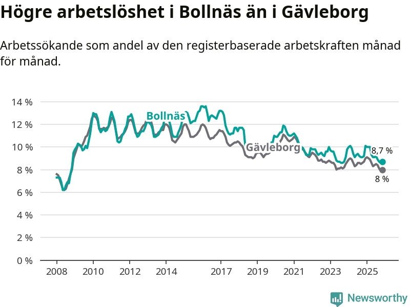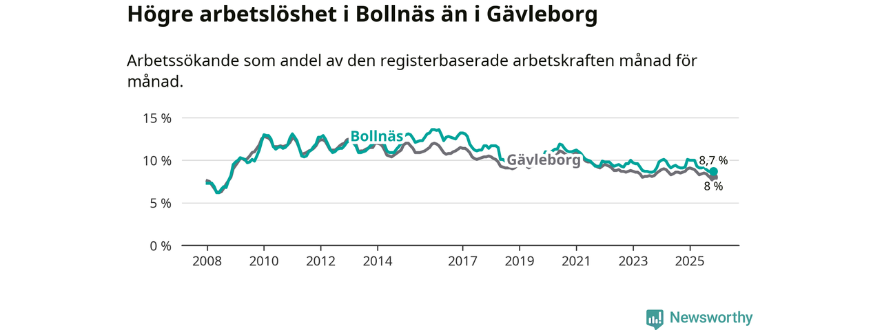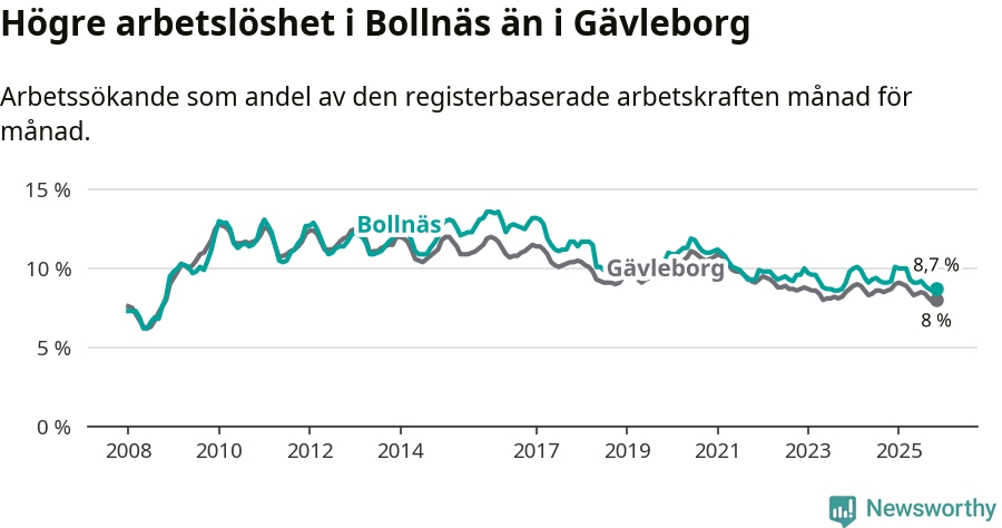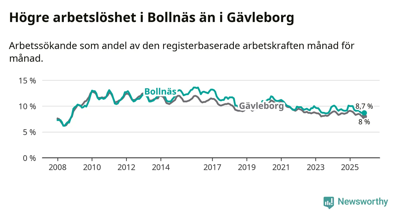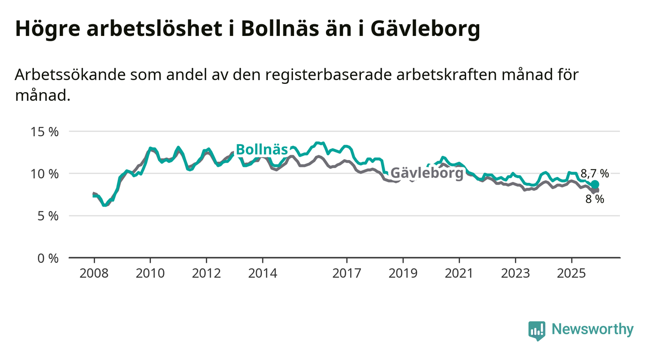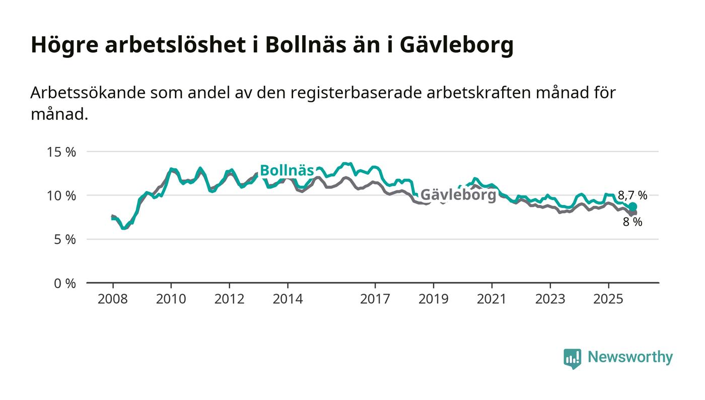 Under november månad rapporterade Bollnäs kommun en total arbetslöshet på 8,7 procent. Det är en minskning jämfört med samma tidpunkt i fjol (−0,5 procentenheter). Även i Gävleborgs län sjunker arbetslösheten .