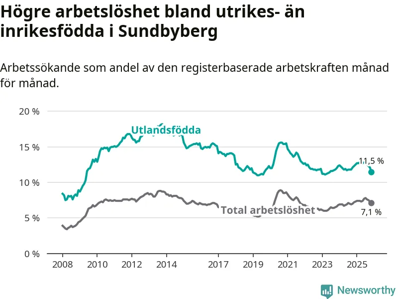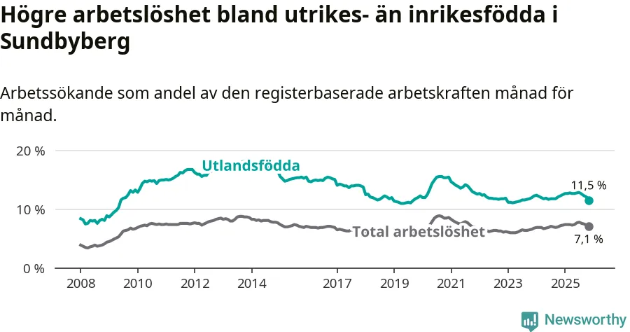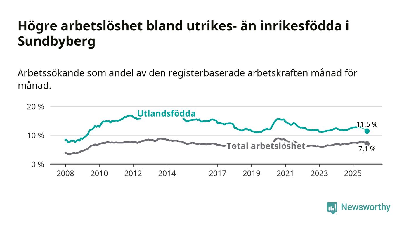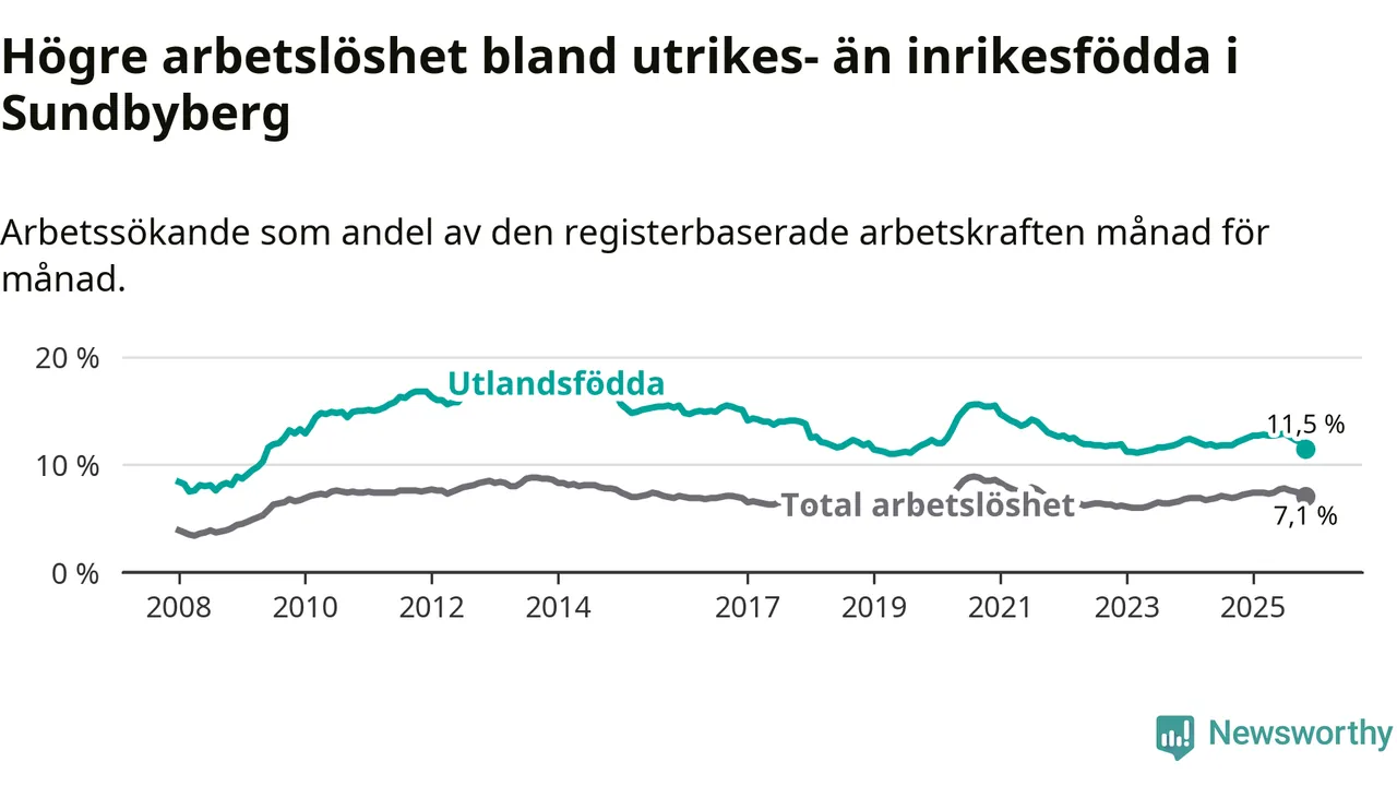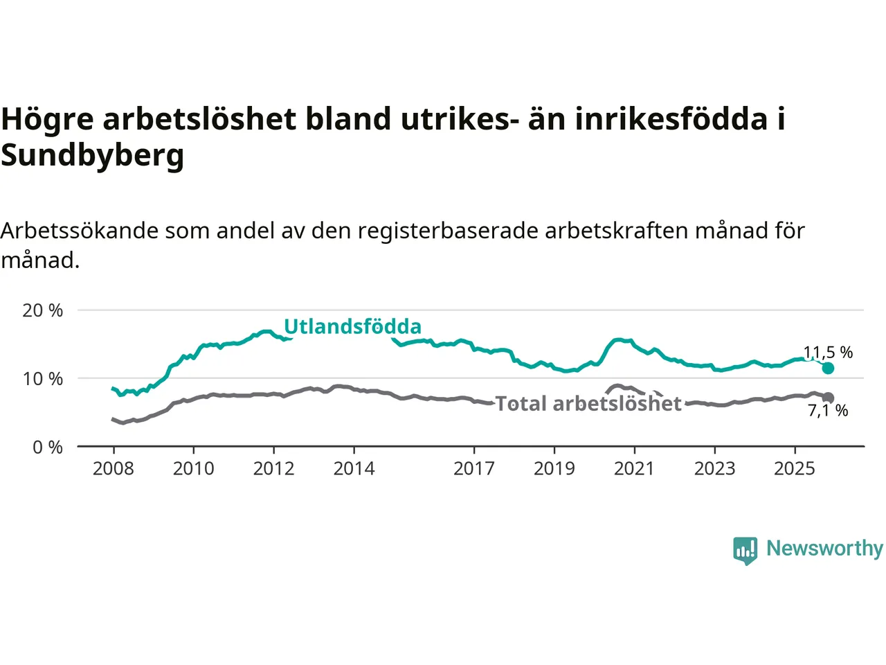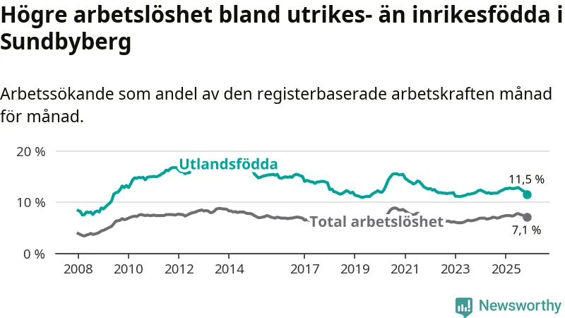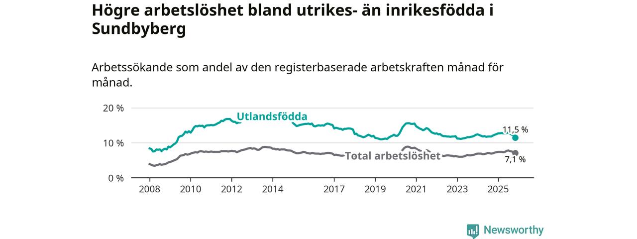 Arbetslösheten bland utlandsfödda var 11,5 procent i Sundbyberg under november månad, motsvarande 1 466 av 12 748 personer. Det är 0,8 procentenheter färre än vid samma tidpunkt i fjol (−66 om man räknar personer). Den senaste månadens nedgång innebär ett trendbrott. Under de ett föregående månaderna hade arbetslösheten bland utlandsfödda varit högre än motsvarande tidpunkt året innan.