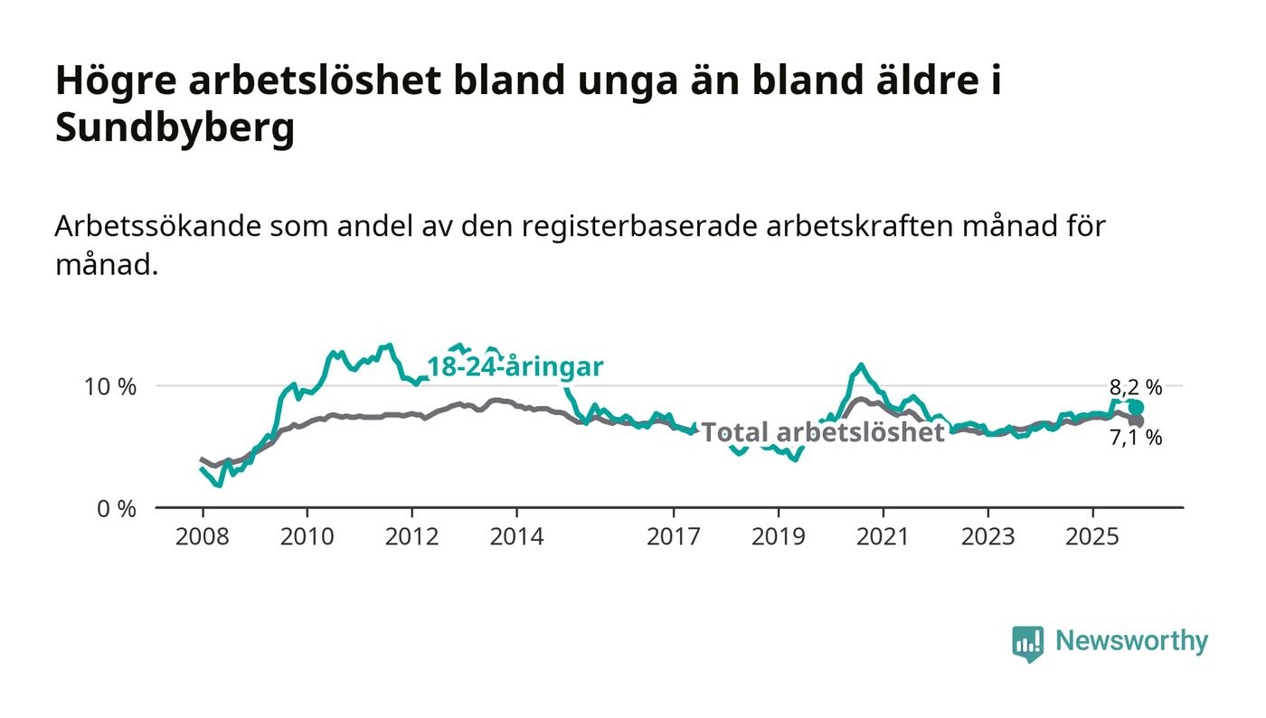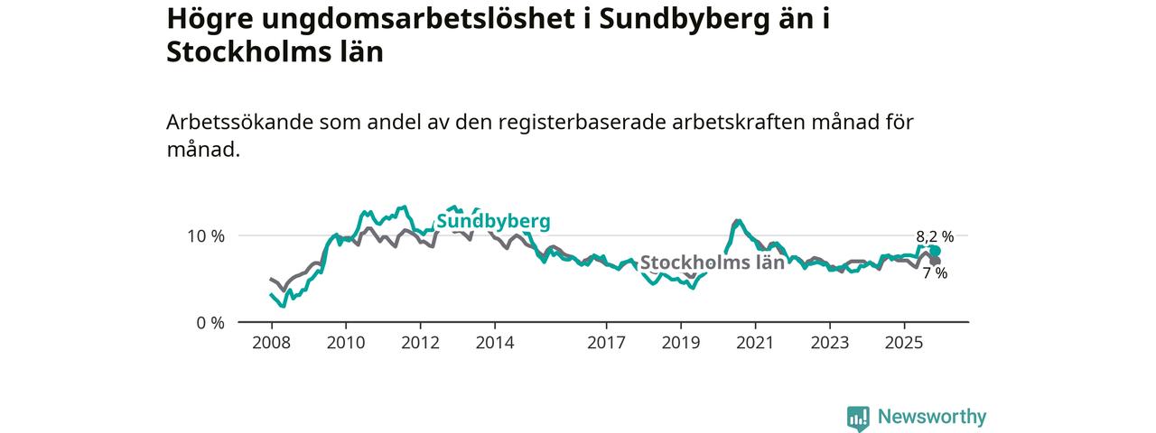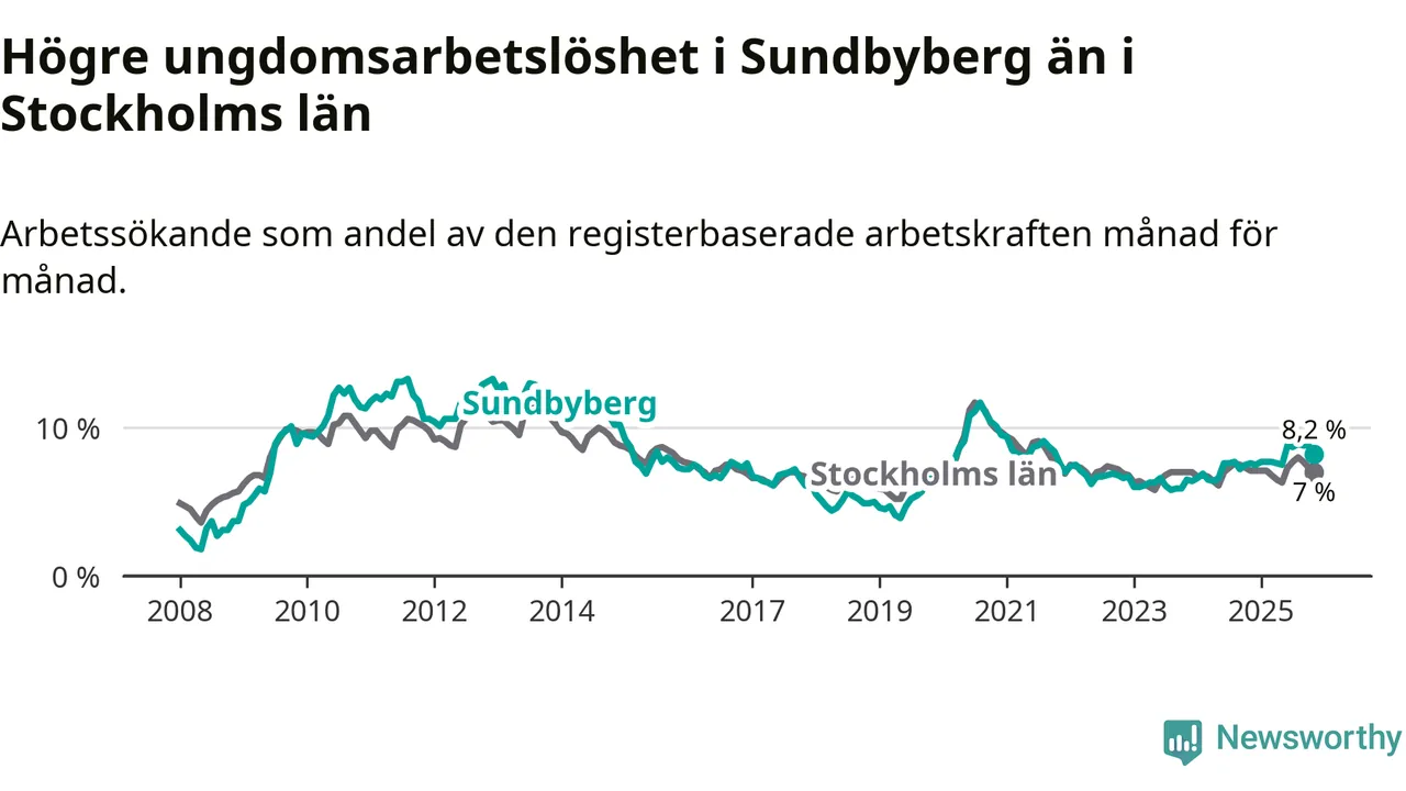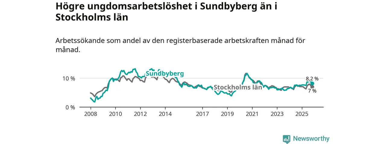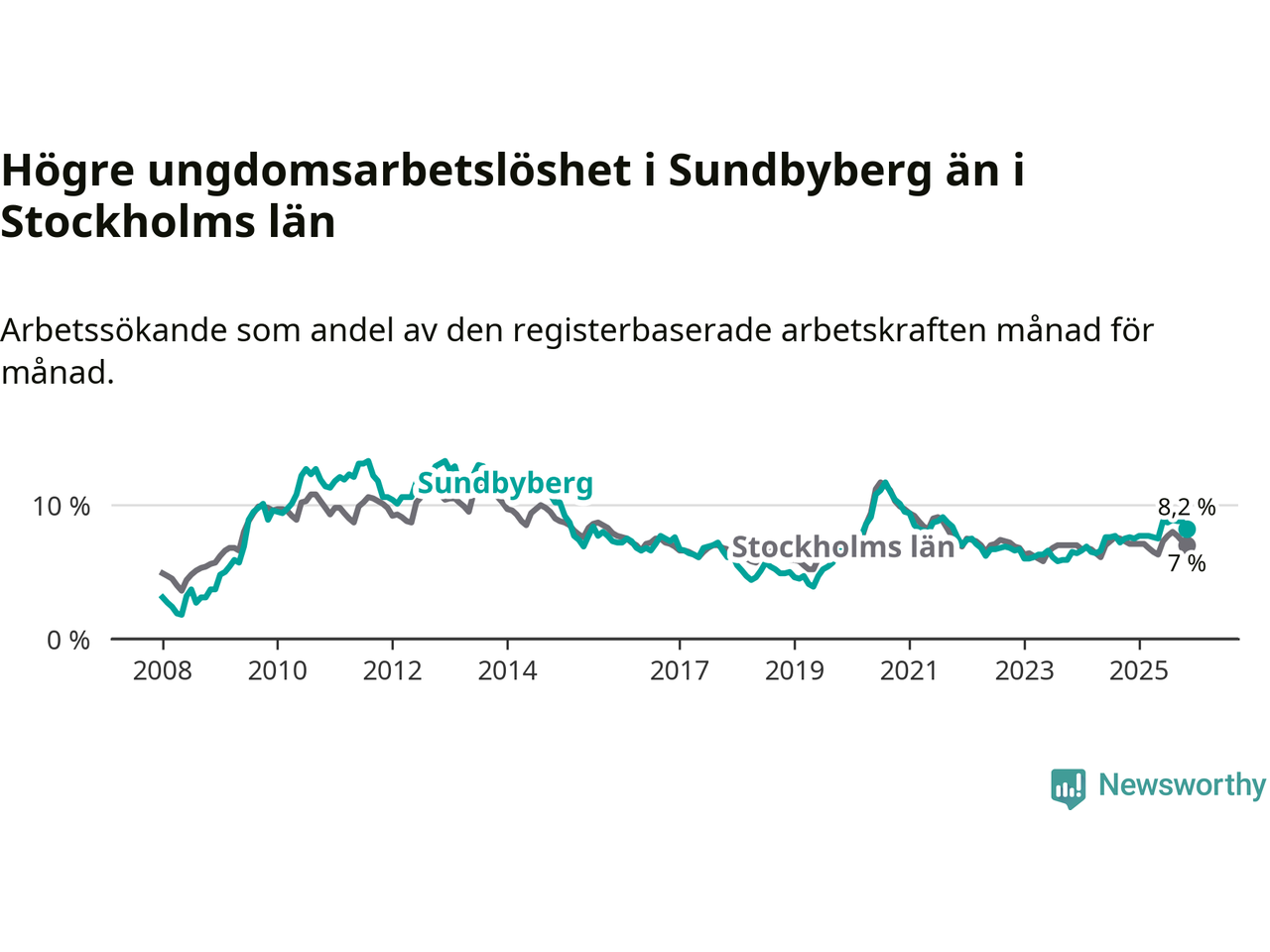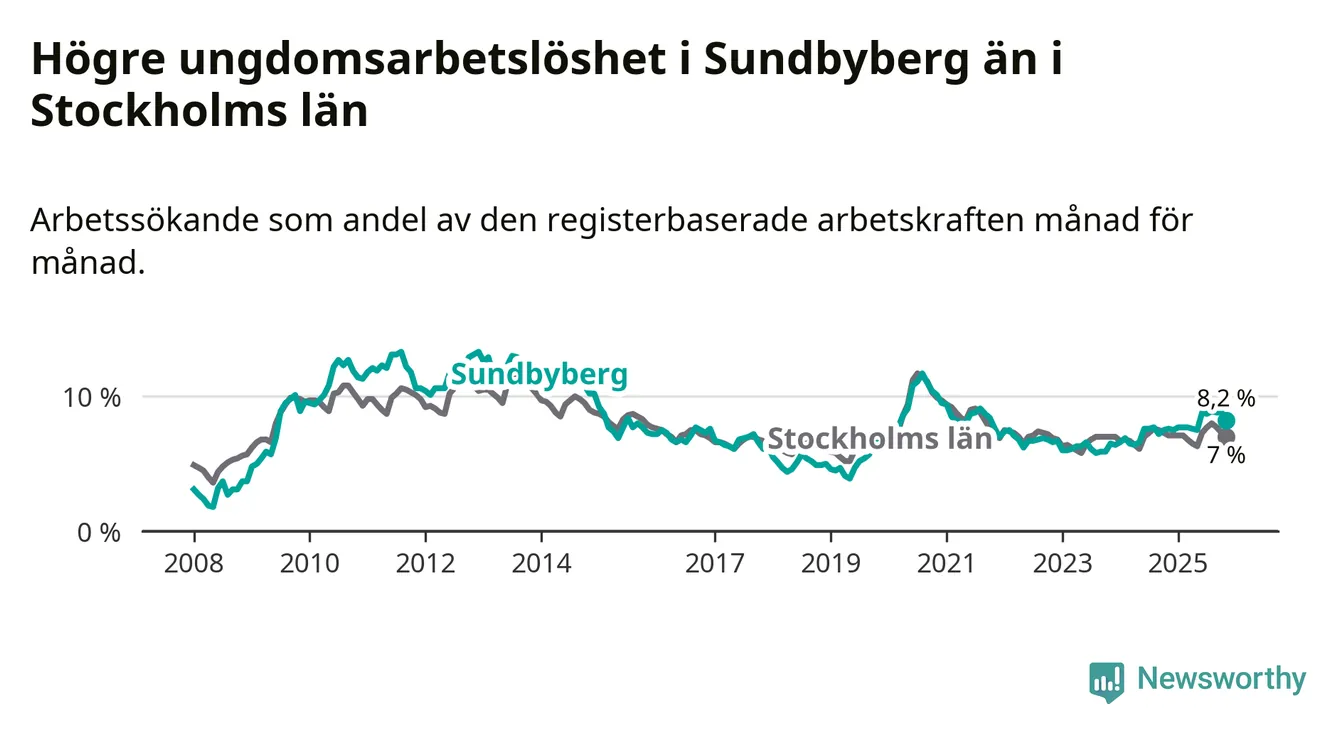 Medan Sundbyberg har ungefär samma total arbetslöshet som Stockholms län, ligger ungdomsarbetslösheten 1,2 procentenheter högre i Sundbyberg.