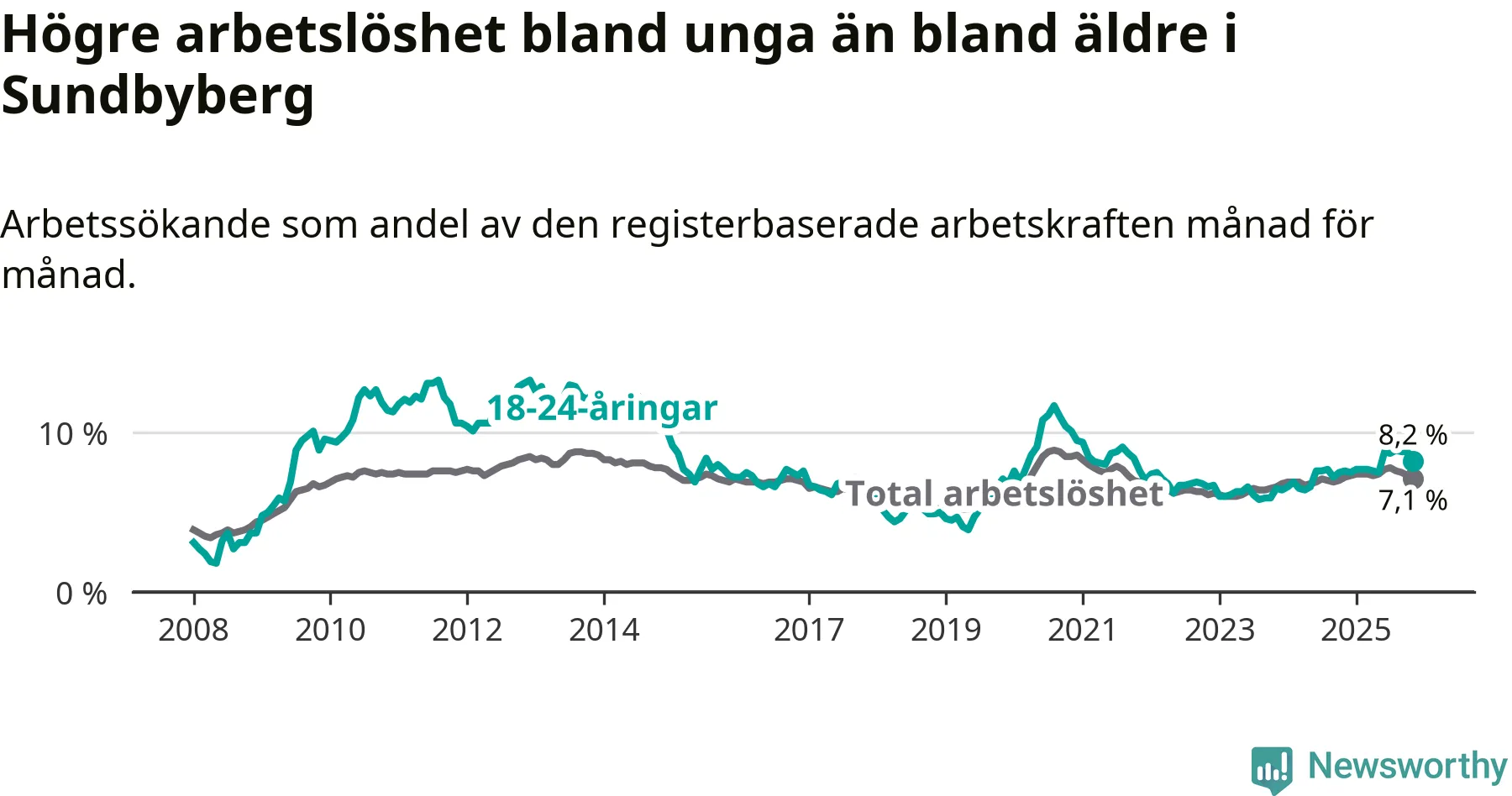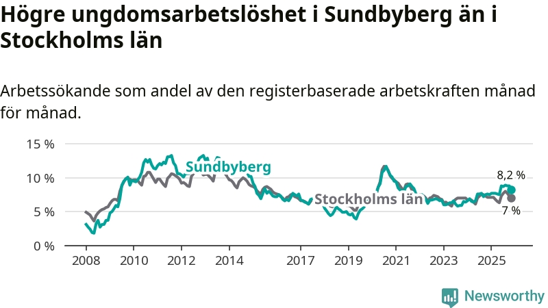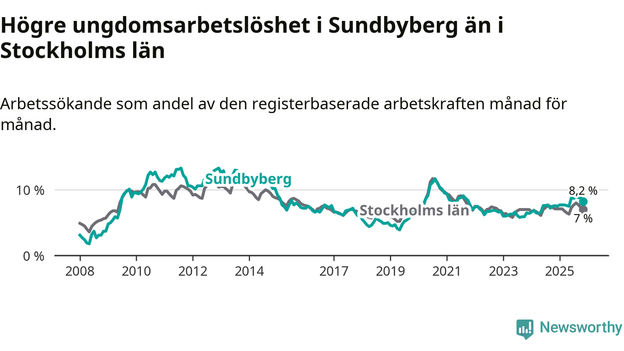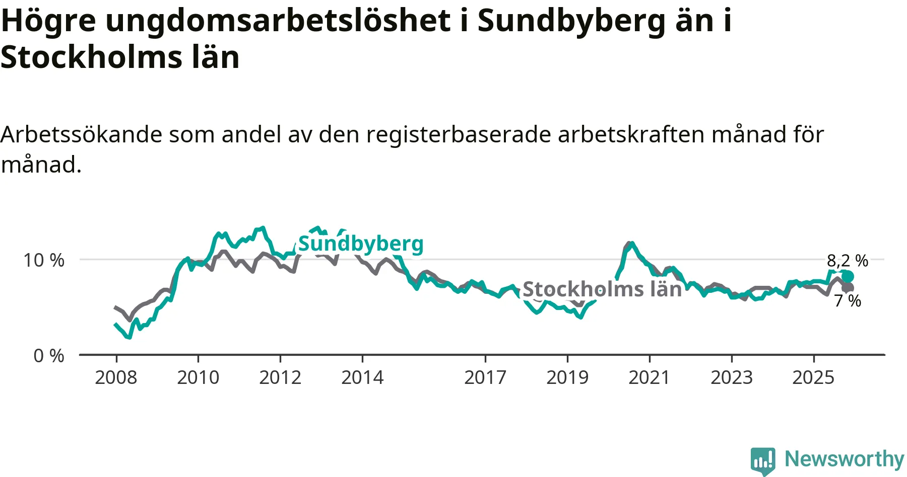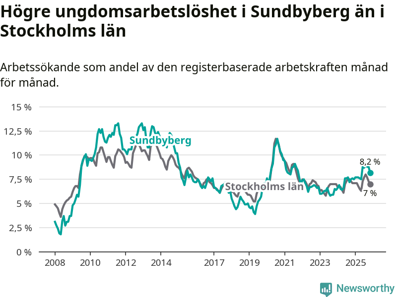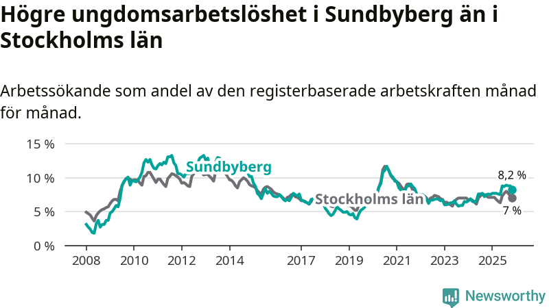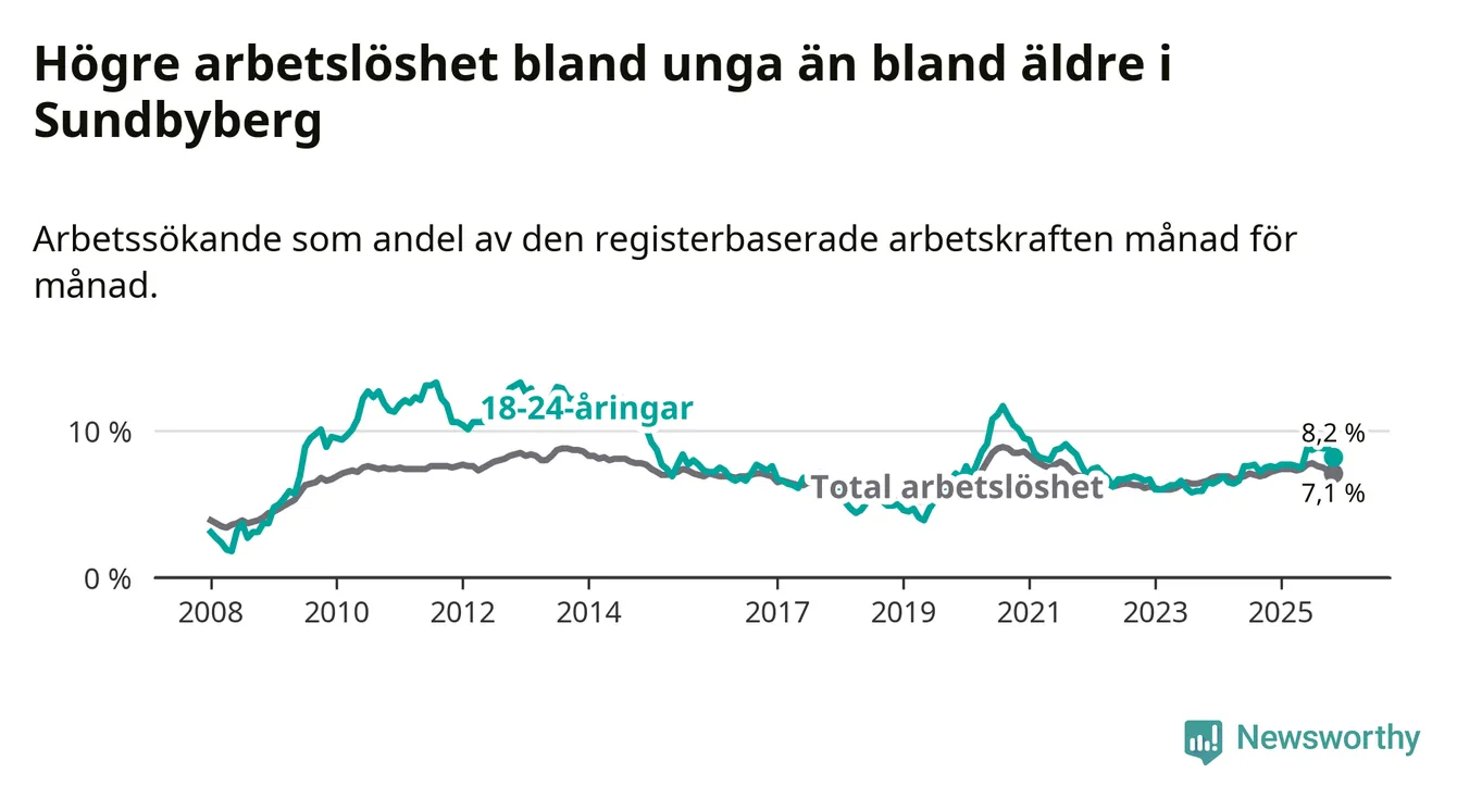 Medan Sundbyberg har ungefär samma total arbetslöshet som Stockholms län, ligger ungdomsarbetslösheten 1,2 procentenheter högre i Sundbyberg.