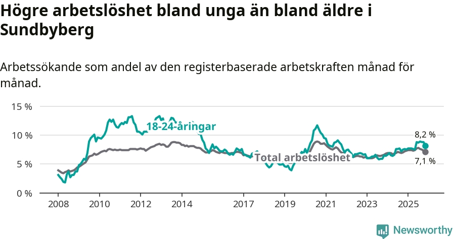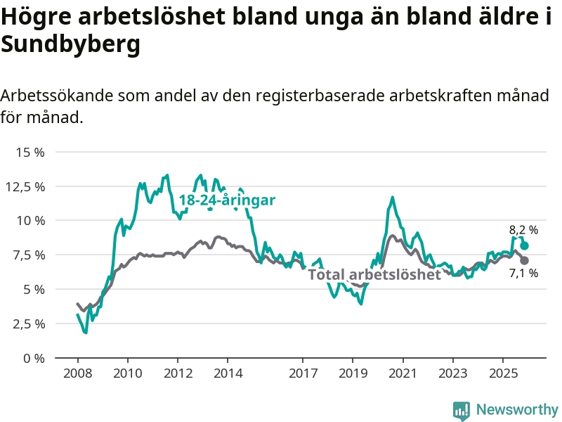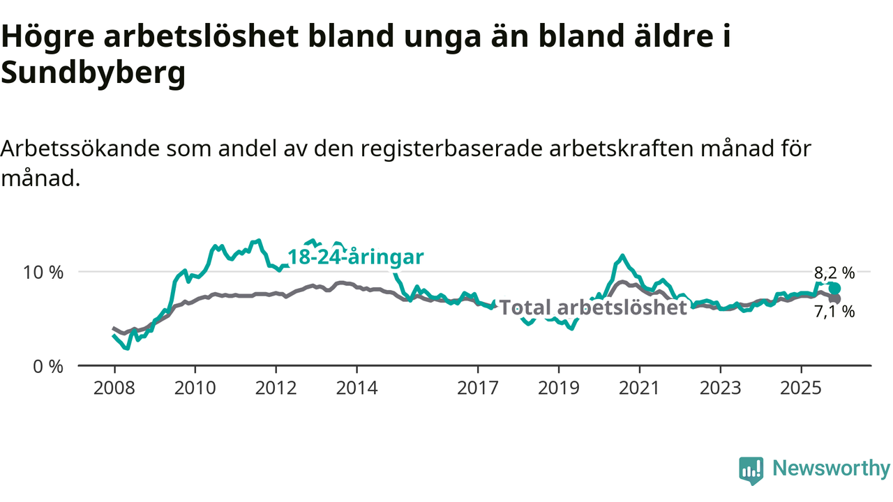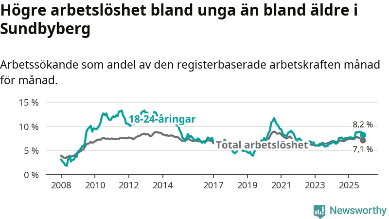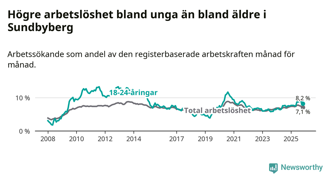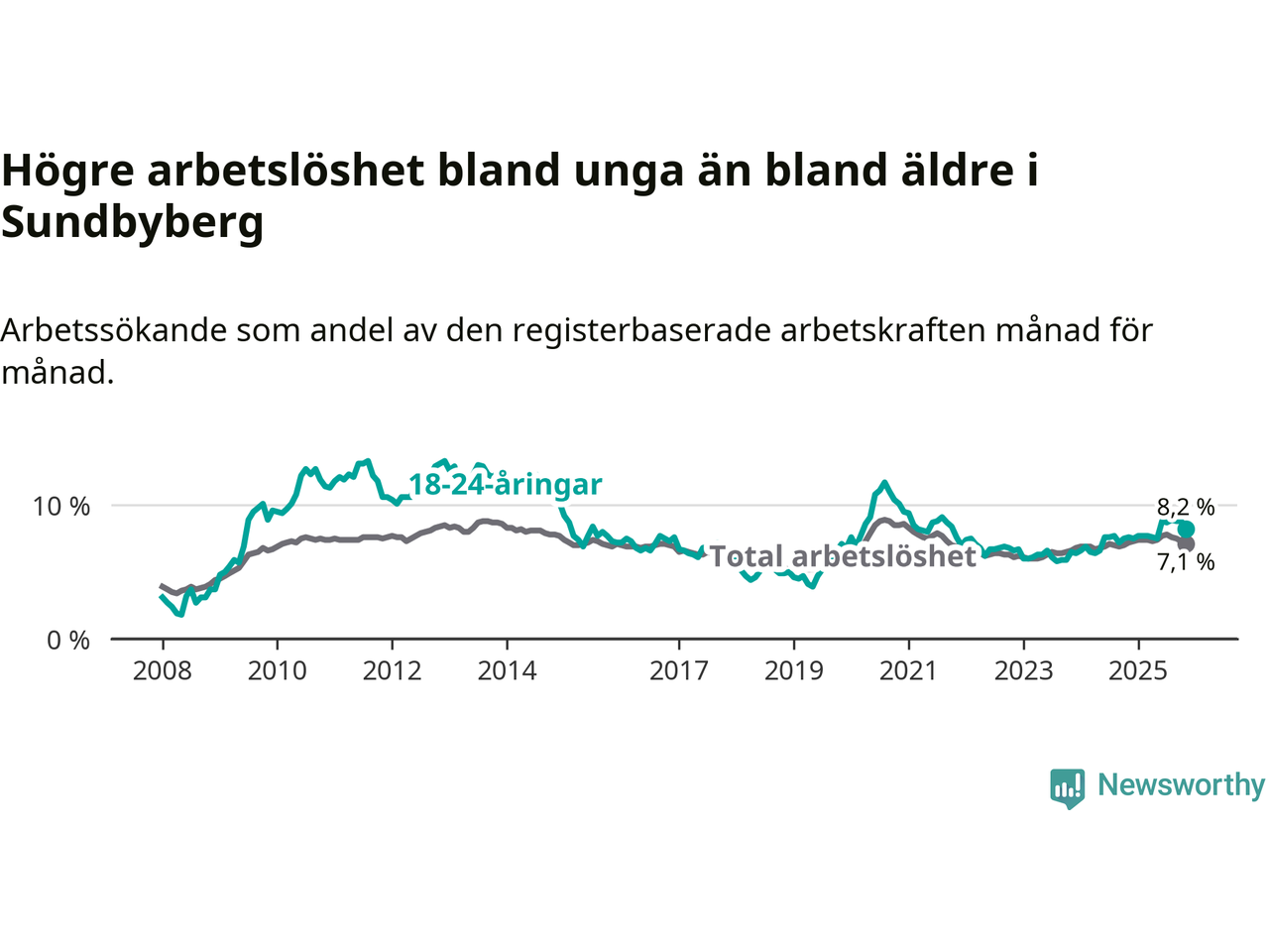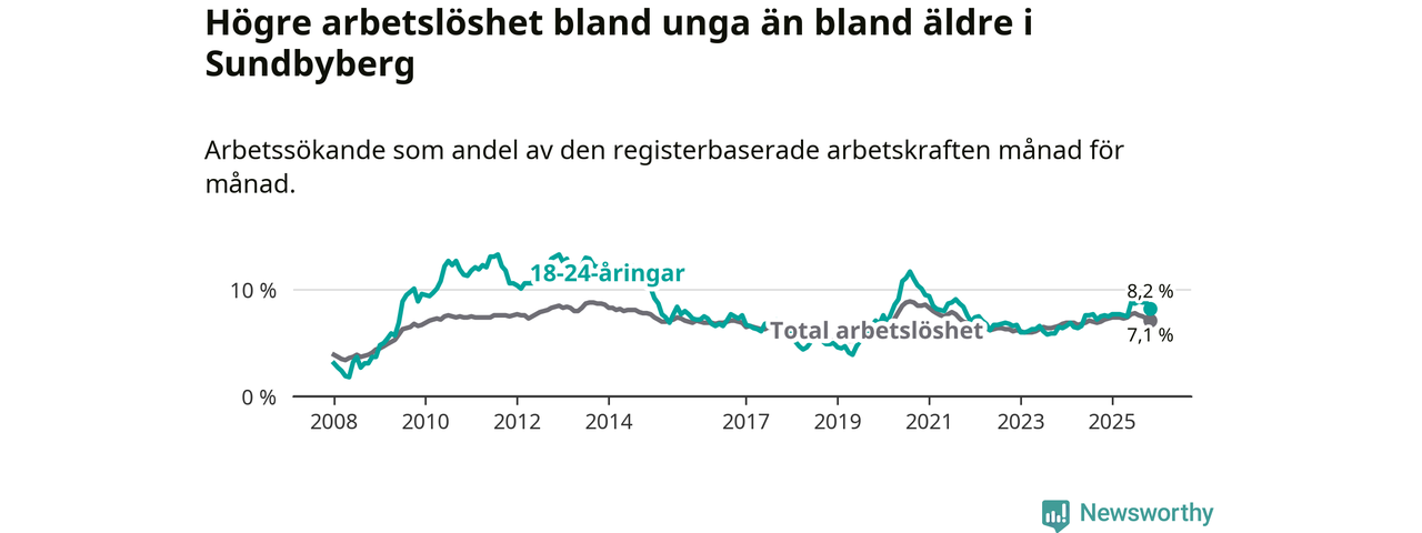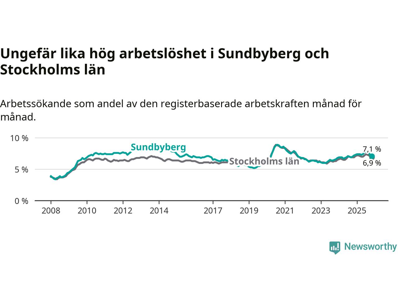 Medan Sundbyberg har ungefär samma total arbetslöshet som Stockholms län, ligger ungdomsarbetslösheten 1,2 procentenheter högre i Sundbyberg.