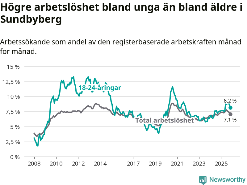 I och med den senaste månadens uppgång har de ungas arbetslöshet i Sundbyberg stigit 23 månader i följd (upp från 6,4 procent i december 2023 till 8,2 procent nu).