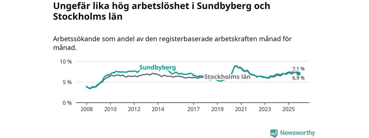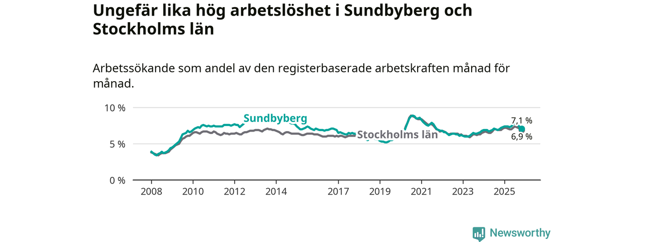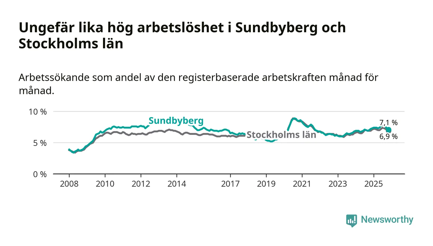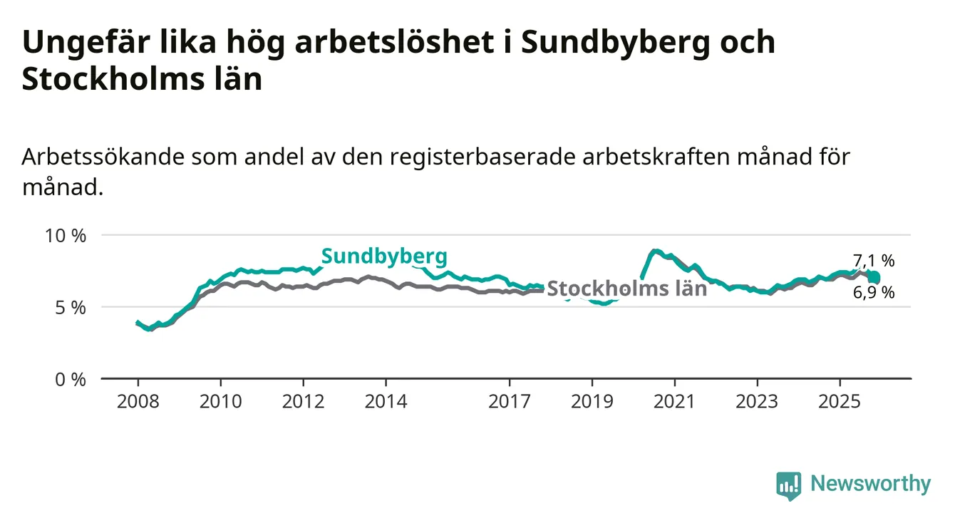 Under november månad rapporterade Sundbybergs kommun en total arbetslöshet på 7,1 procent. Det är en minskning jämfört med samma tidpunkt i fjol (−0,1 procentenheter). I Stockholms län däremot står arbetslösheten stilla.