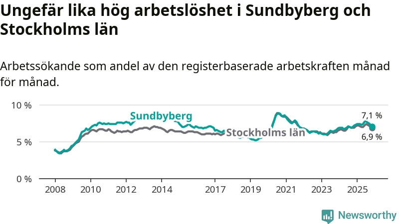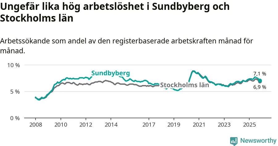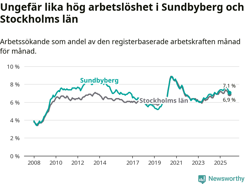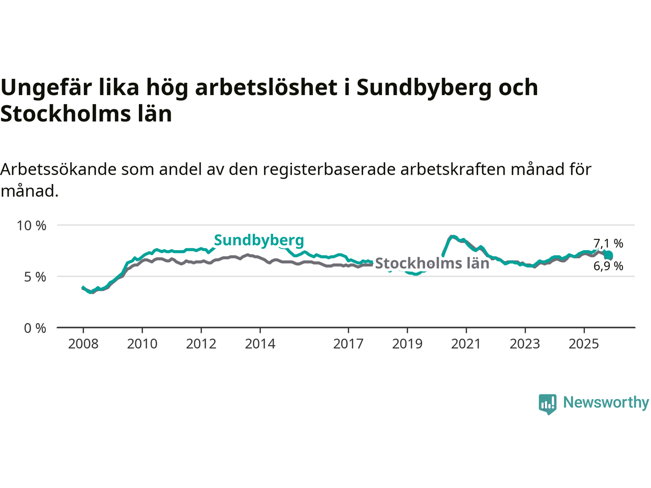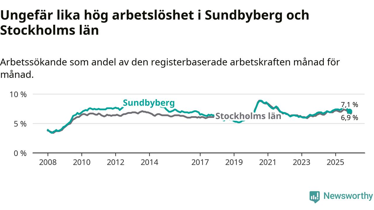 Under november månad rapporterade Sundbybergs kommun en total arbetslöshet på 7,1 procent. Det är en minskning jämfört med samma tidpunkt i fjol (−0,1 procentenheter). I Stockholms län däremot står arbetslösheten stilla.