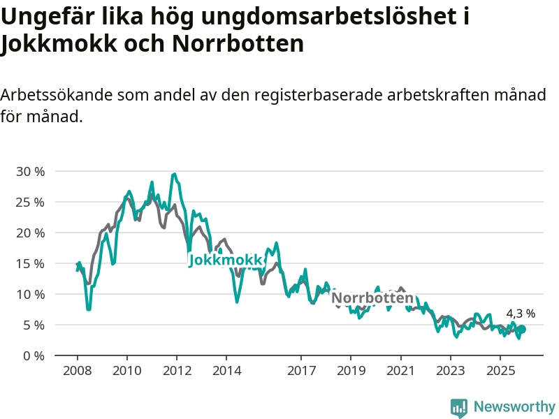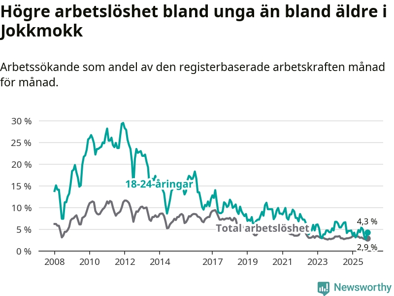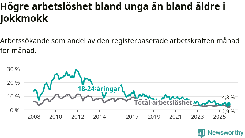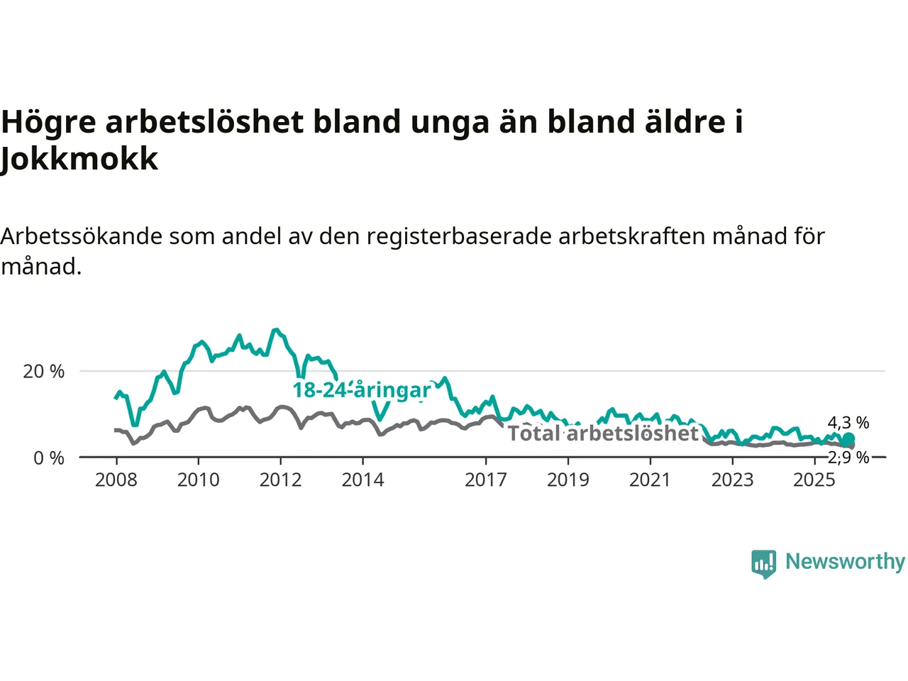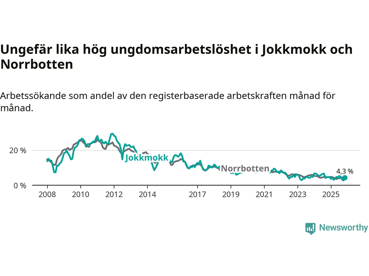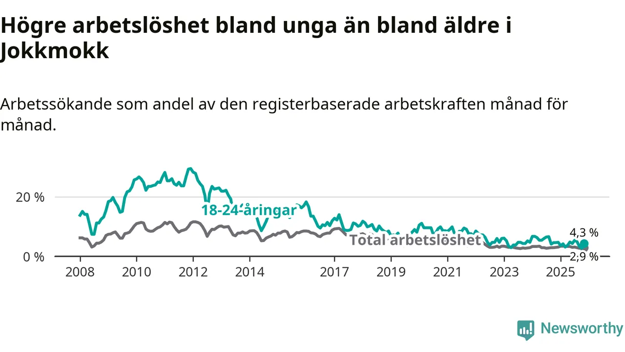 I och med den senaste månadens nedgång har de ungas arbetslöshet i Jokkmokk sjunkit elva månader i följd (ner från 4,7 procent i december 2024 till 4,3 procent nu).