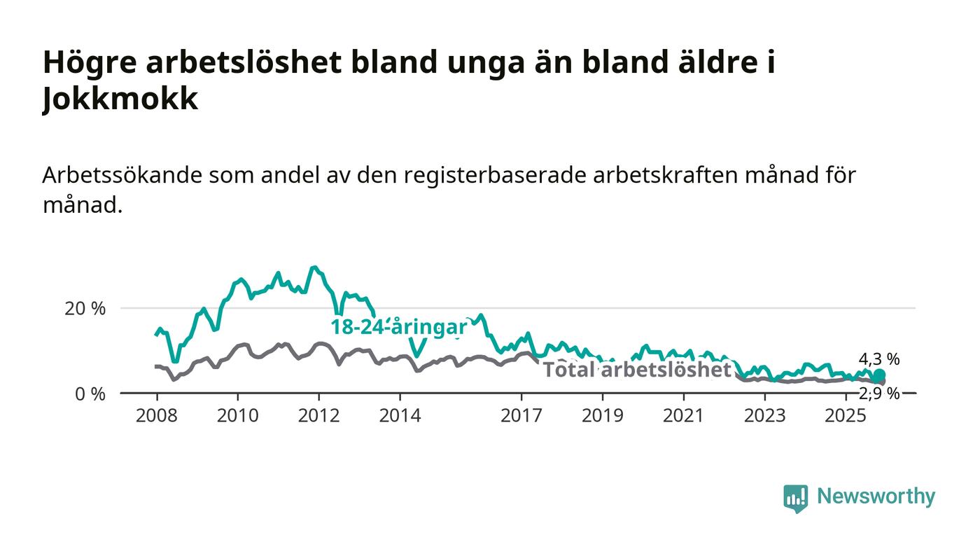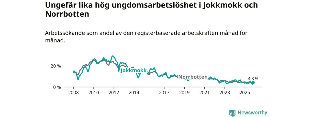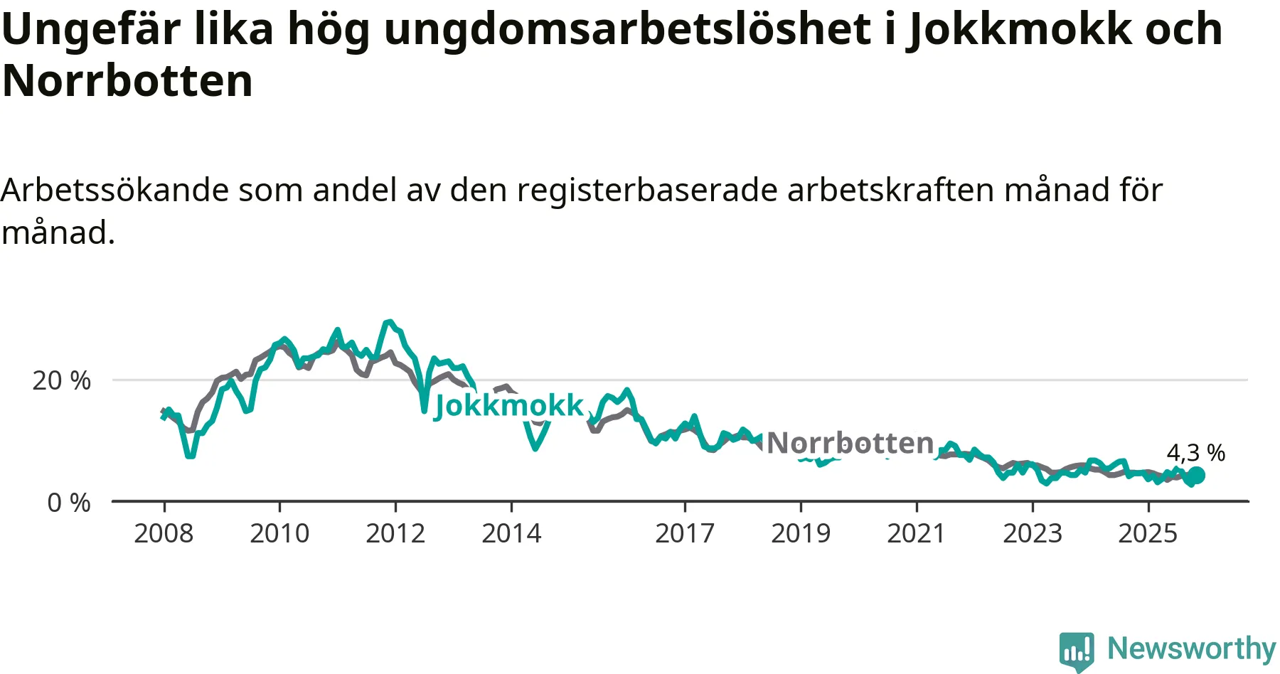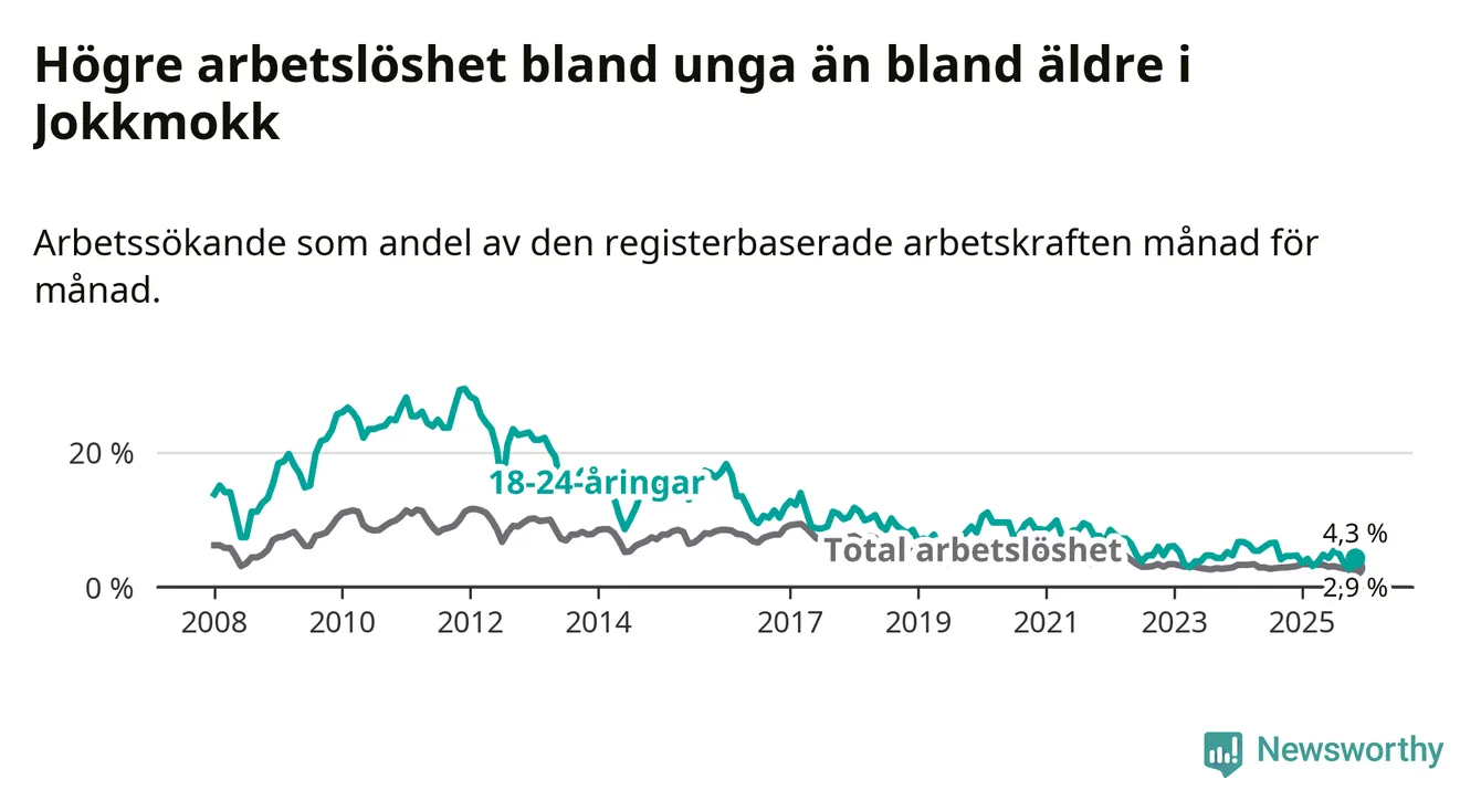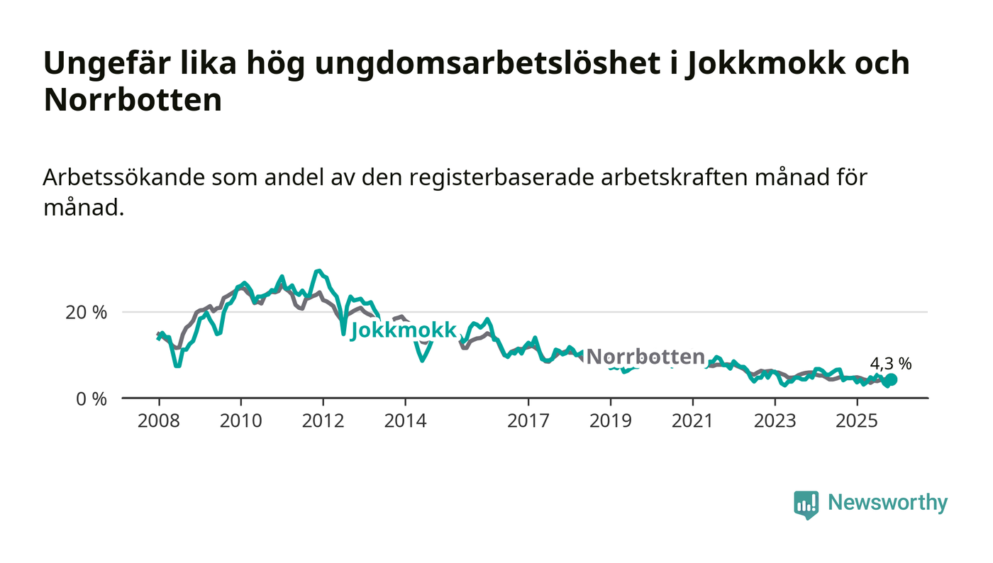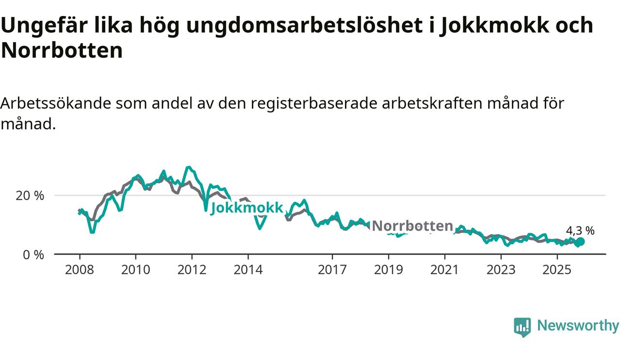 Medan Jokkmokk har lägre total arbetslöshet än Norrbotten, ligger ungdomsarbetslösheten på i stort sett samma nivå.