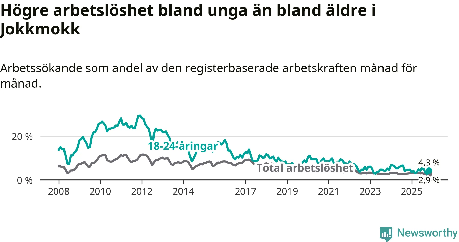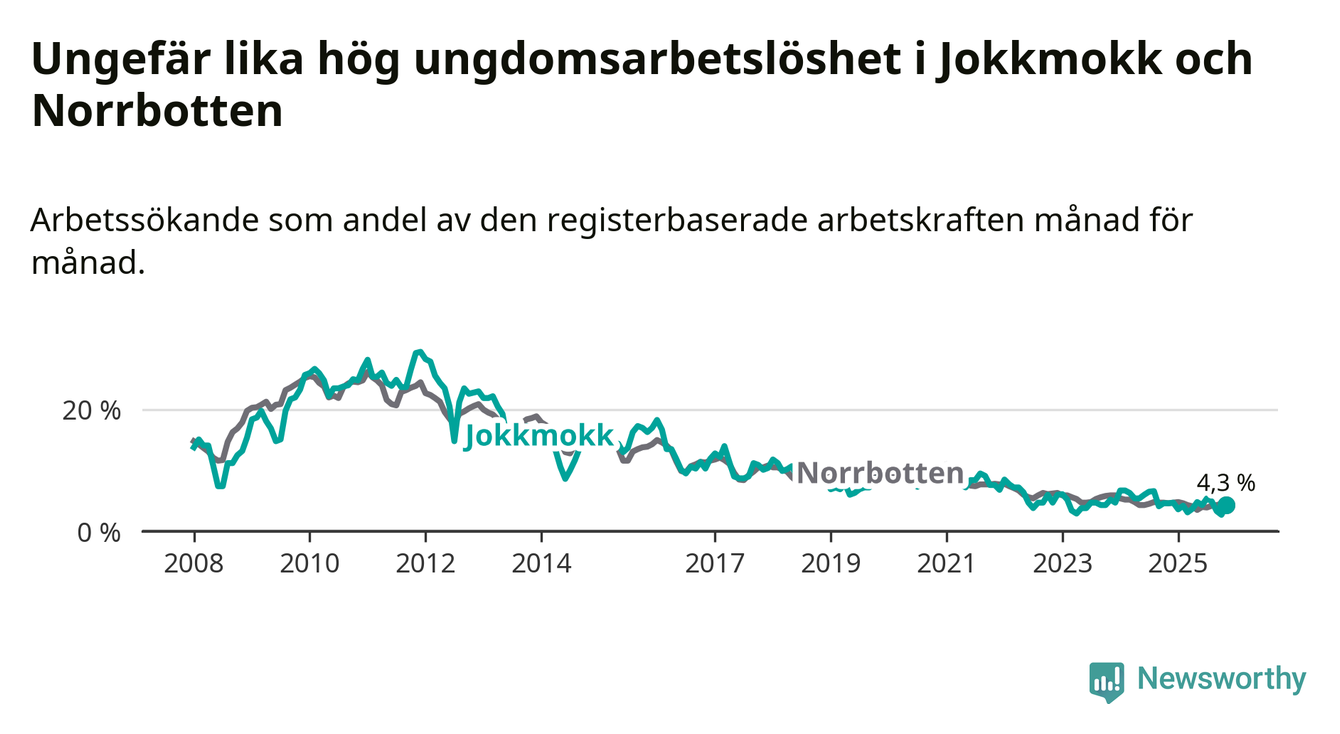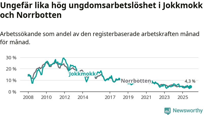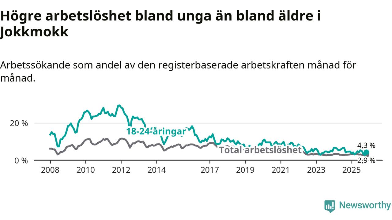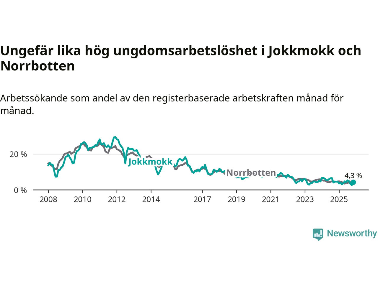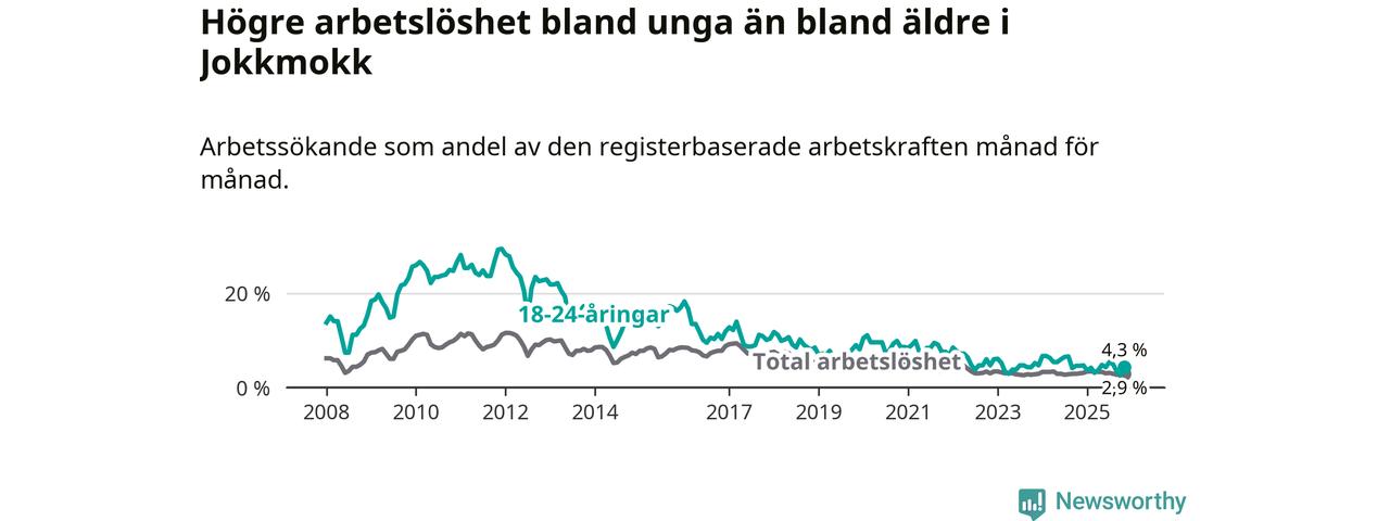 Medan Jokkmokk har lägre total arbetslöshet än Norrbotten, ligger ungdomsarbetslösheten på i stort sett samma nivå.
