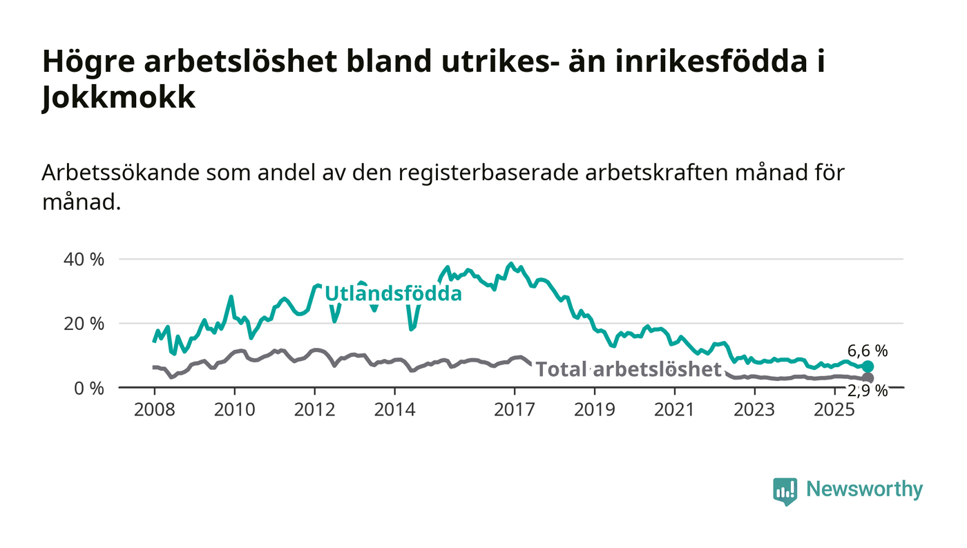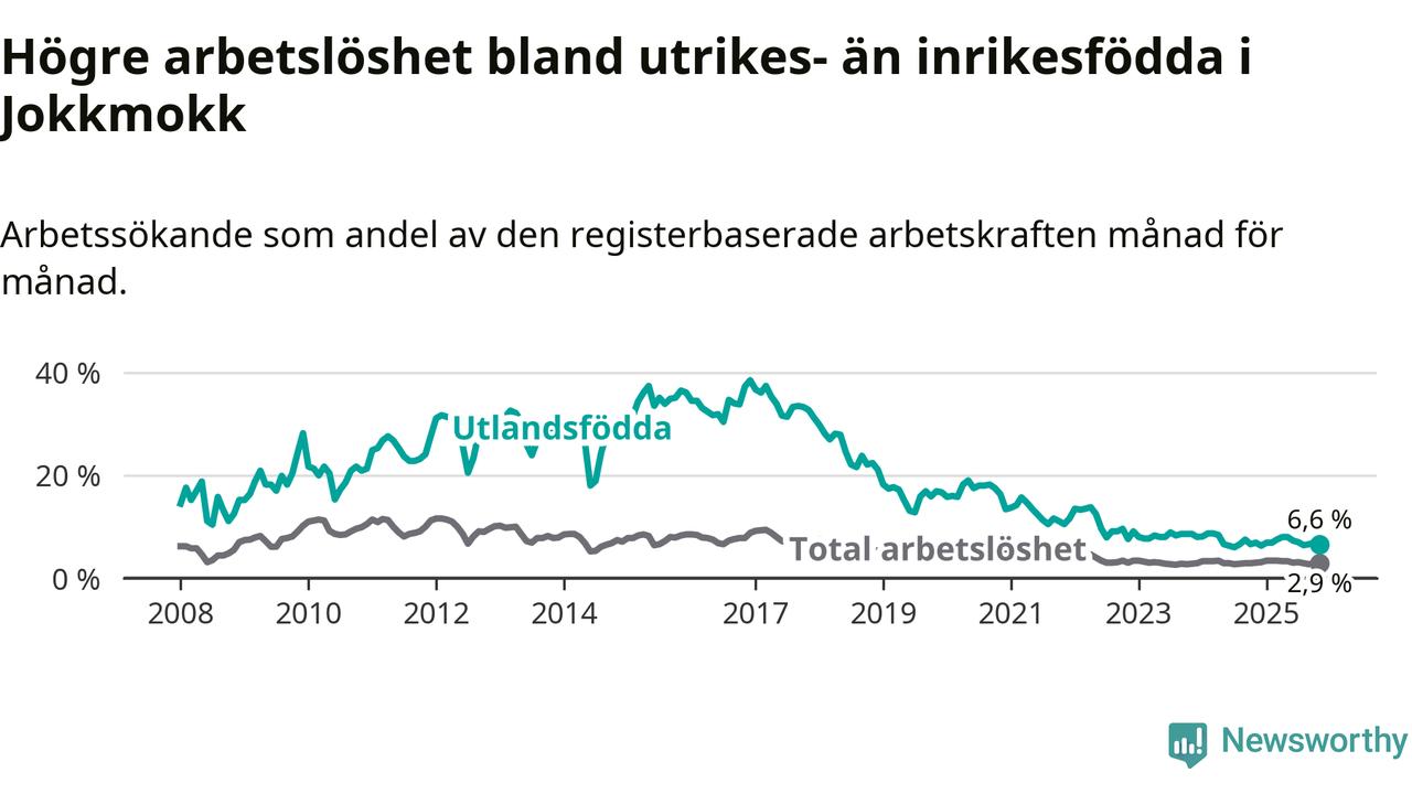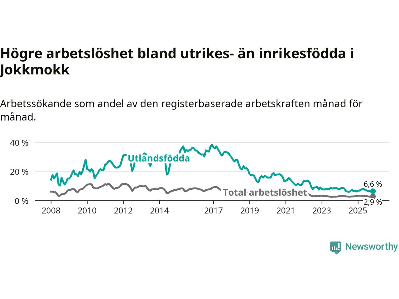 Arbetslösheten bland utlandsfödda var 6,6 procent i Jokkmokk under november månad, motsvarande 23 av 348 personer. Det är 0,3 procentenheter färre än vid samma tidpunkt i fjol (±0 om man räknar personer). Den senaste månadens nedgång innebär ett trendbrott. Under de ett föregående månaderna hade arbetslösheten bland utlandsfödda varit högre än motsvarande tidpunkt året innan.