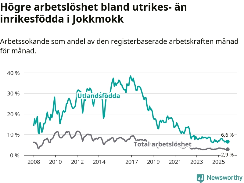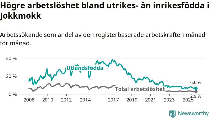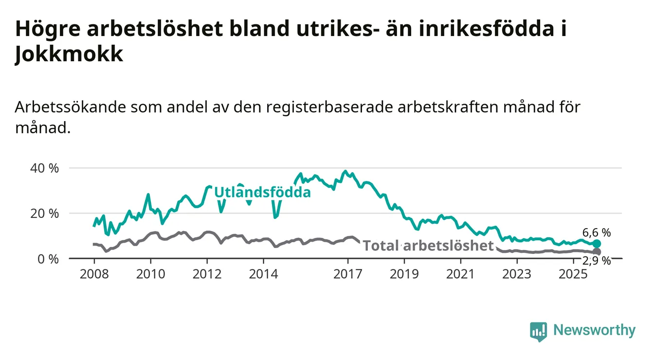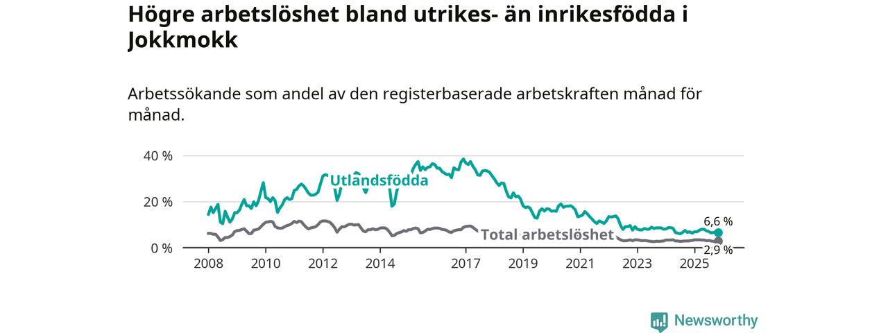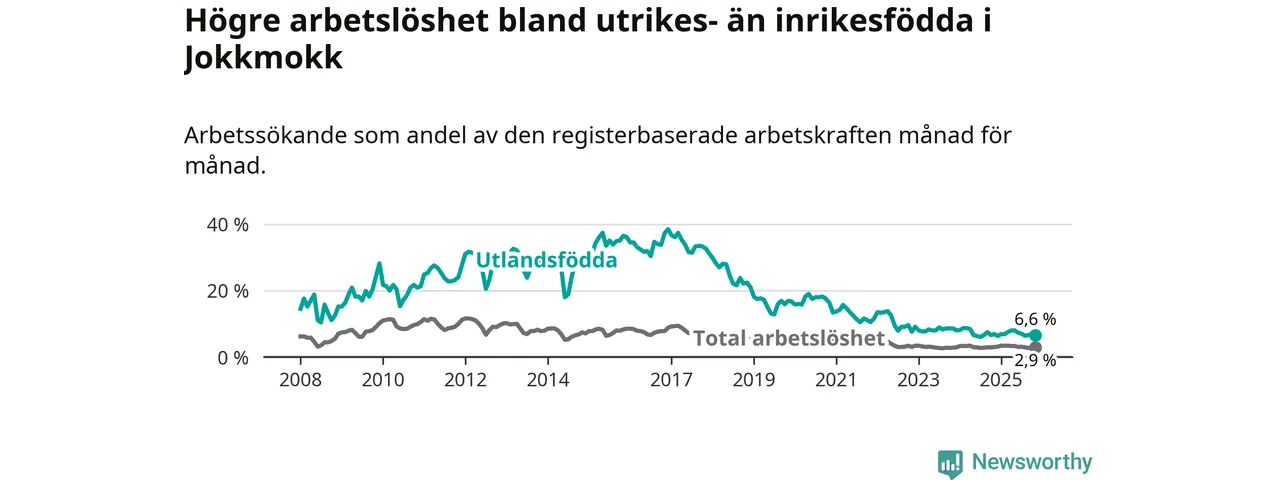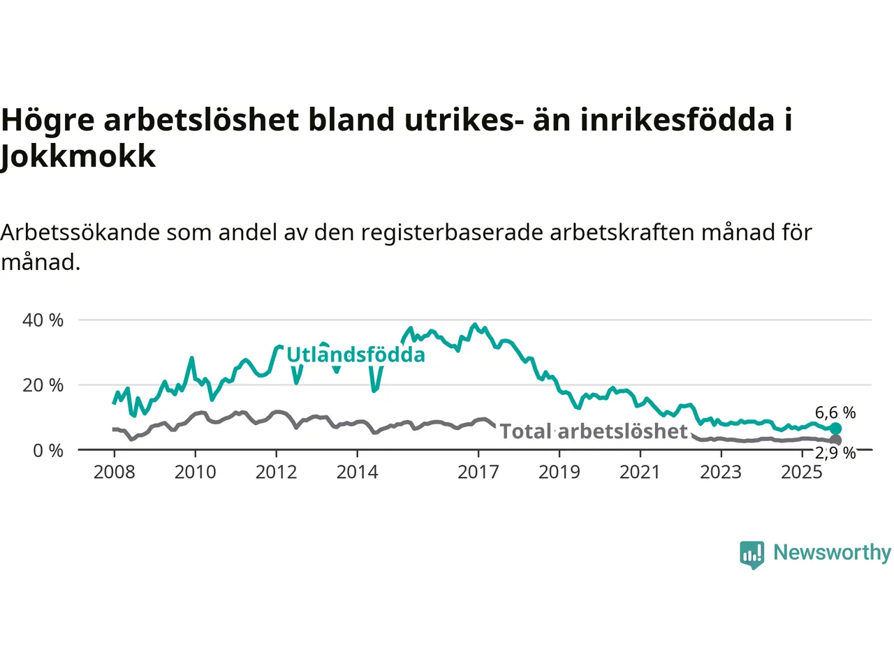Arbetslösheten bland utlandsfödda var 6,6 procent i Jokkmokk under november månad, motsvarande 23 av 348 personer. Det är 0,3 procentenheter färre än vid samma tidpunkt i fjol (±0 om man räknar personer). Den senaste månadens nedgång innebär ett trendbrott. Under de ett föregående månaderna hade arbetslösheten bland utlandsfödda varit högre än motsvarande tidpunkt året innan.