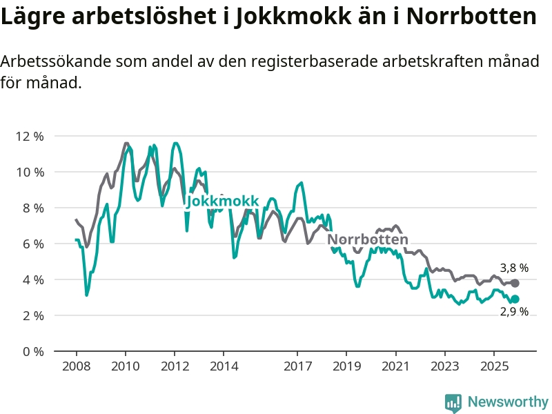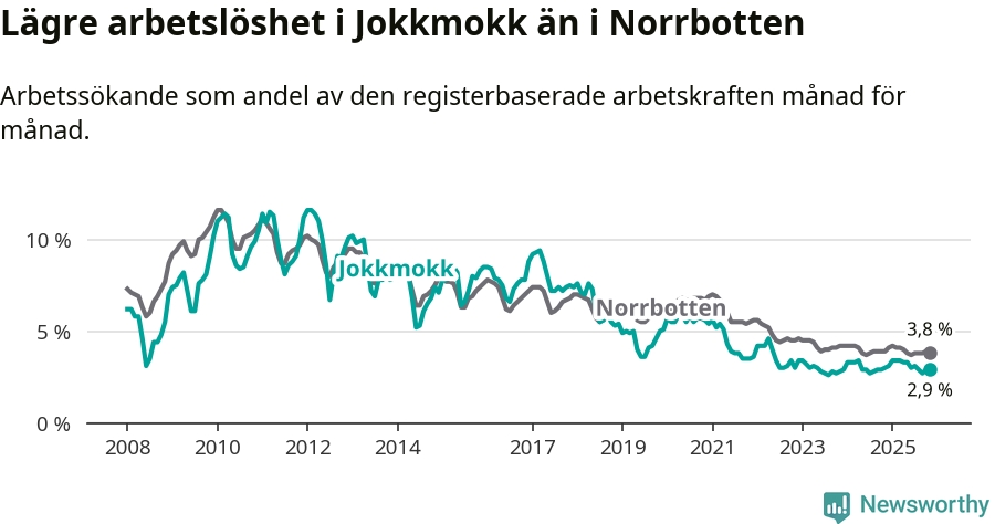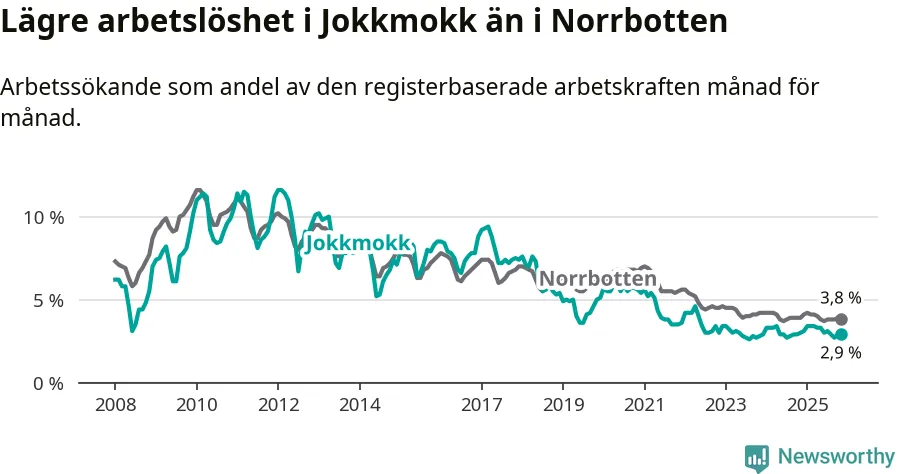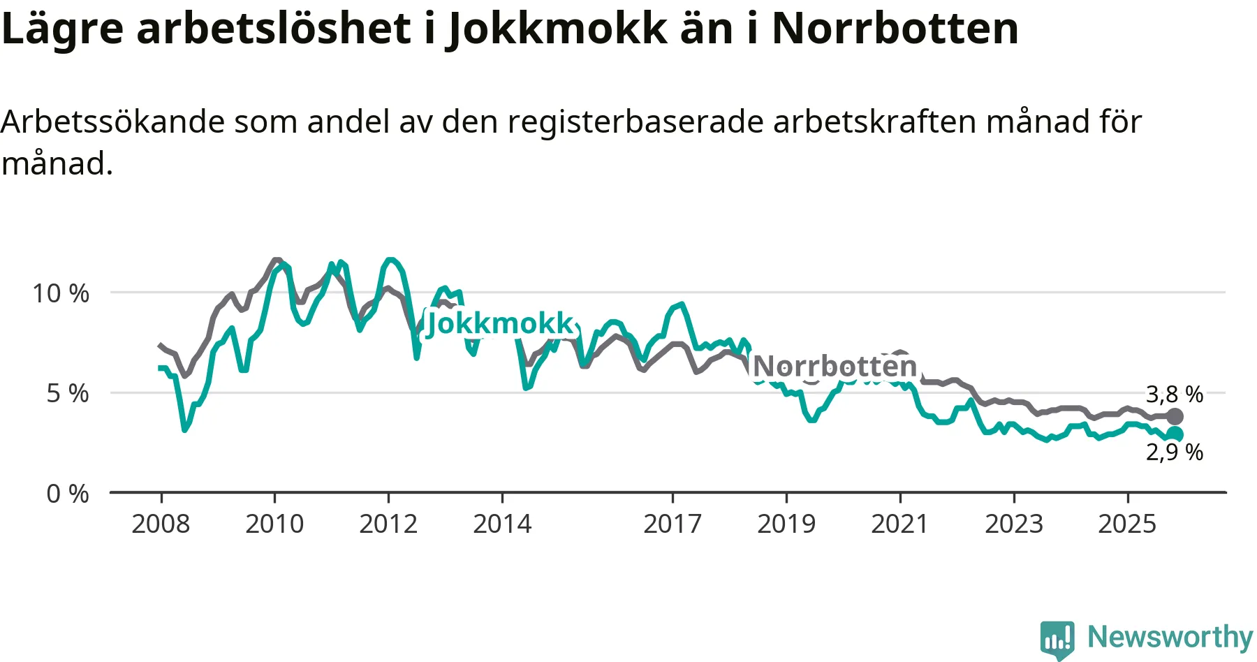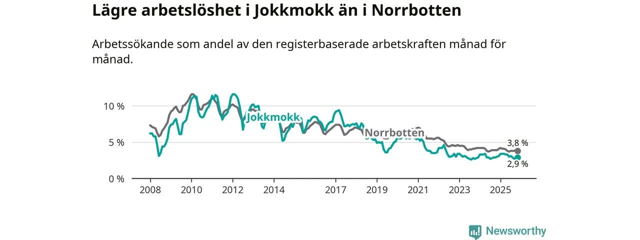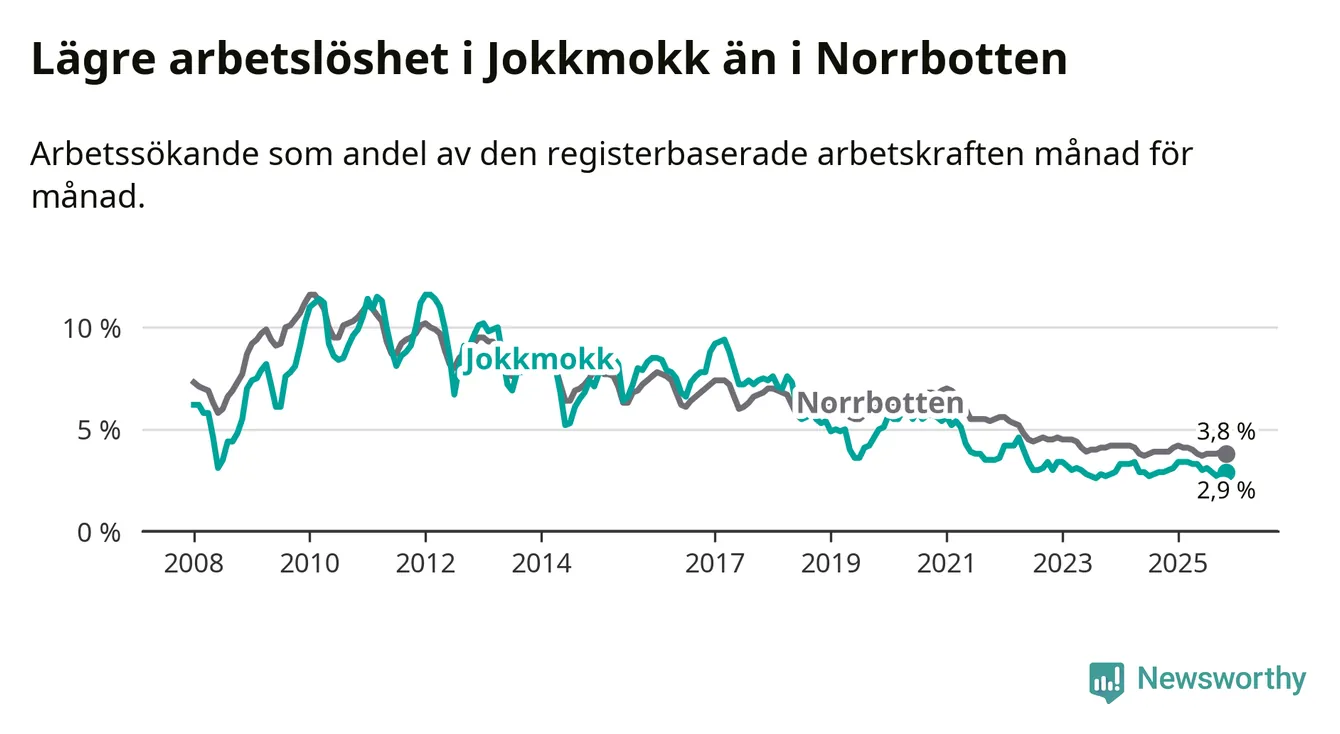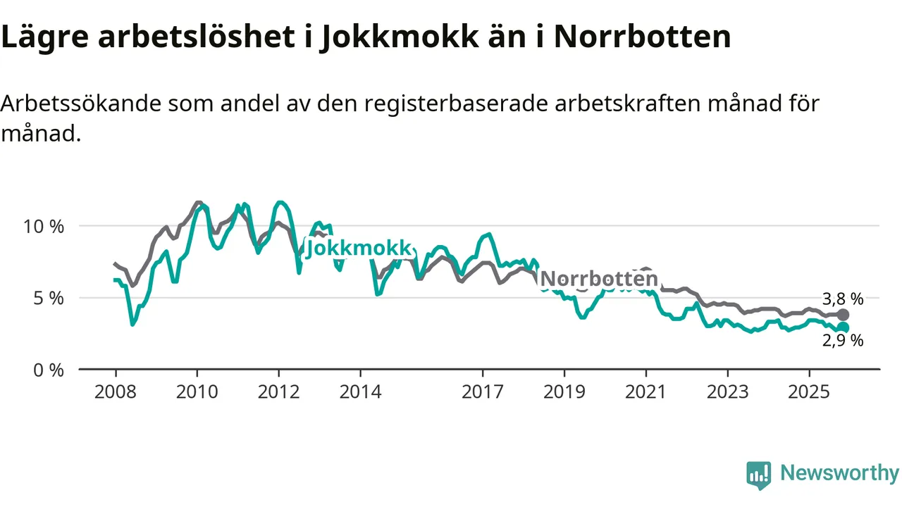 Under november månad rapporterade Jokkmokks kommun en total arbetslöshet på 2,9 procent. Det är en minskning jämfört med samma tidpunkt i fjol (−0,1 procentenheter). Även i Norrbottens län sjunker arbetslösheten något.