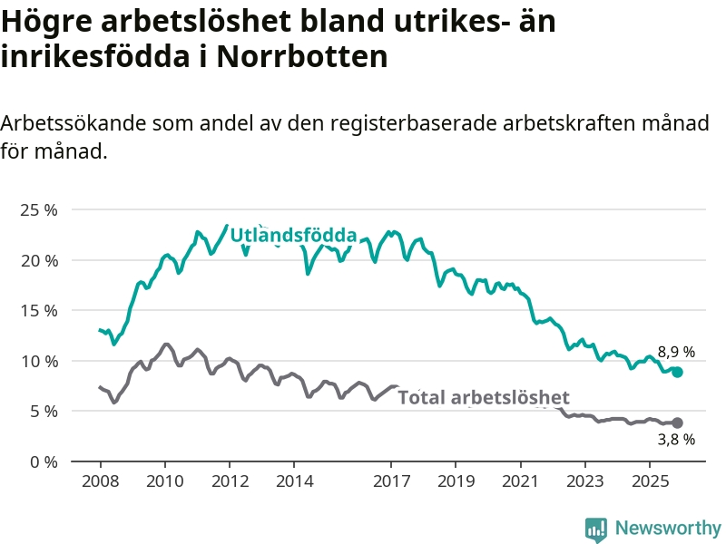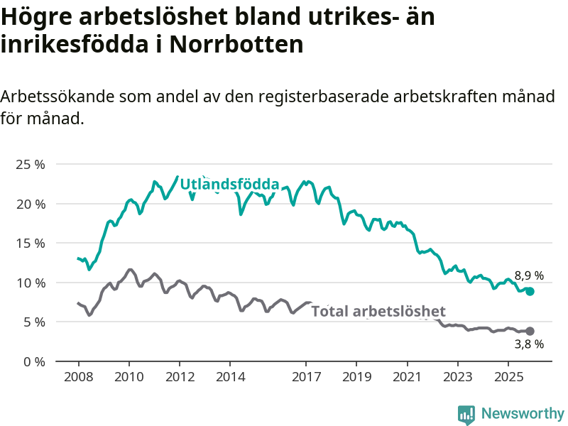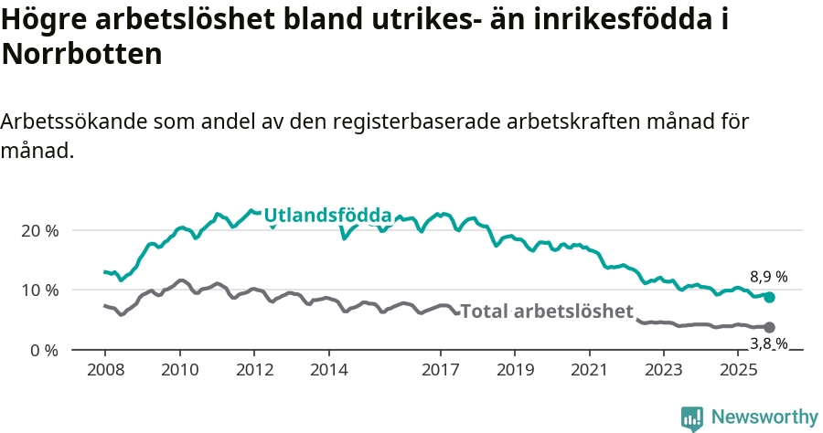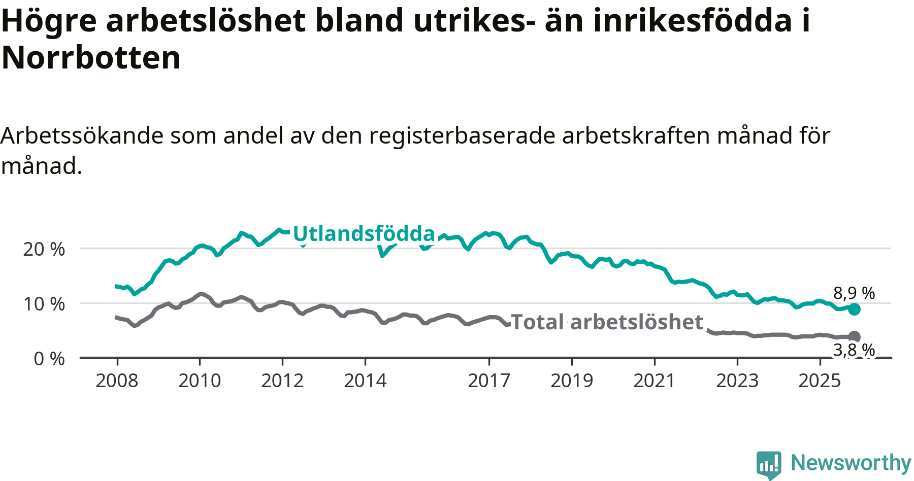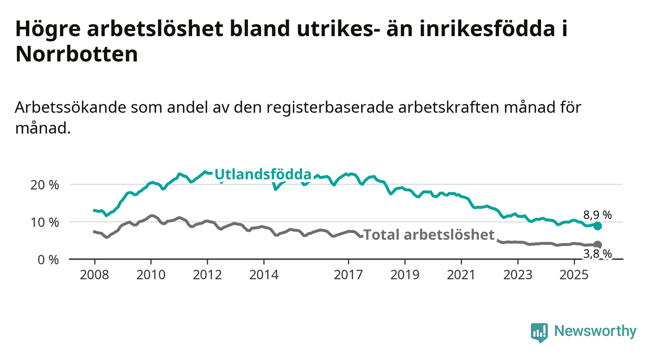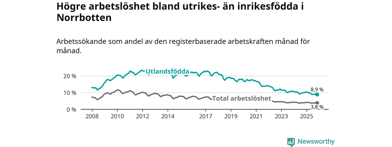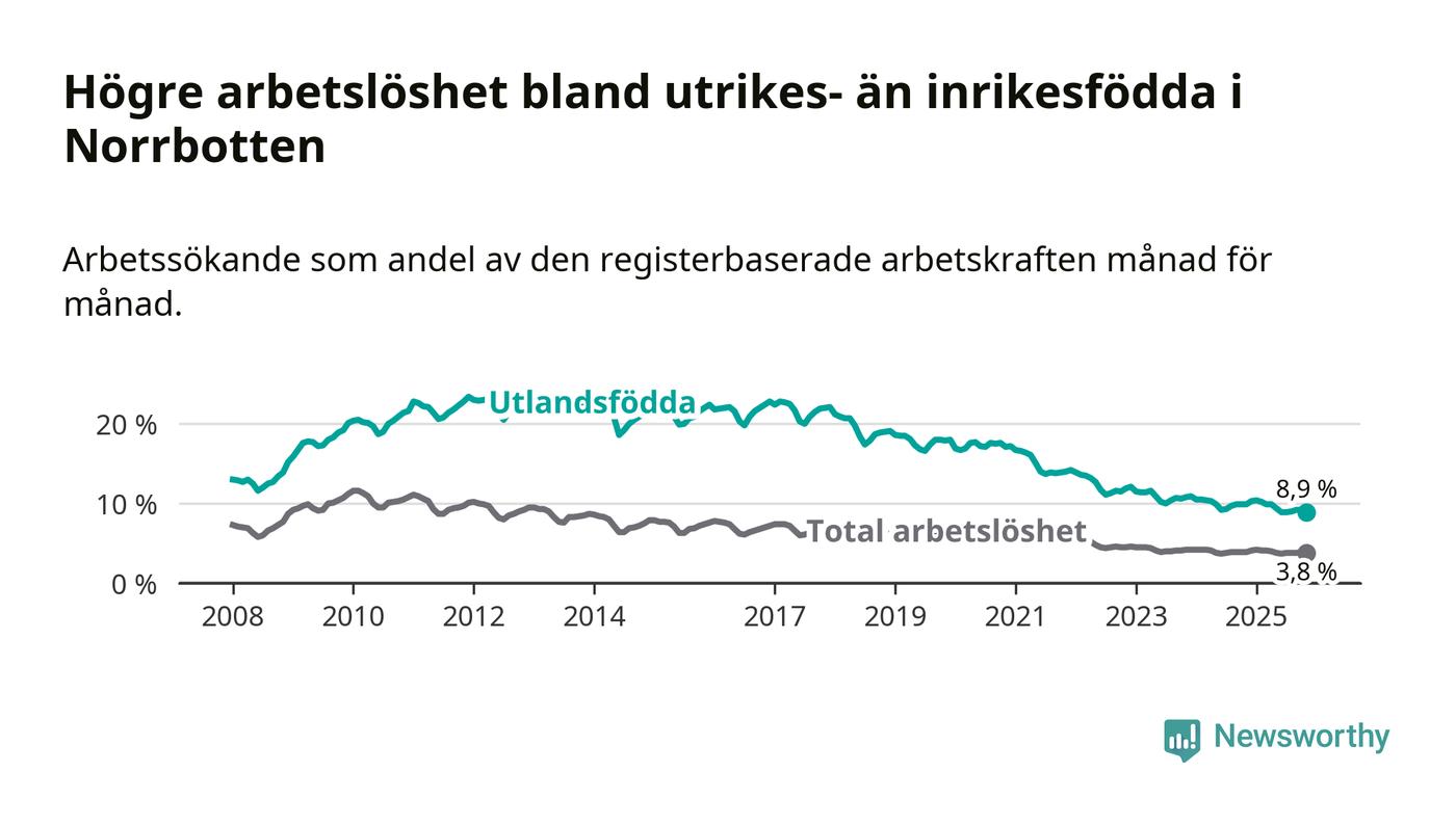 Arbetslösheten bland utlandsfödda var 8,9 procent i Norrbotten under november månad, motsvarande 1 641 av 18 438 personer. Det är 1,0 procentenheter färre än vid samma tidpunkt i fjol (−102 om man räknar personer). Därmed har de utlandsföddas arbetslöshet varit lägre än vid samma tidpunkt i fjol i över fem år i sträck. Sedan augusti 2020 har arbetslösheten bland utlandsfödda minskat från 17,6 till 8,9 procent.