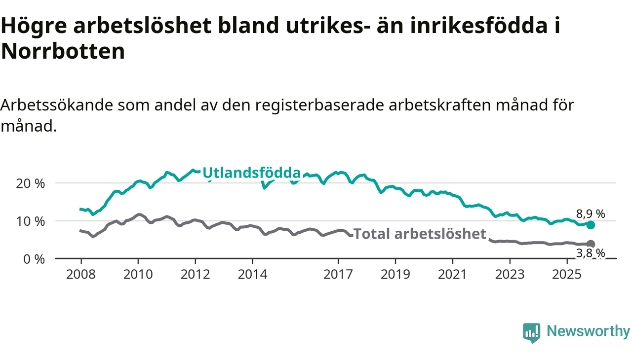 Skillnaden i arbetslöshet mellan utrikesfödda och hela befolkningen är 5,1 procentenheter i Norrbotten. Det är en mindre skillnad än för ett år sedan (−0,9 procentenheter).