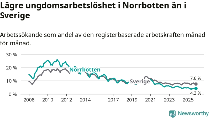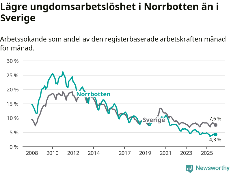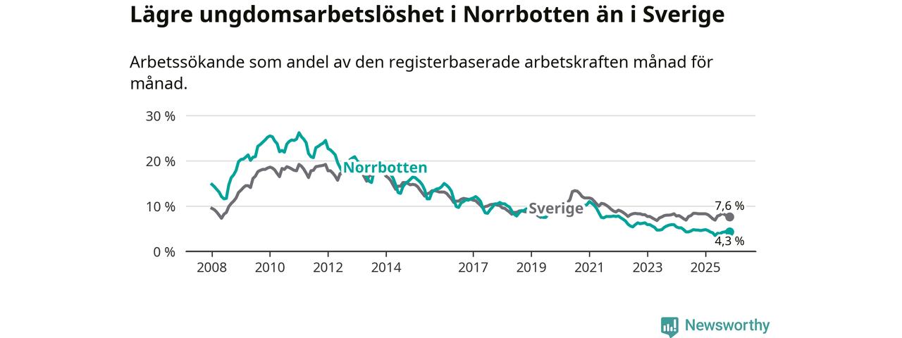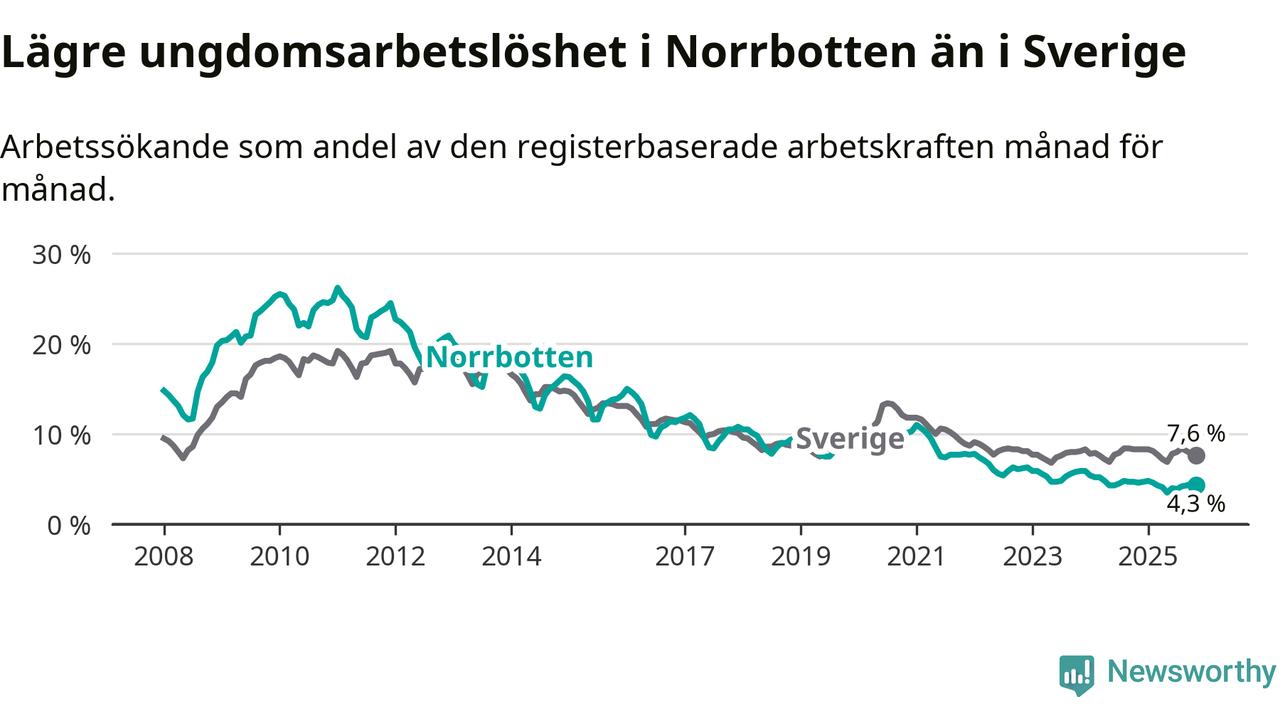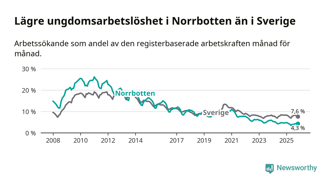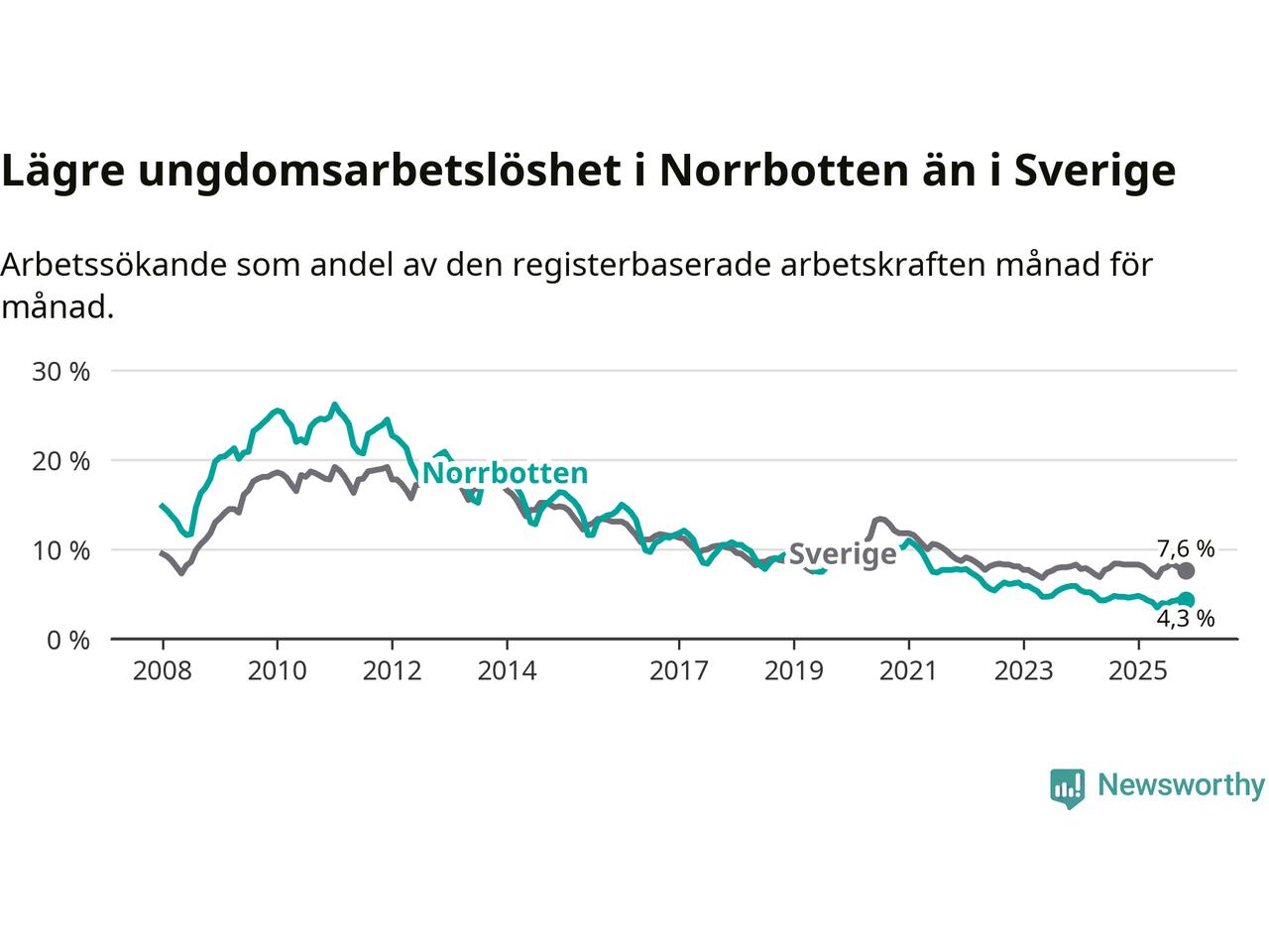 Precis som den totala arbetslösheten ligger ungdomsarbetslösheten i Norrbotten lägre än i Sverige som helhet. Skillnaden mellan länet och riket är 3,3 procentenheter.