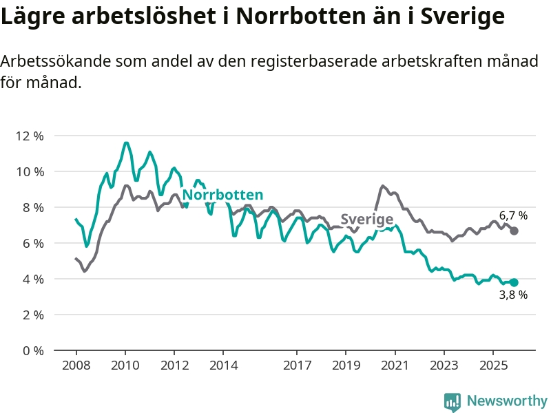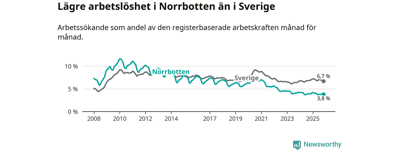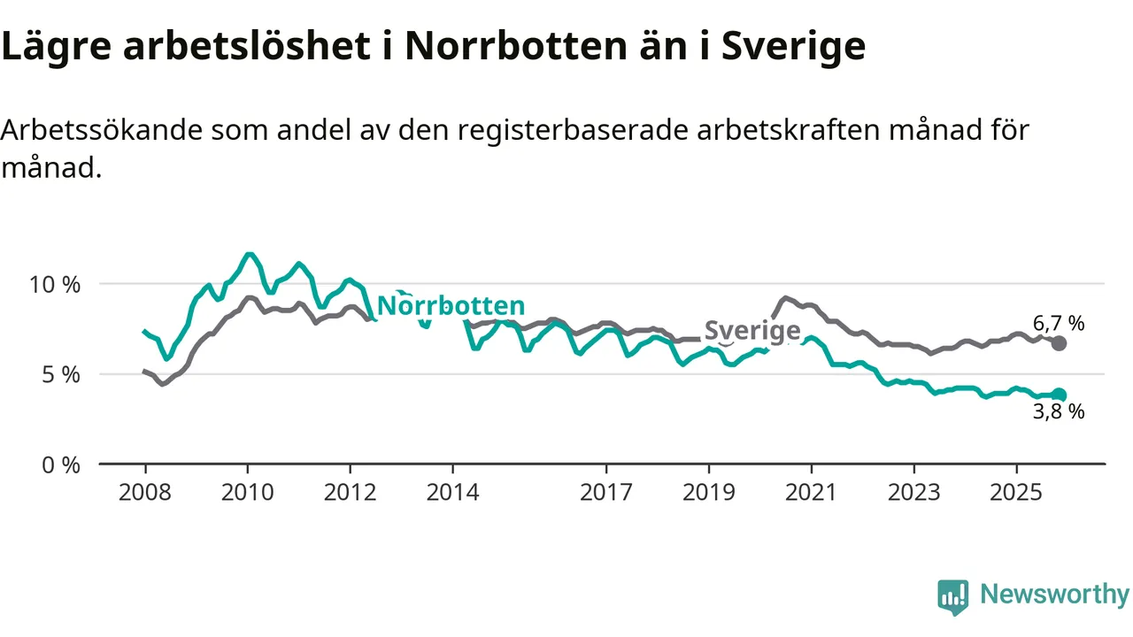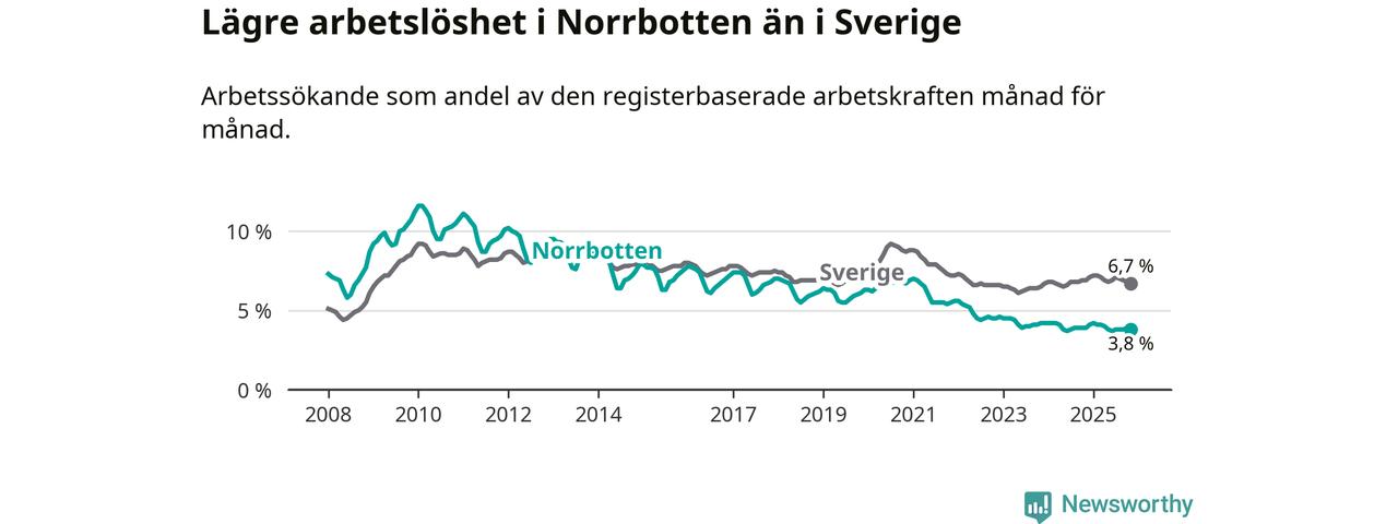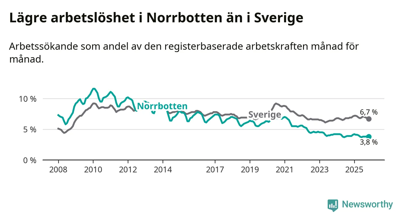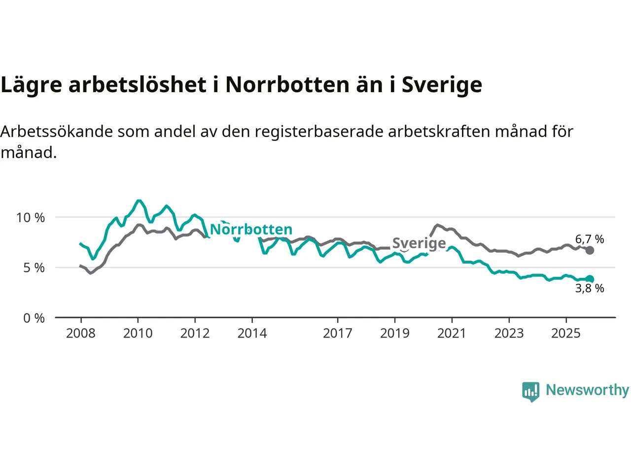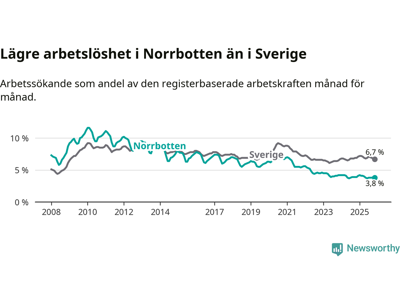 Under november månad rapporterade Norrbottens län en total arbetslöshet på 3,8 procent. Det är en minskning jämfört med samma tidpunkt i fjol (−0,1 procentenheter). Även i Sverige sjunker arbetslösheten .