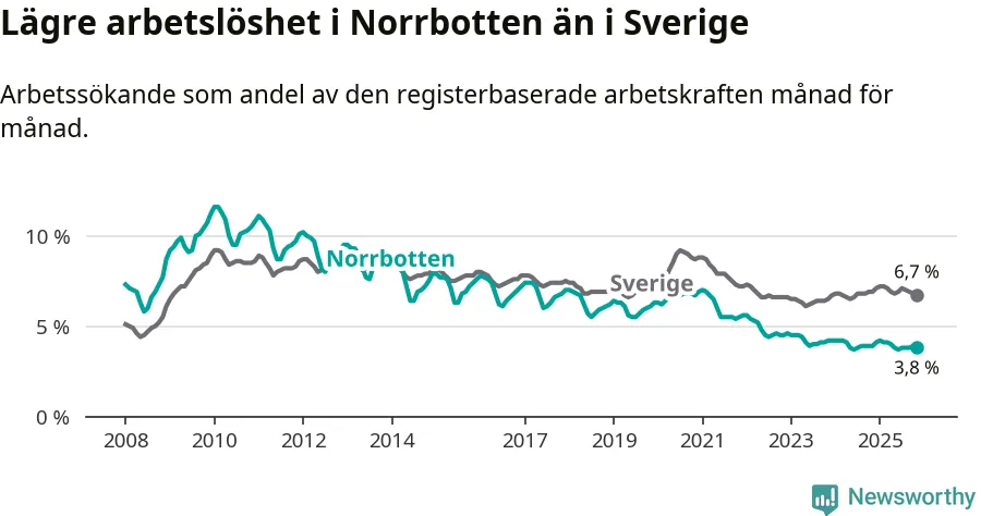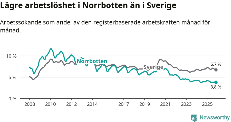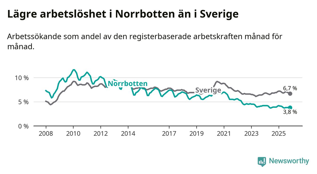 Norrbotten hade redan tidigare lägre arbetslöshet än snittet i hela Sverige och nu växer klyftan (3,8 procent i länet, jämfört med 6,7 procent i hela riket). Norrbotten har därmed även den lägsta arbetslöshetsnivån i riket. Skåne har den högsta (8,8 procent).