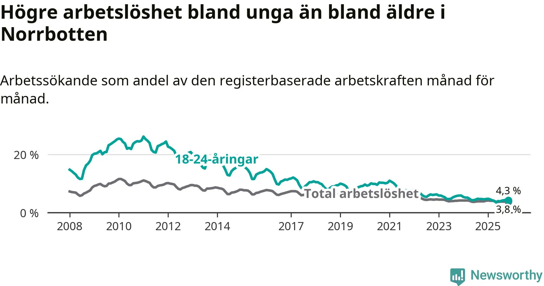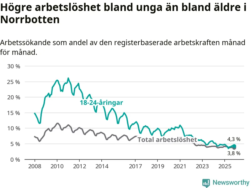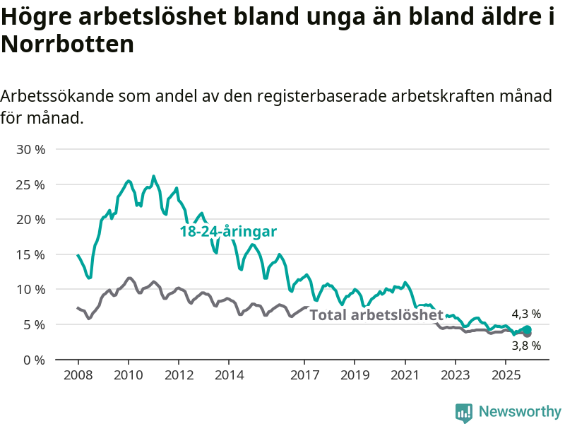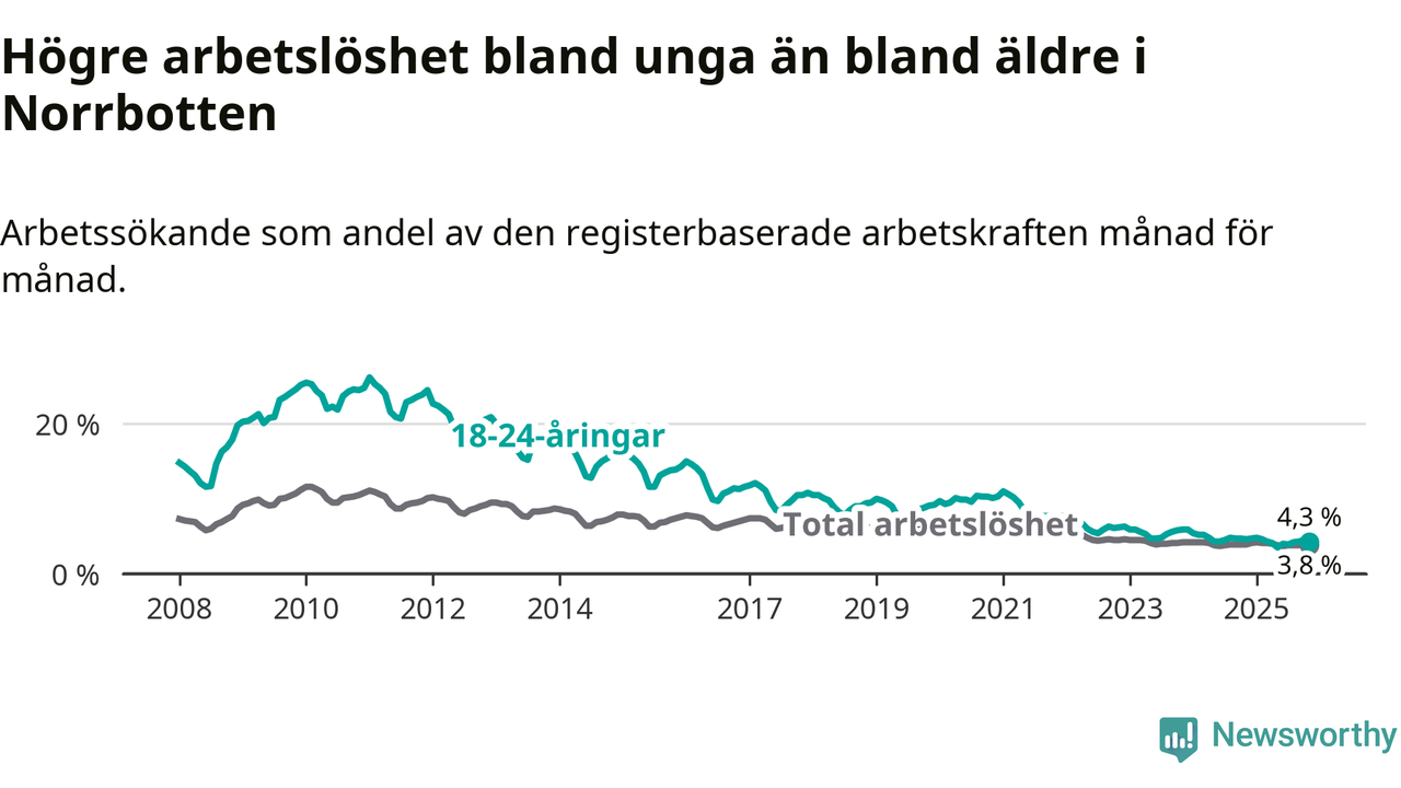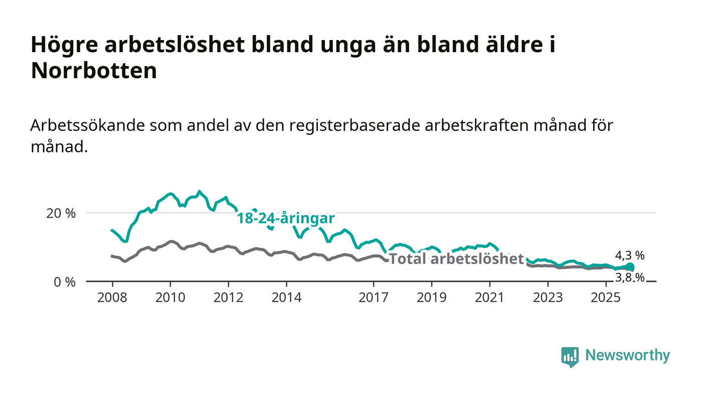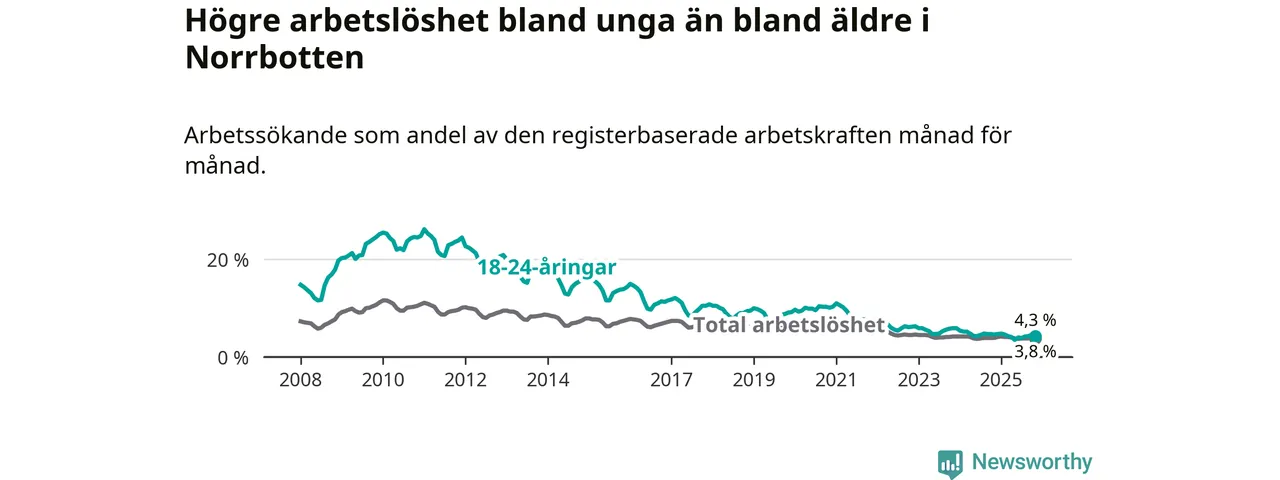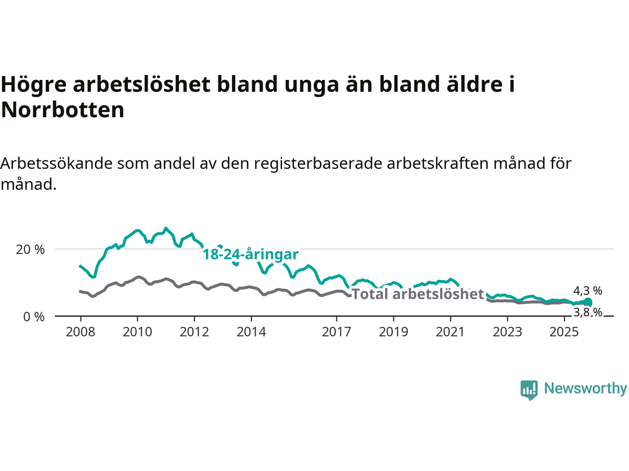I och med den senaste månadens nedgång har de ungas arbetslöshet i Norrbotten sjunkit över fyra år i sträck (ner från 10,2 procent i mars 2021 till 4,3 procent nu).