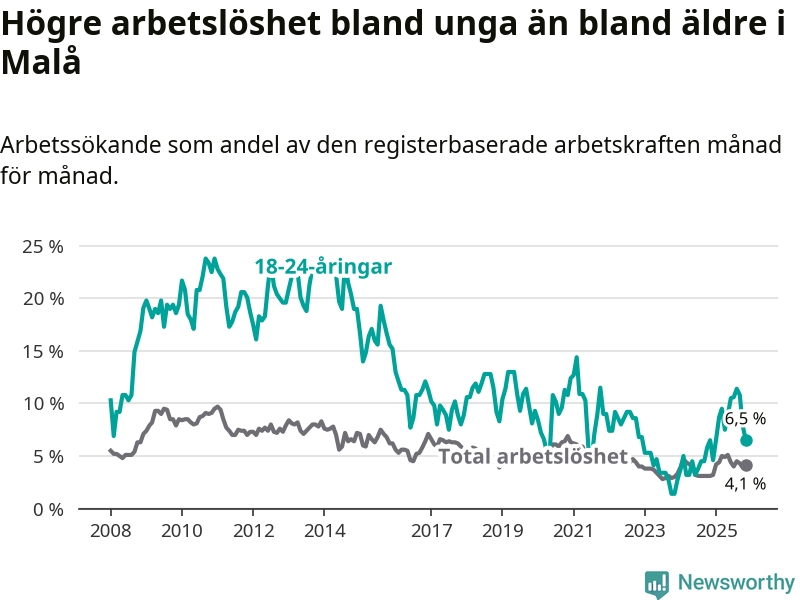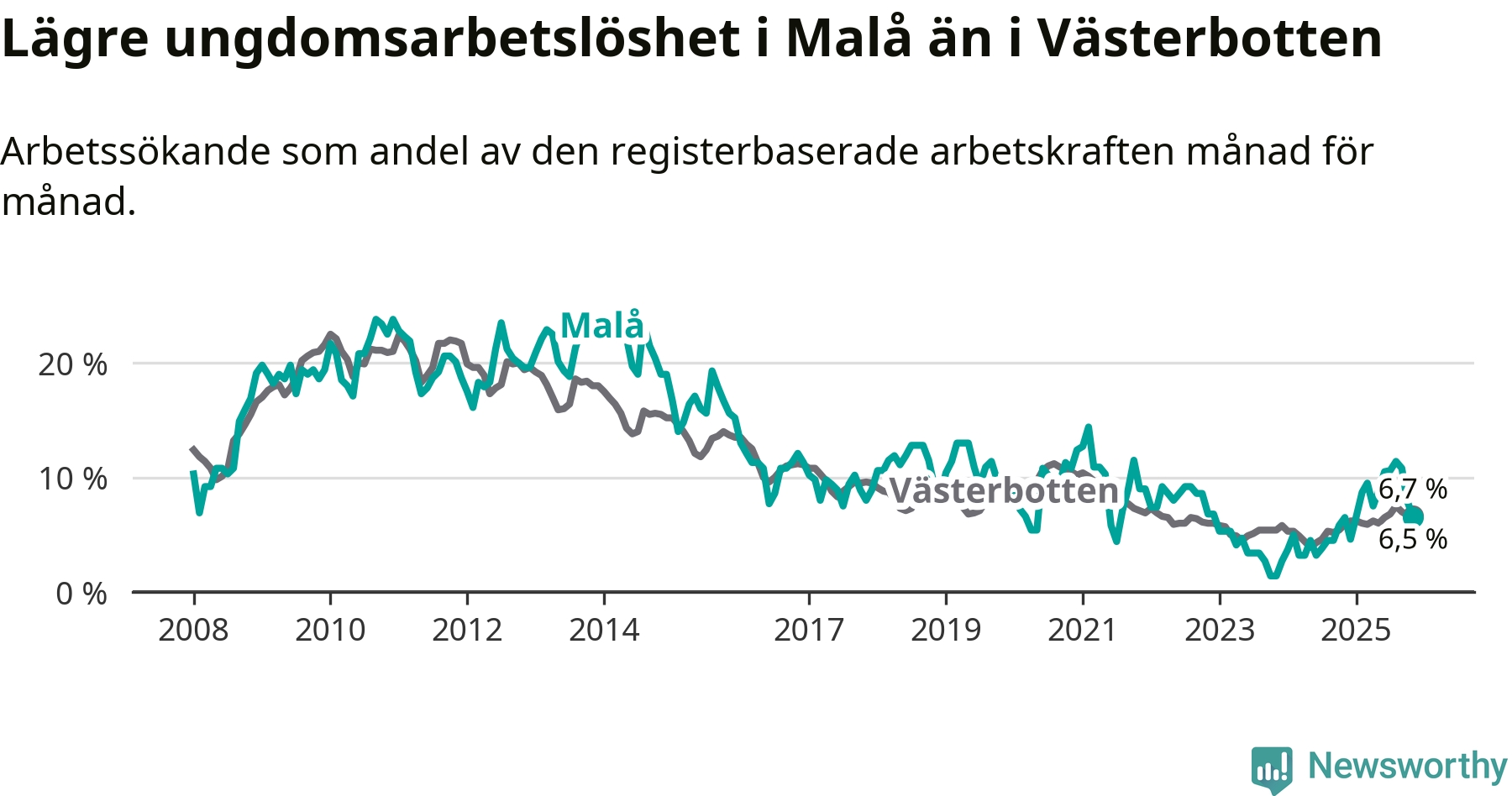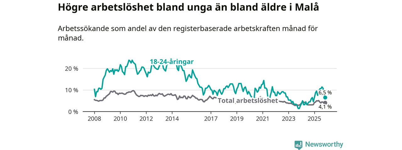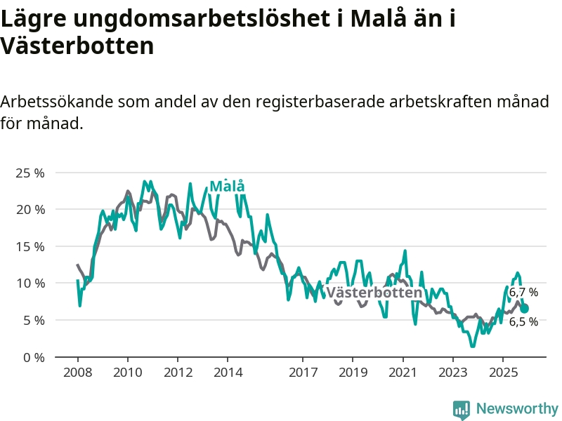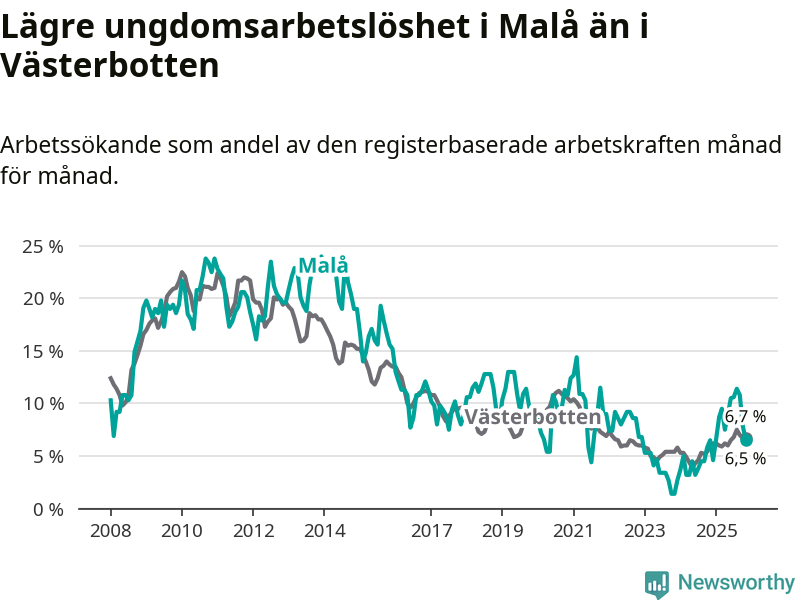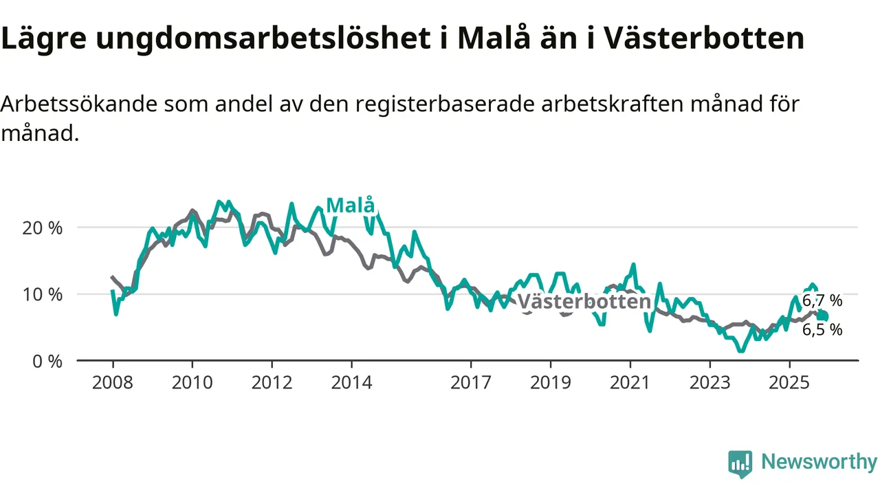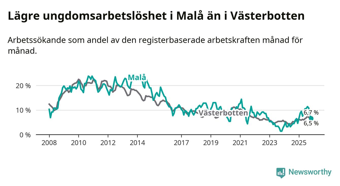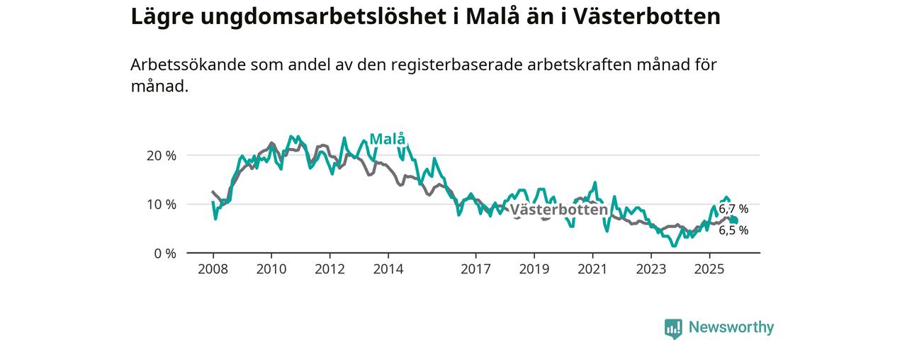 Precis som den totala arbetslösheten ligger ungdomsarbetslösheten i Malå lägre än i Västerbotten som helhet. Skillnaden mellan kommunen och länet är 0,2 procentenheter.