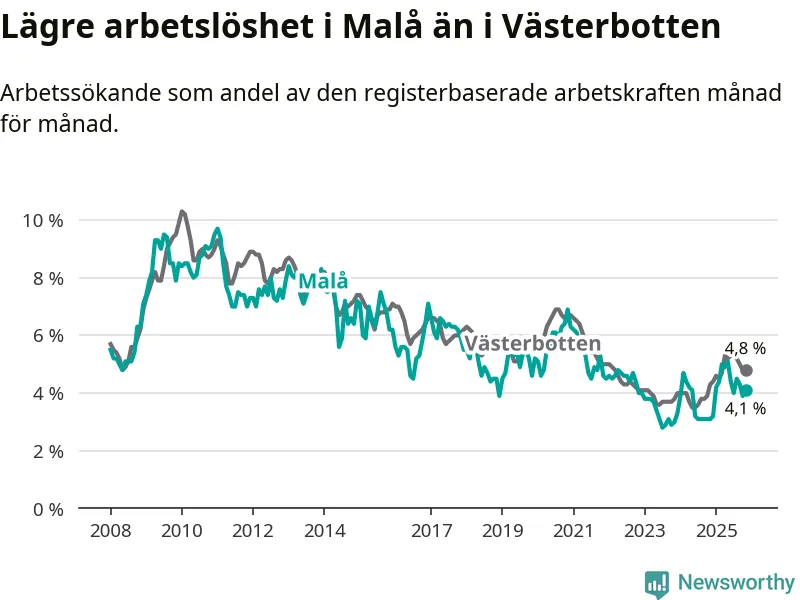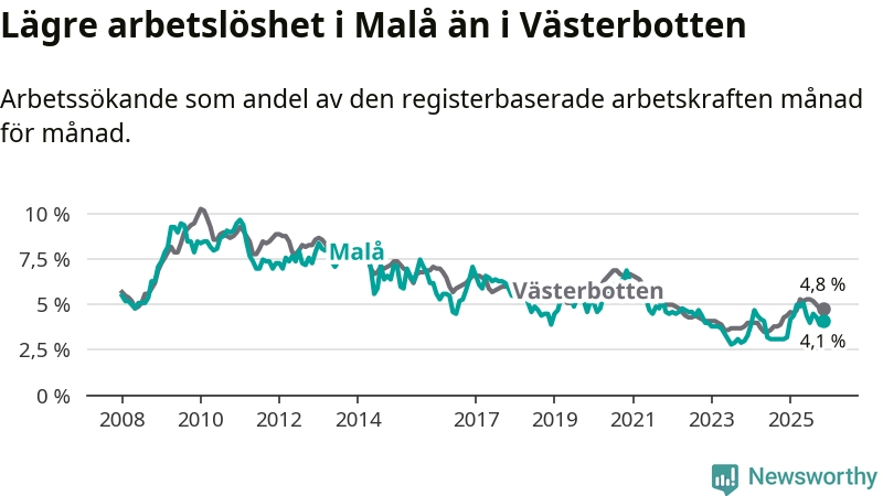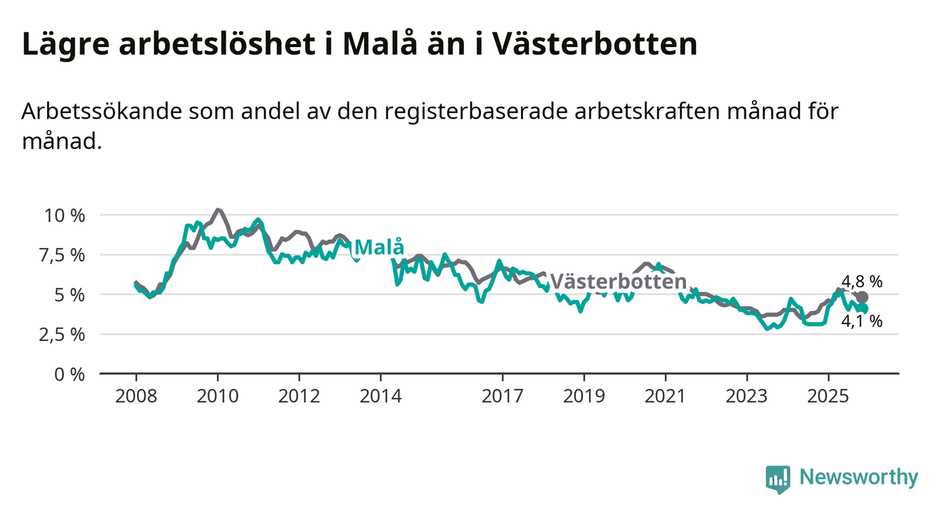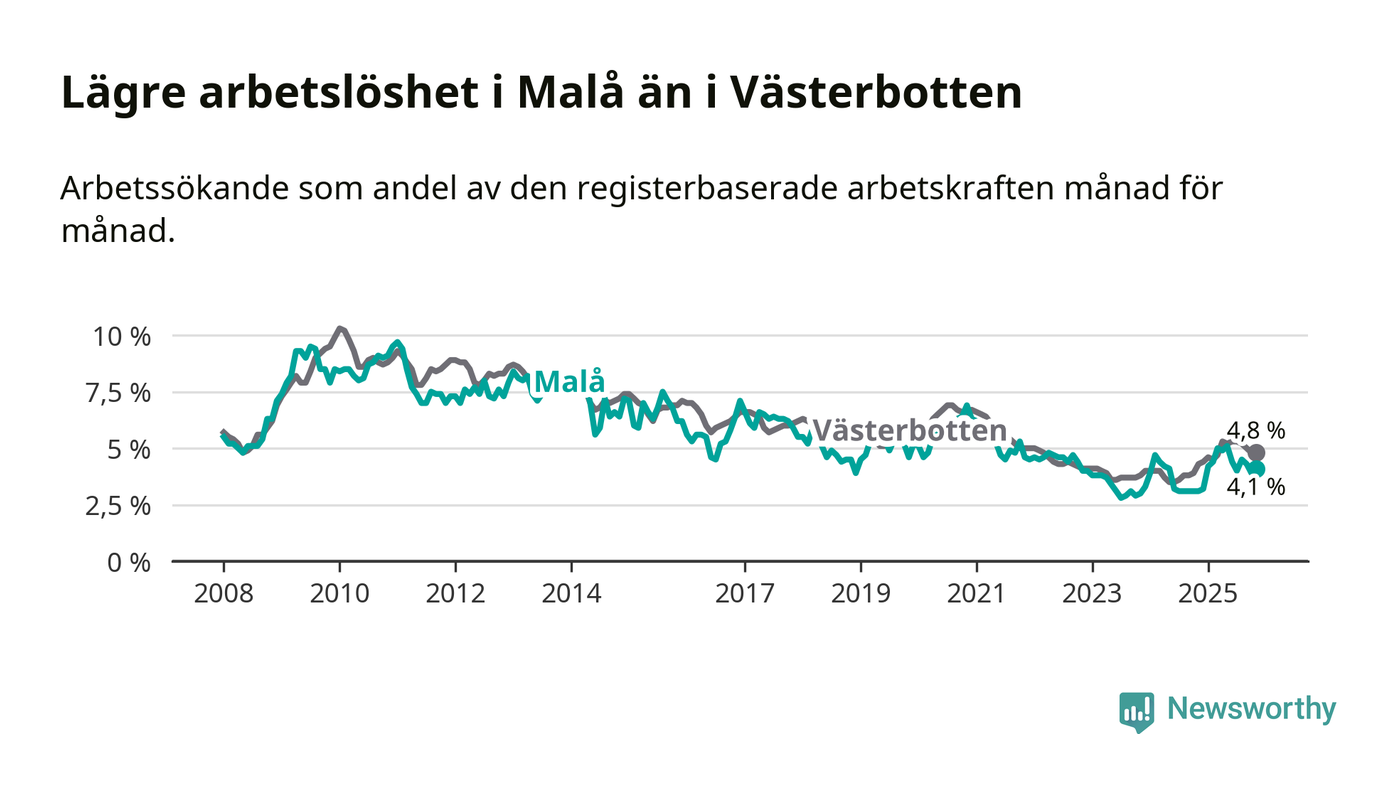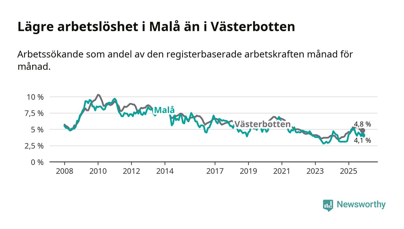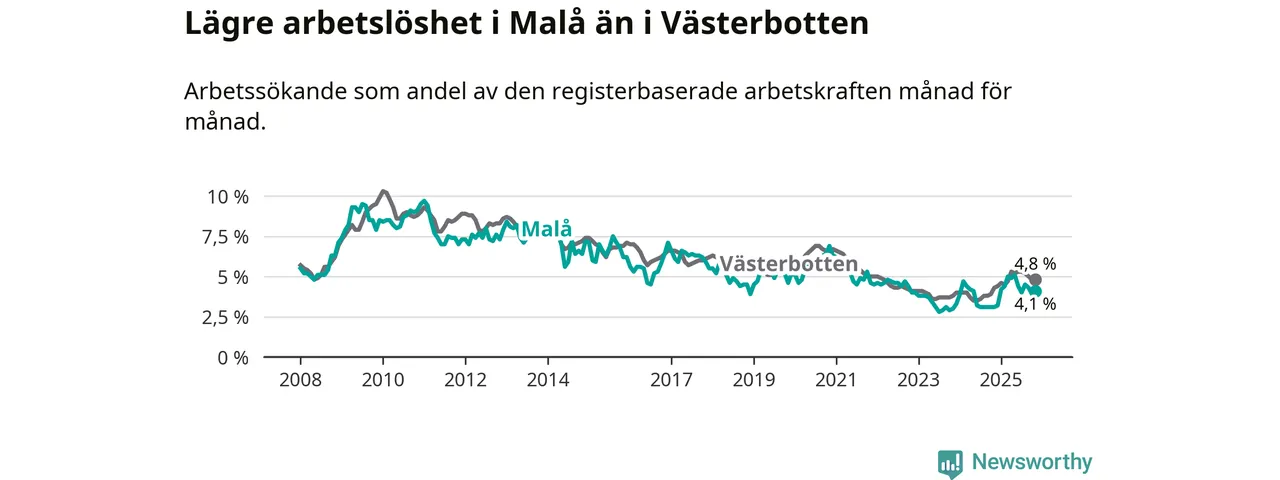 Även om arbetslösheten i Malå alltså ökar, så ligger den fortfarande under snittet i hela Västerbottens län (4,1 procent i kommunen, jämfört med 4,8 procent i hela länet). Sorsele har den lägsta arbetslösheten i länet (2,4 procent), medan Skellefteå har den högsta (6,3 procent). För att Malå skulle komma ner i samma arbetslöshetsnivå som Sorsele skulle 22 personer behöva sysselsättas.