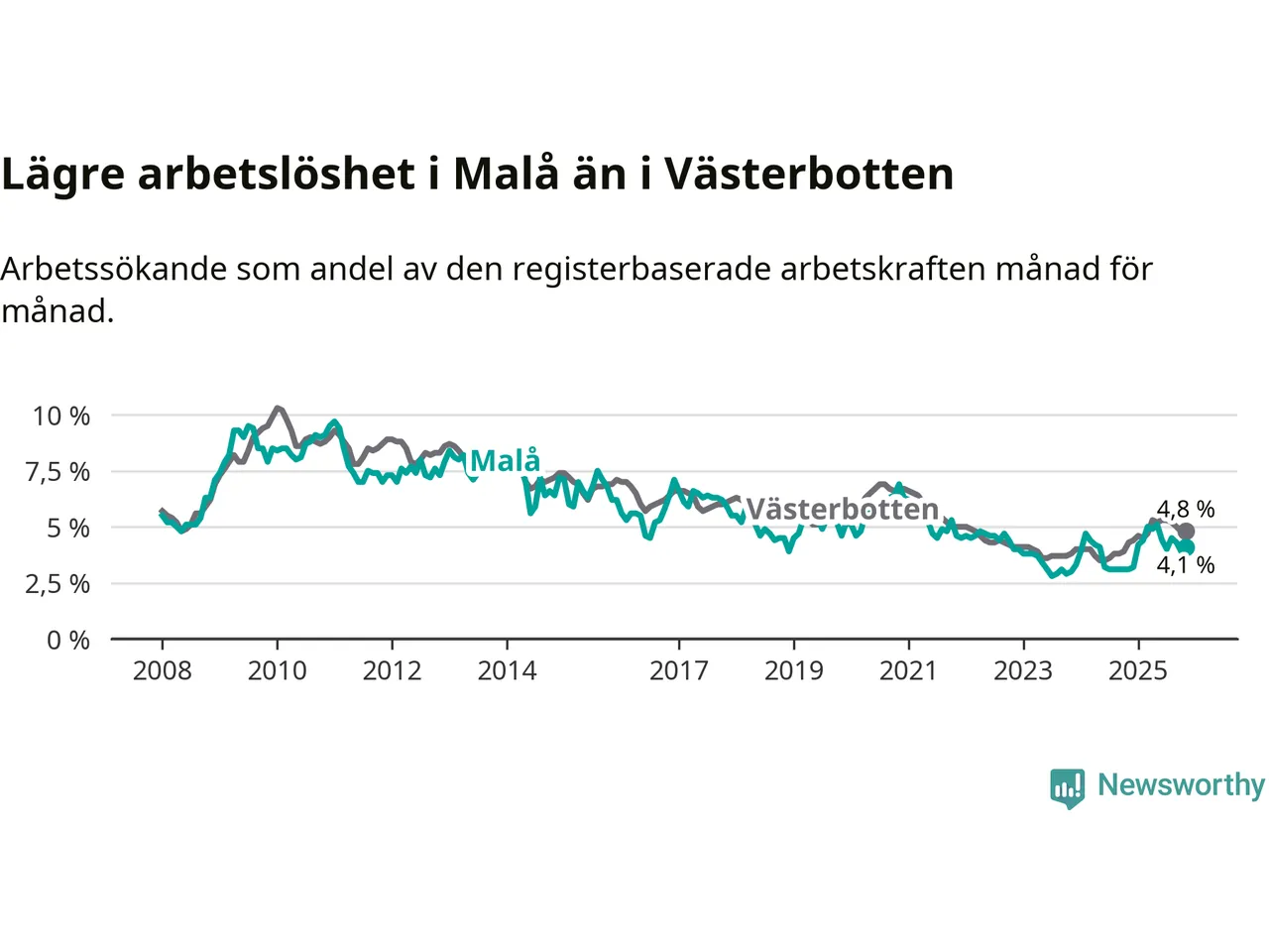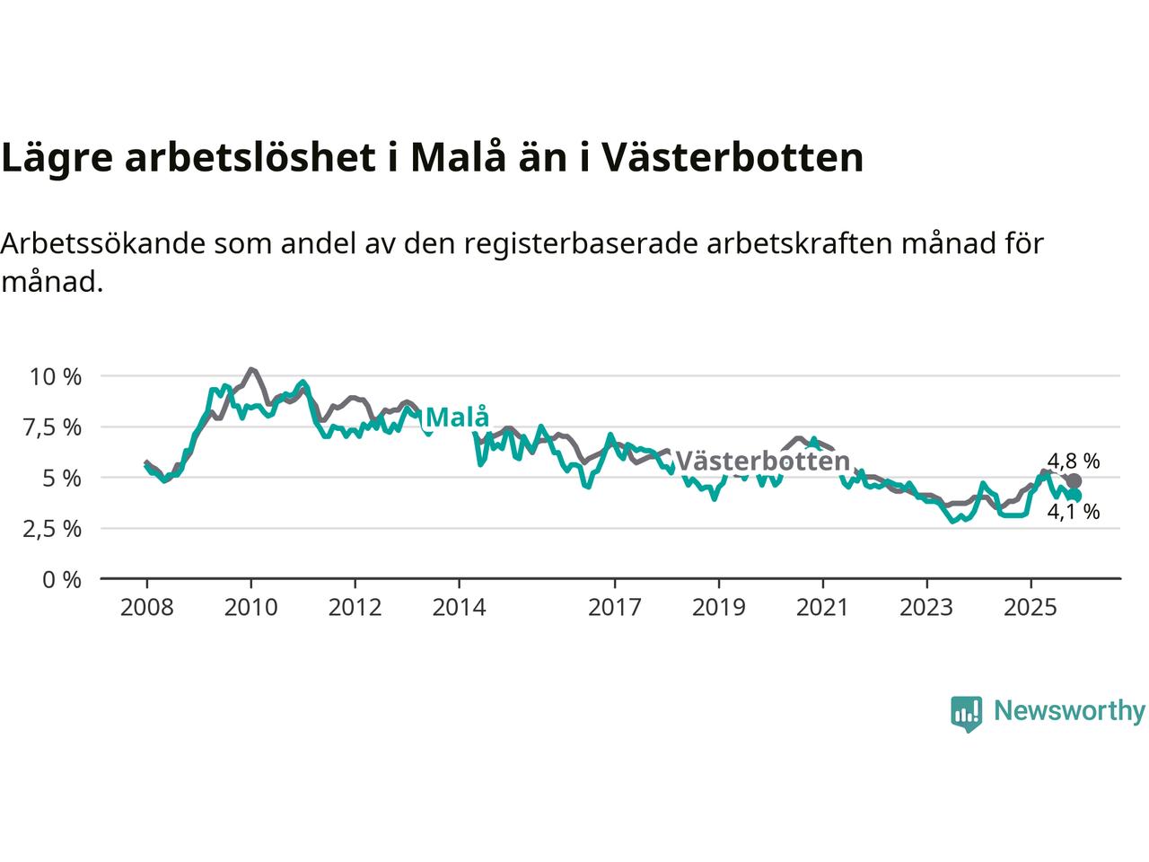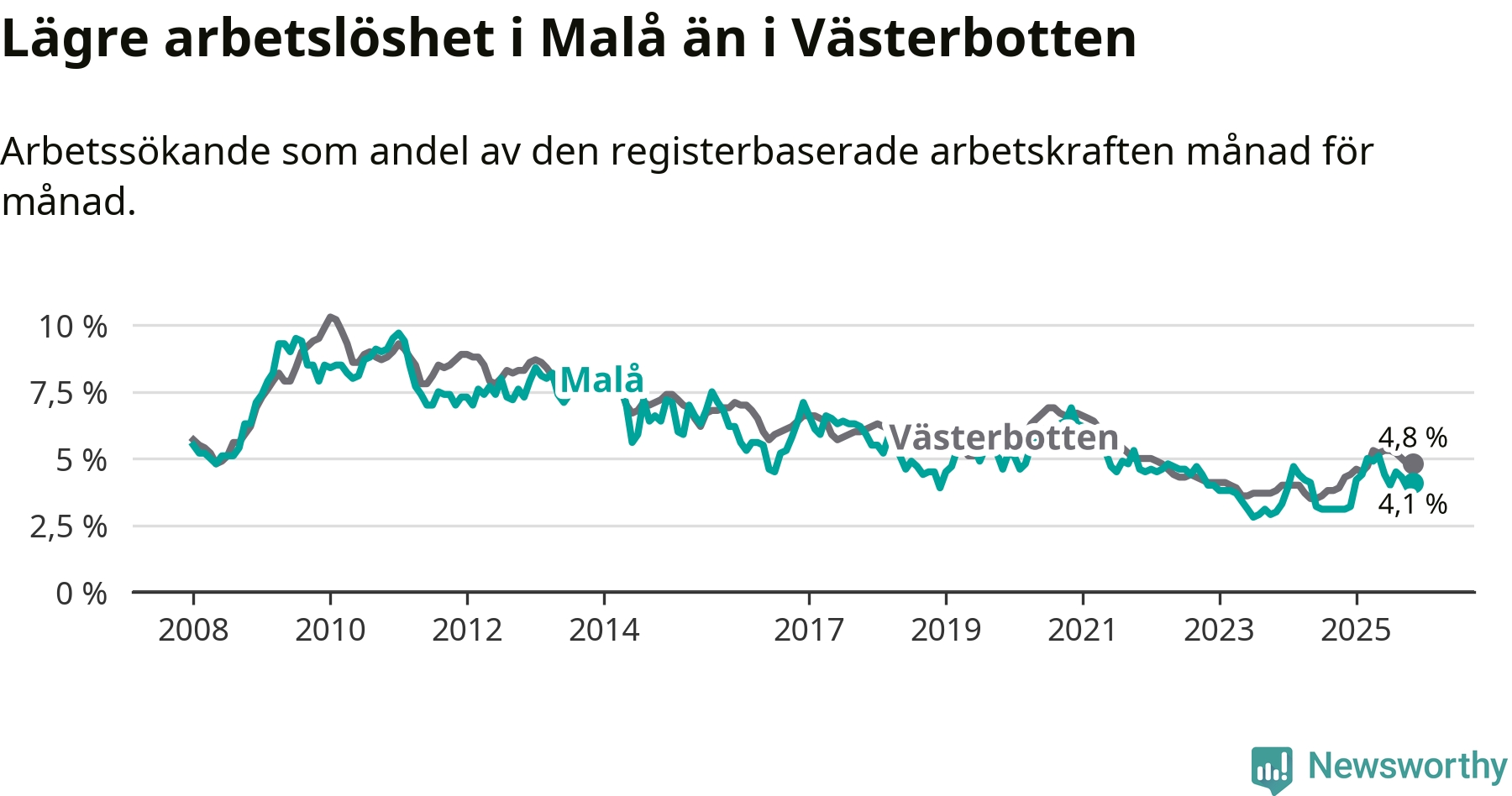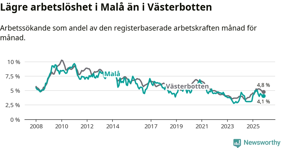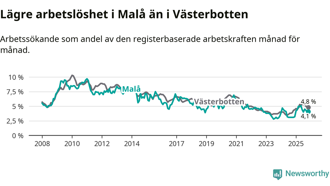 Även om arbetslösheten i Malå alltså ökar, så ligger den fortfarande under snittet i hela Västerbottens län (4,1 procent i kommunen, jämfört med 4,8 procent i hela länet). Sorsele har den lägsta arbetslösheten i länet (2,4 procent), medan Skellefteå har den högsta (6,3 procent). För att Malå skulle komma ner i samma arbetslöshetsnivå som Sorsele skulle 22 personer behöva sysselsättas.