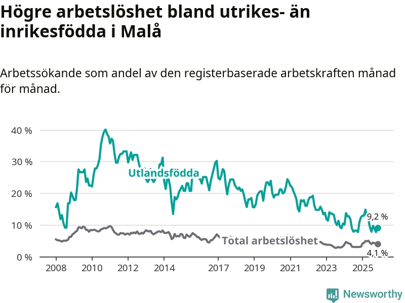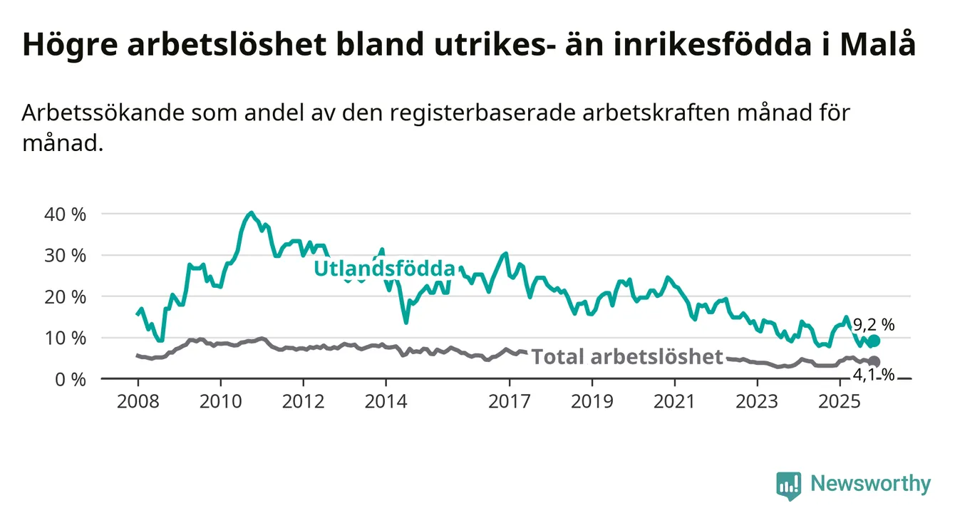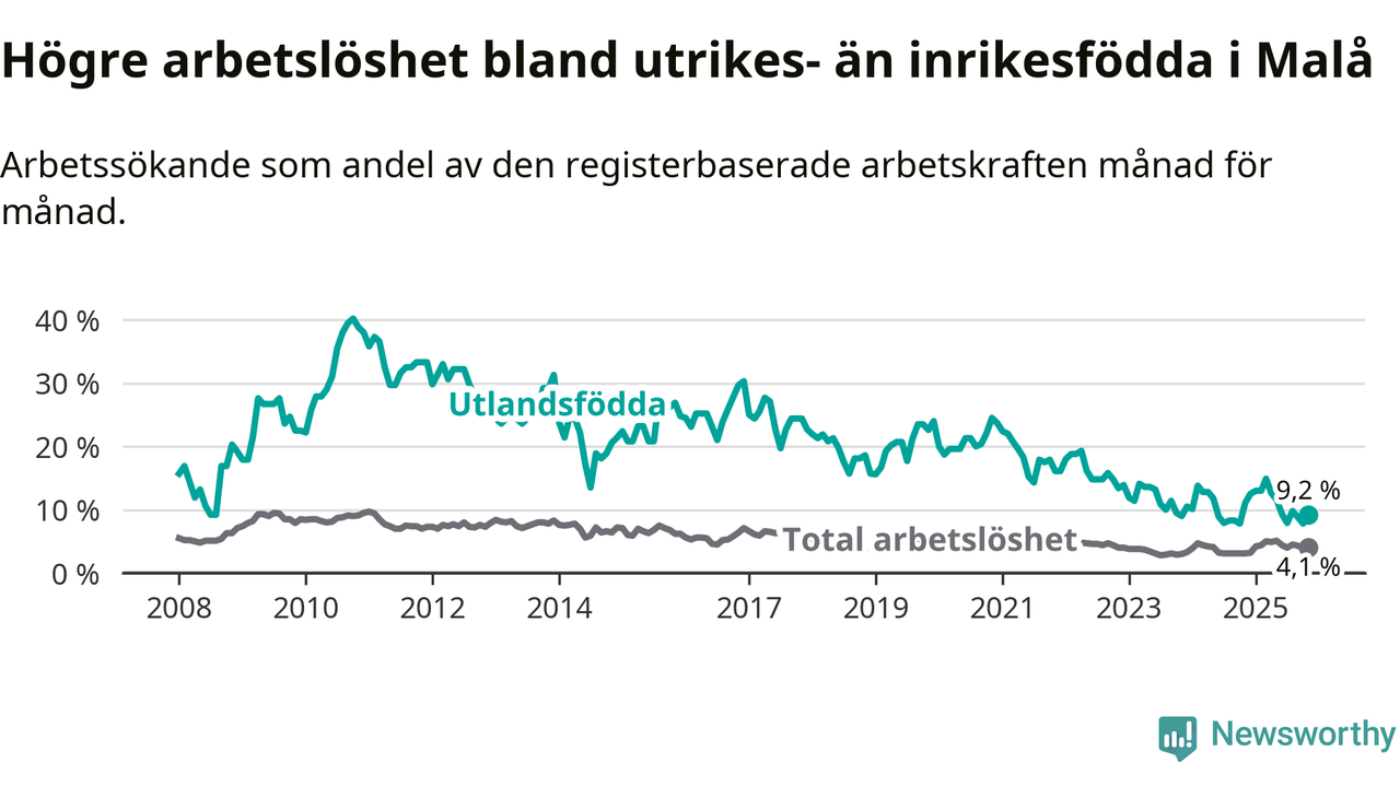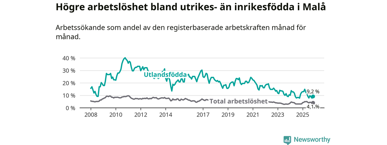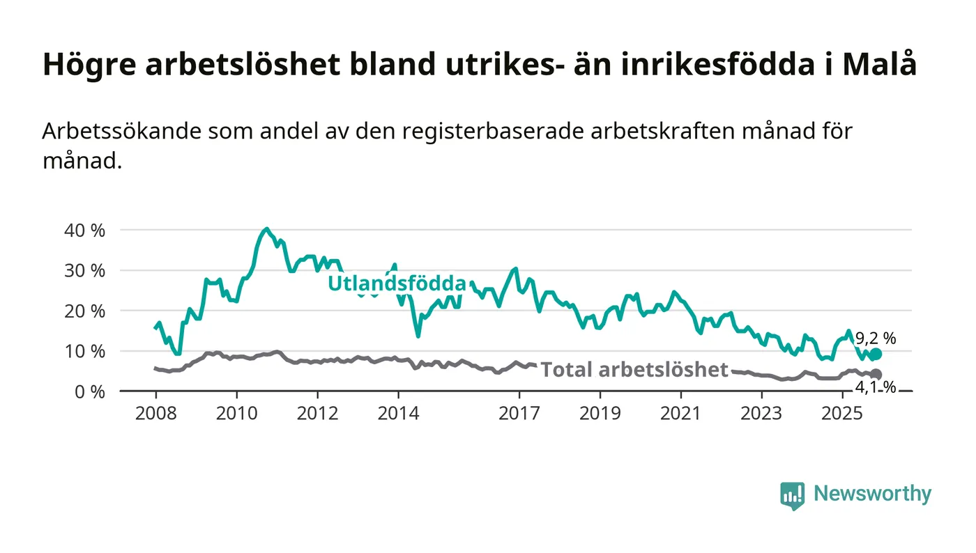Skillnaden i arbetslöshet mellan utrikesfödda och hela befolkningen är 5,1 procentenheter i Malå. Det är en betydligt mindre skillnad än för ett år sedan (−2,9 procentenheter).
