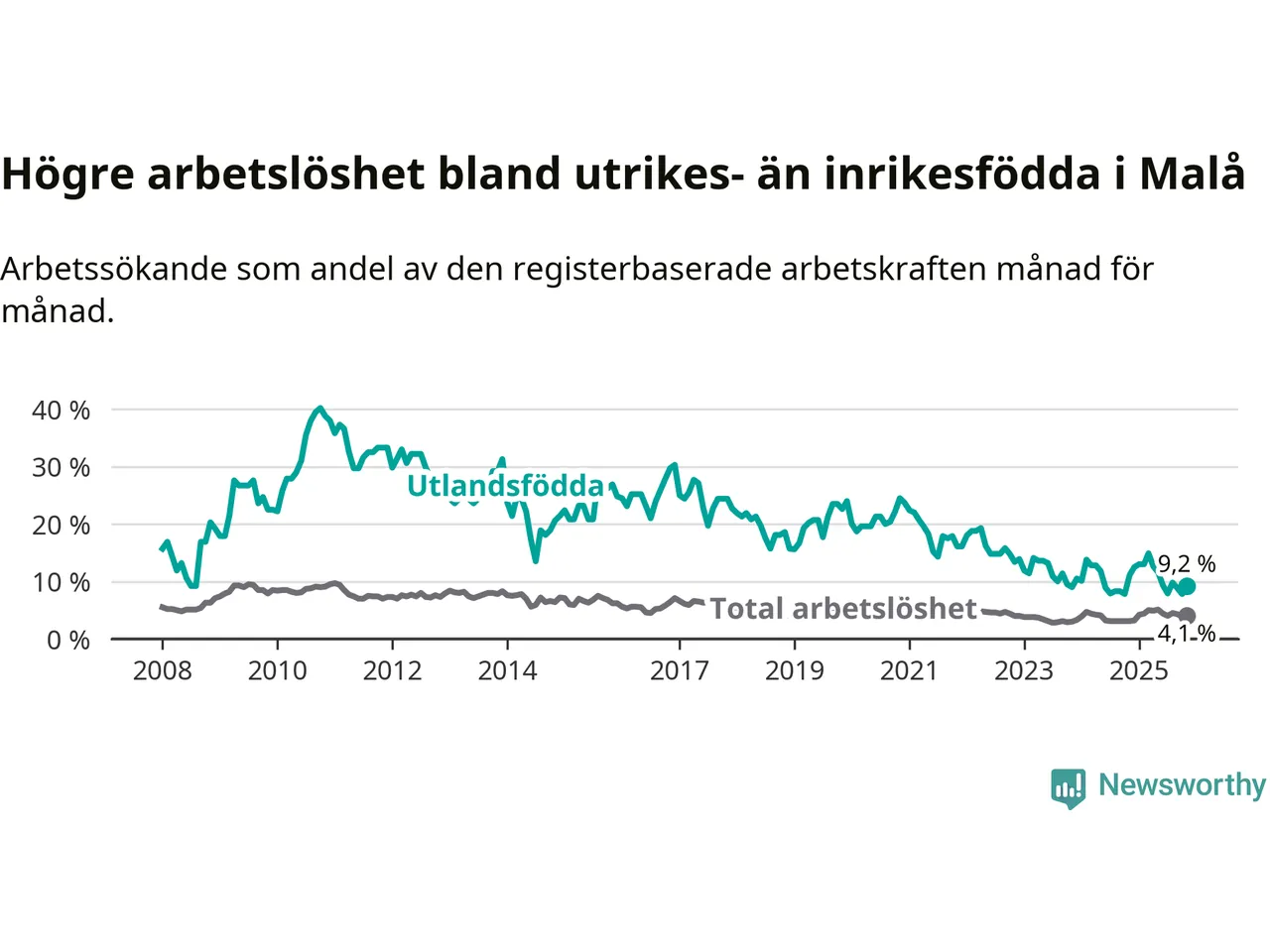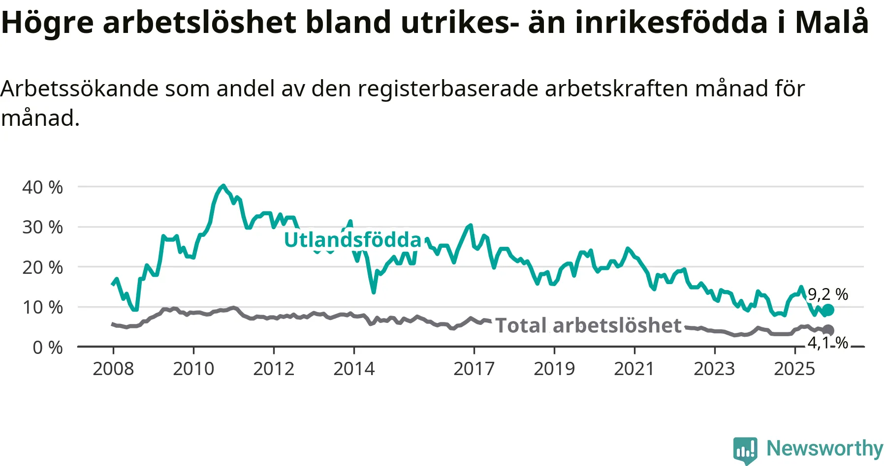 | Bland utlandsfödda | 9,2 % | −1,9 % ▼ | 11,7 % | +0,6 % ▲ | 14,3 % | −1,1 % ▼ |