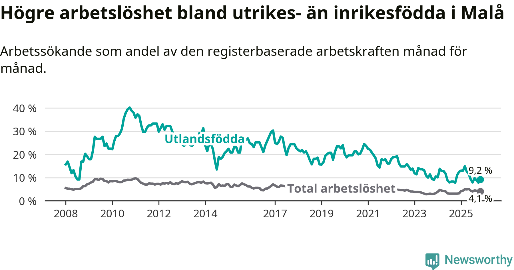 Arbetslösheten bland utlandsfödda var 9,2 procent i Malå under november månad, motsvarande 20 av 217 personer. Det är 1,9 procentenheter färre än vid samma tidpunkt i fjol (−4 om man räknar personer). Den senaste månadens nedgång innebär ett trendbrott. Under de ett föregående månaderna hade arbetslösheten bland utlandsfödda varit högre än motsvarande tidpunkt året innan.