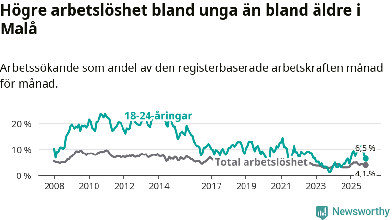 Till skillnad från den totala arbetslösheten står arbetslösheten bland unga stilla. I november var 6,5 procent av 18–24-åringarna inskrivna som arbetssökande (motsvarande nio personer).