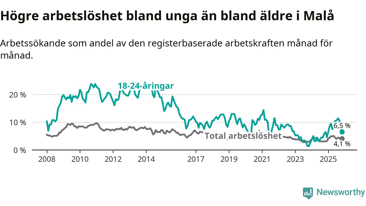 Under november månad rapporterade Malå kommun en total arbetslöshet på 4,1 procent. Det är en ökning jämfört med samma tidpunkt i fjol (+1,0 procentenheter). Även i Västerbottens län stiger arbetslösheten .