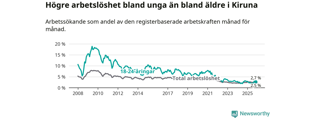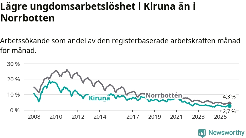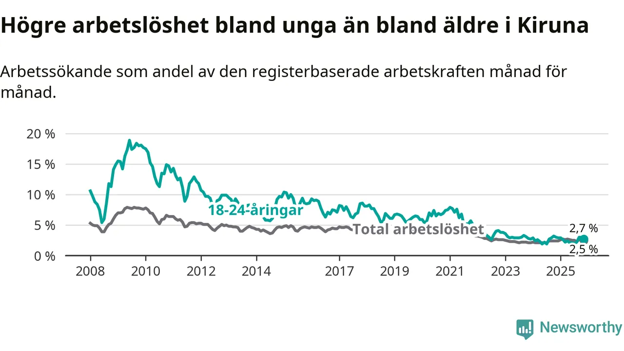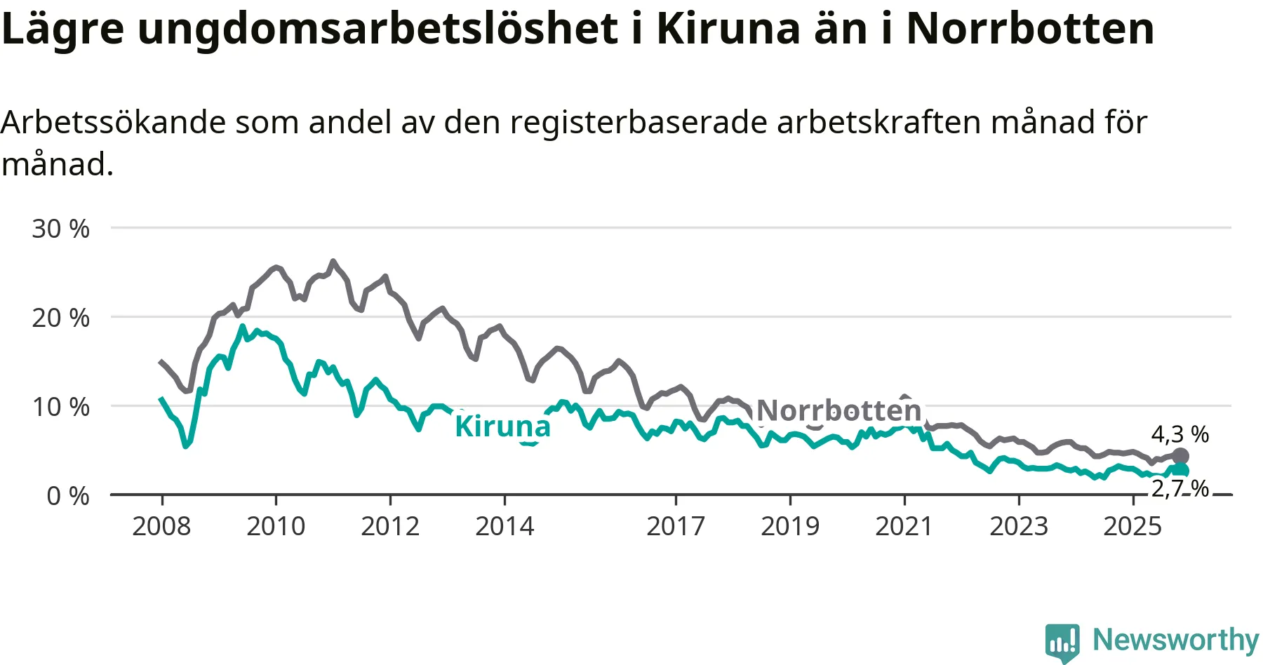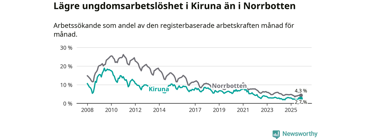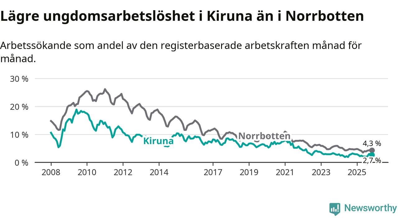 Precis som den totala arbetslösheten ligger ungdomsarbetslösheten i Kiruna lägre än i Norrbotten som helhet. Skillnaden mellan kommunen och länet är 1,6 procentenheter.