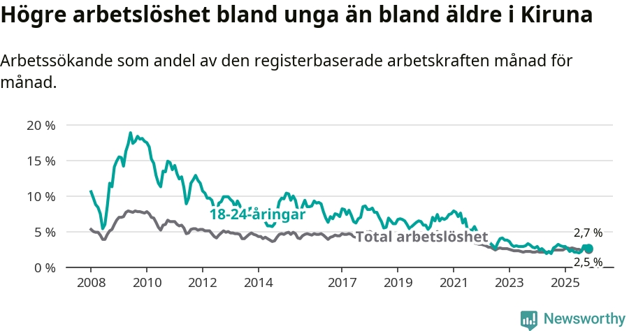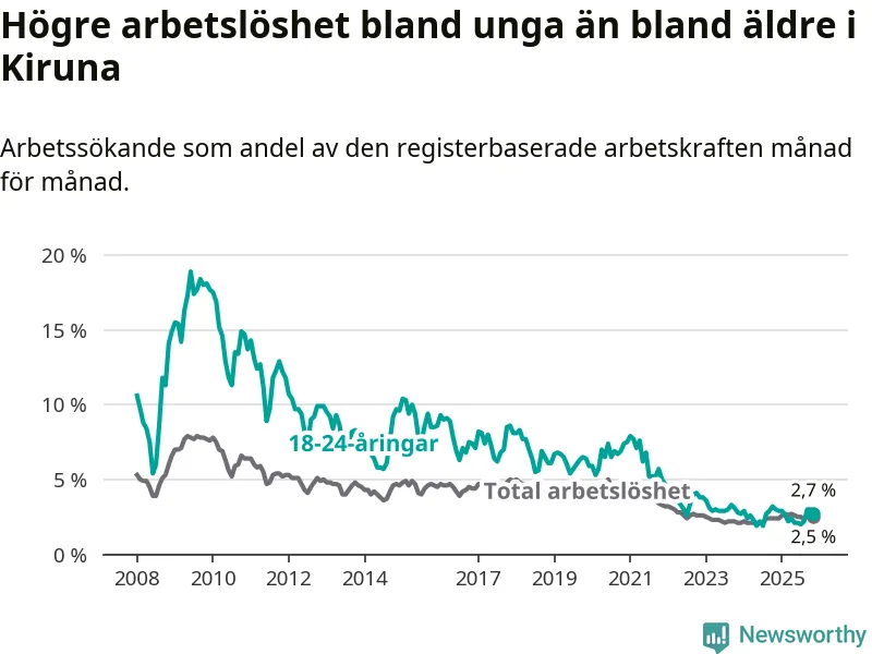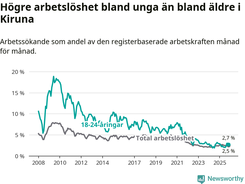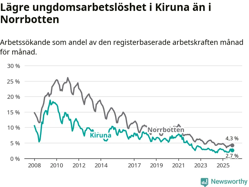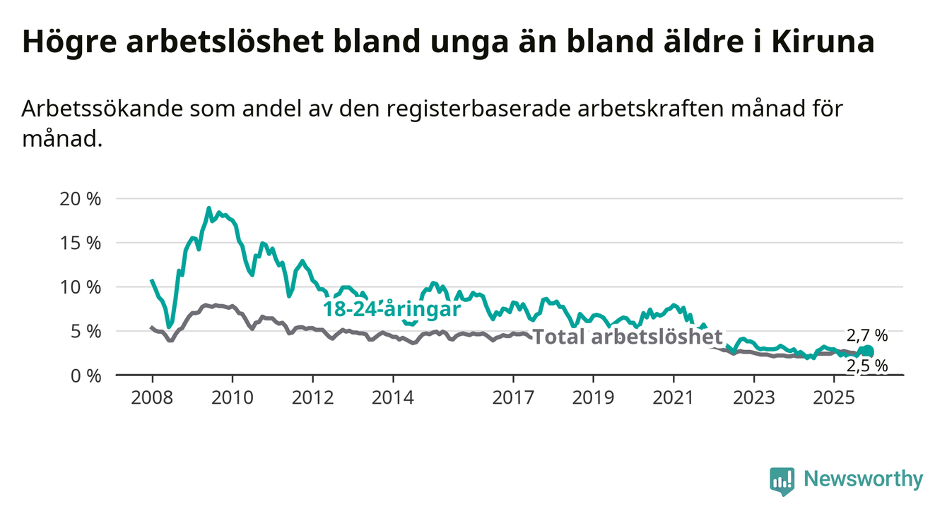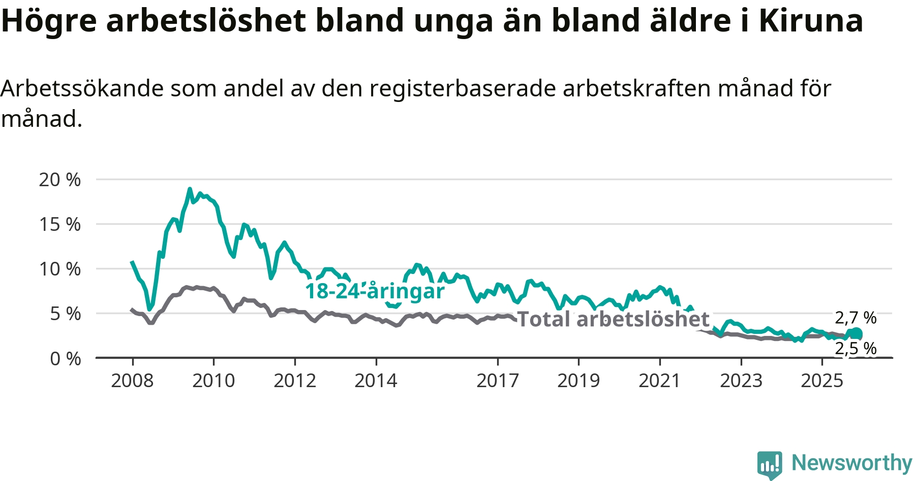 Precis som den totala arbetslösheten ligger ungdomsarbetslösheten i Kiruna lägre än i Norrbotten som helhet. Skillnaden mellan kommunen och länet är 1,6 procentenheter.