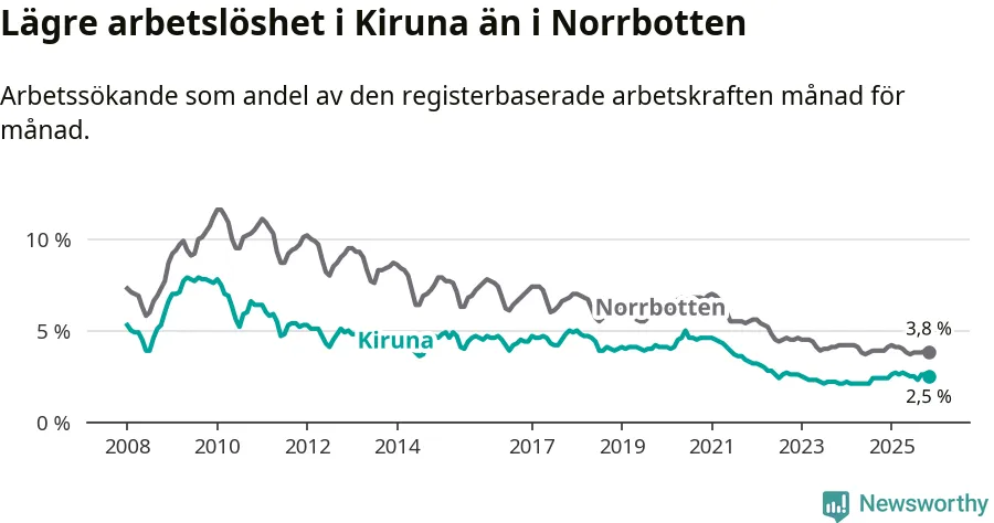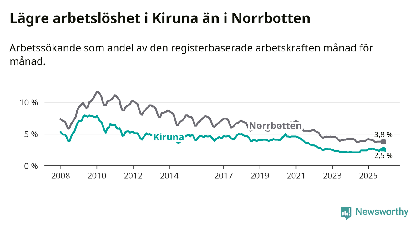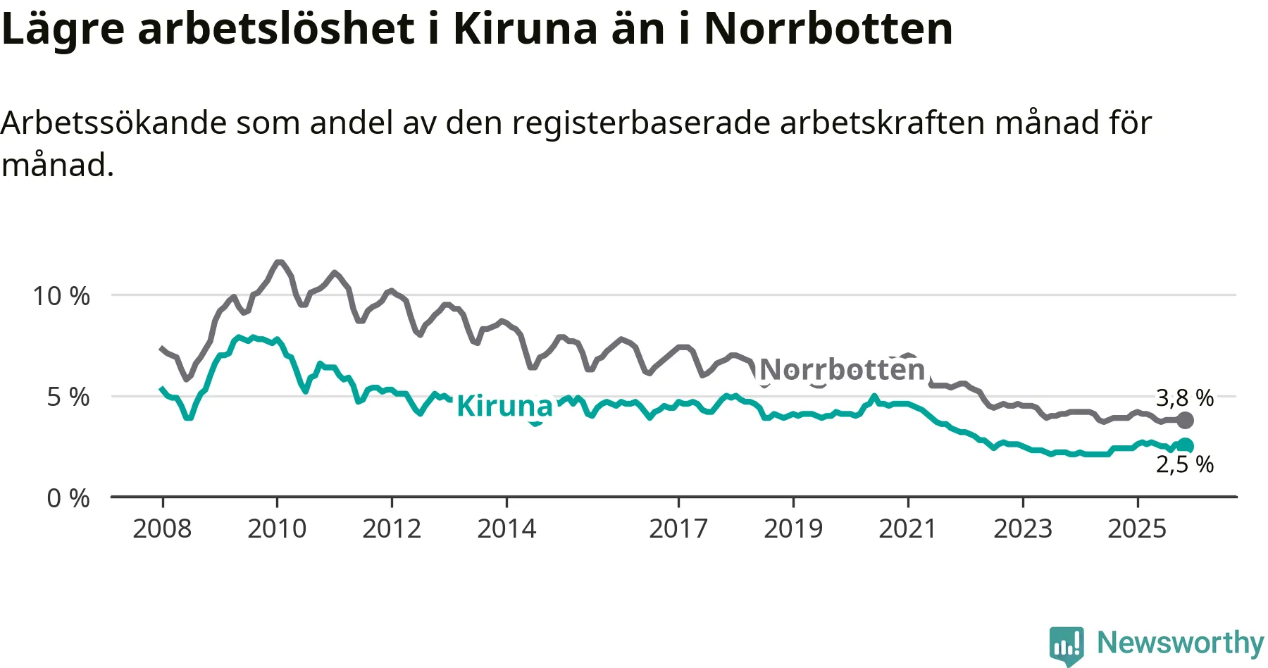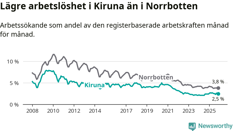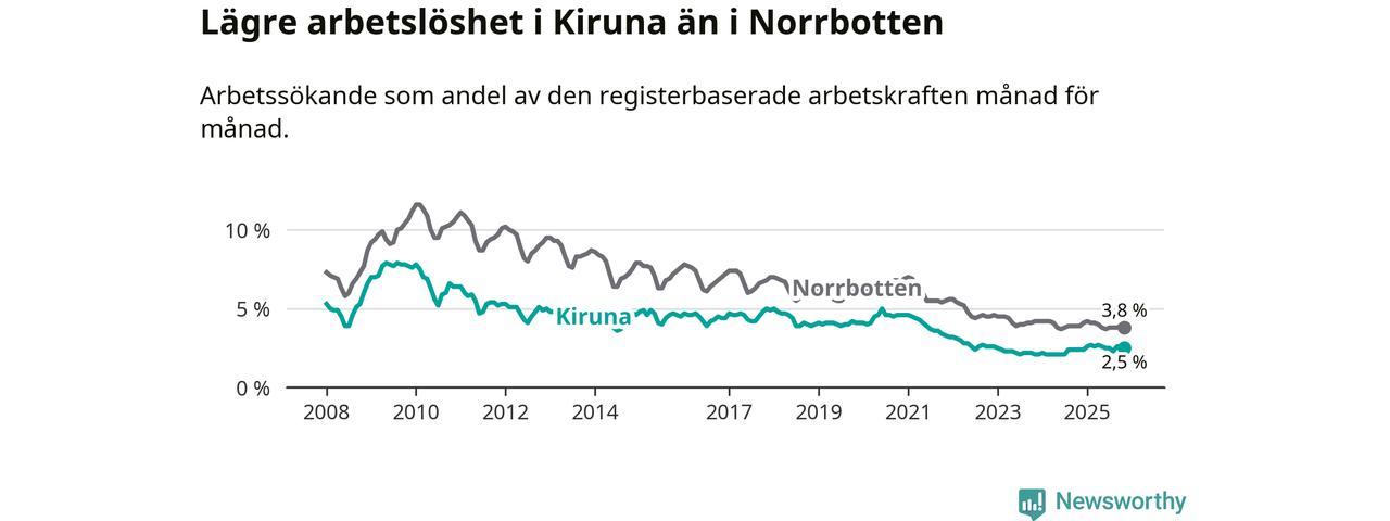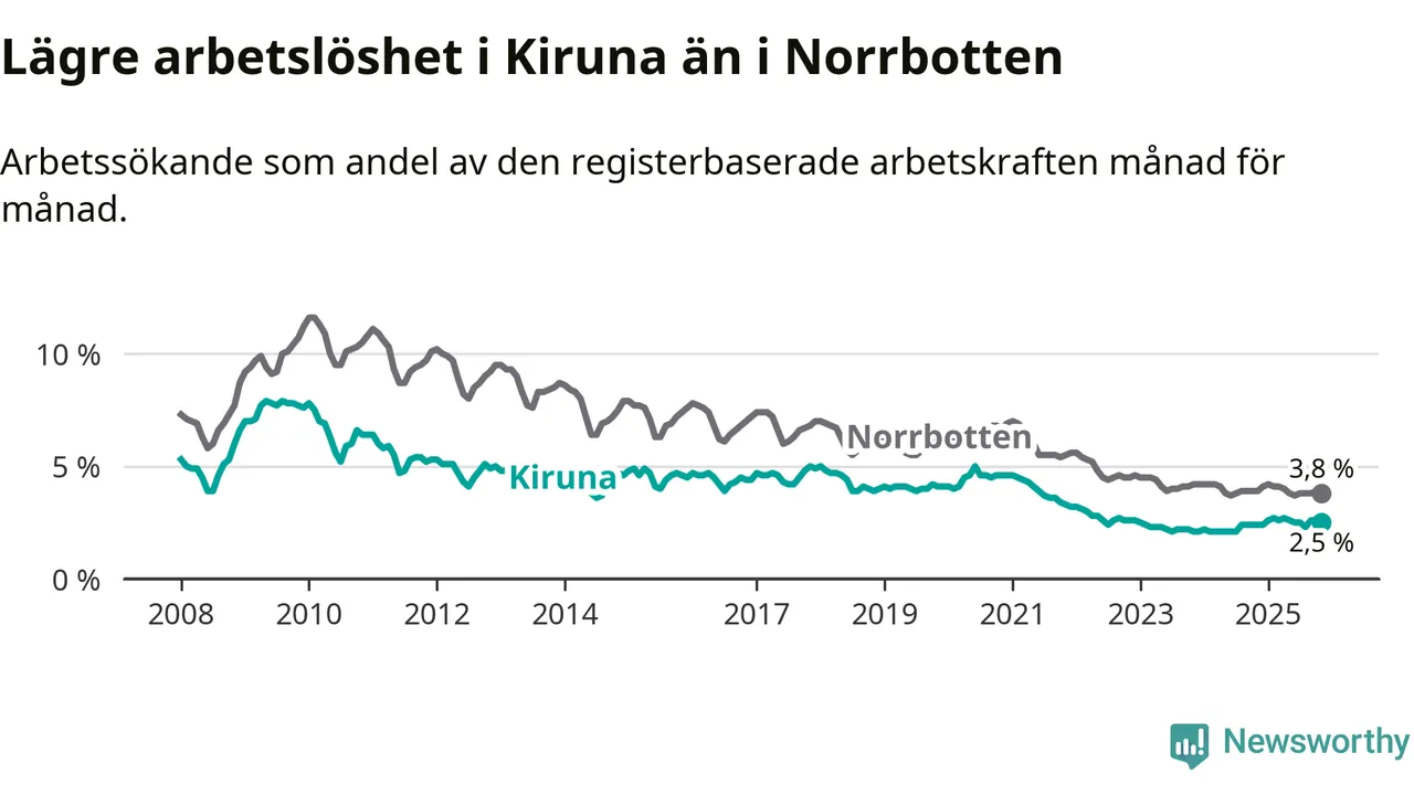 Även om arbetslösheten i Kiruna alltså ökar, så ligger den fortfarande under snittet i hela Norrbottens län (2,5 procent i kommunen, jämfört med 3,8 procent i hela länet). Kiruna har därmed även den lägsta arbetslöshetsnivån i länet. Haparanda har den högsta (7,0 procent).