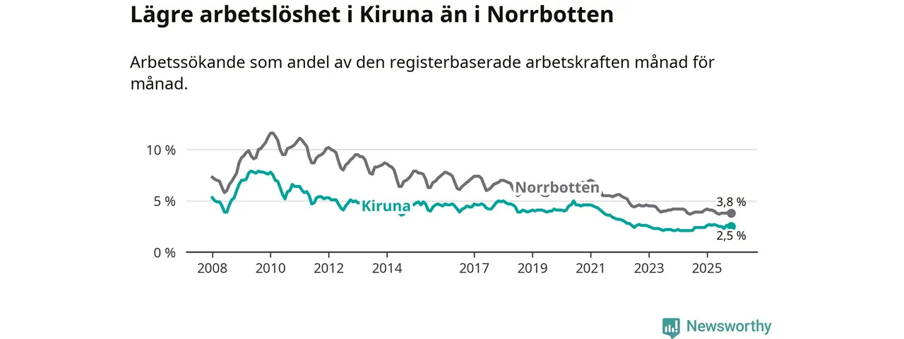 Under november månad rapporterade Kiruna kommun en total arbetslöshet på 2,5 procent. Det är en ökning jämfört med samma tidpunkt i fjol (+0,1 procentenheter). I Norrbottens län däremot sjunker arbetslösheten något.