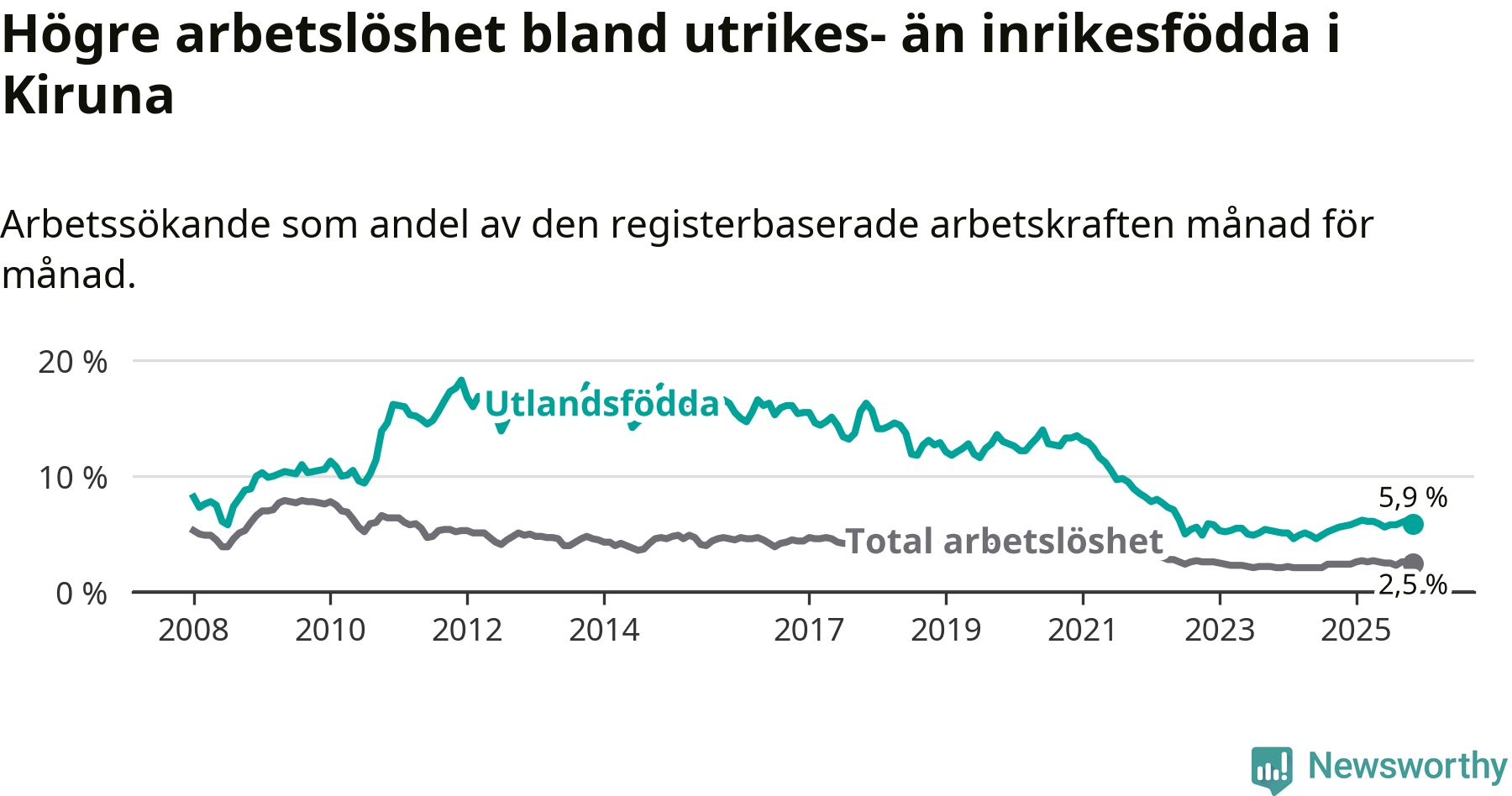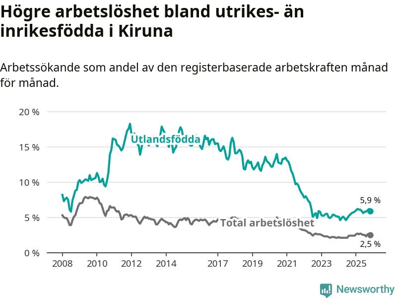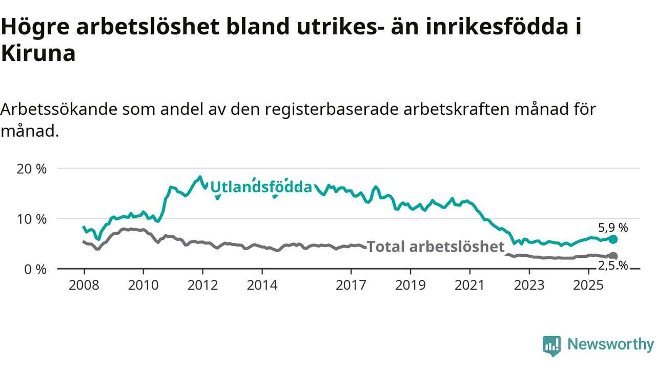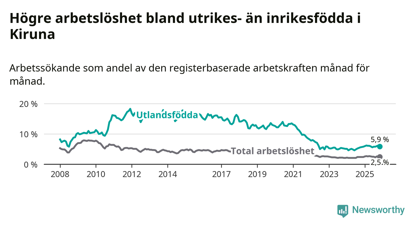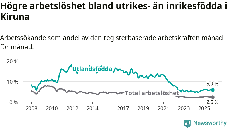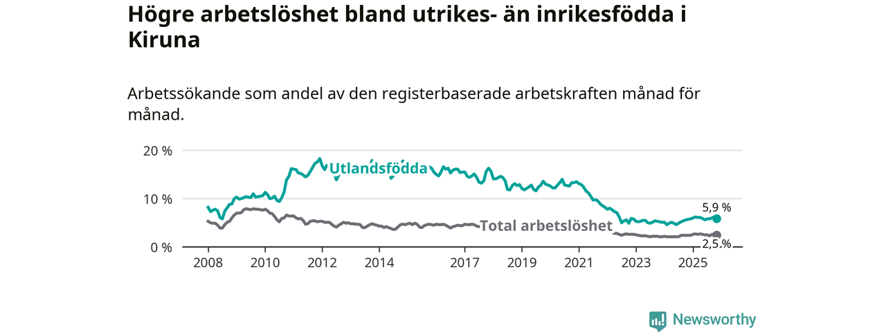 Arbetslösheten bland utlandsfödda var 5,9 procent i Kiruna under november månad, motsvarande 119 av 2 017 personer. Det är 0,2 procentenheter fler än vid samma tidpunkt i fjol (+10 om man räknar personer). Därmed är de utlandsföddas arbetslöshet högre än vid samma tidpunkt i fjol för 14:e månaden i följd.