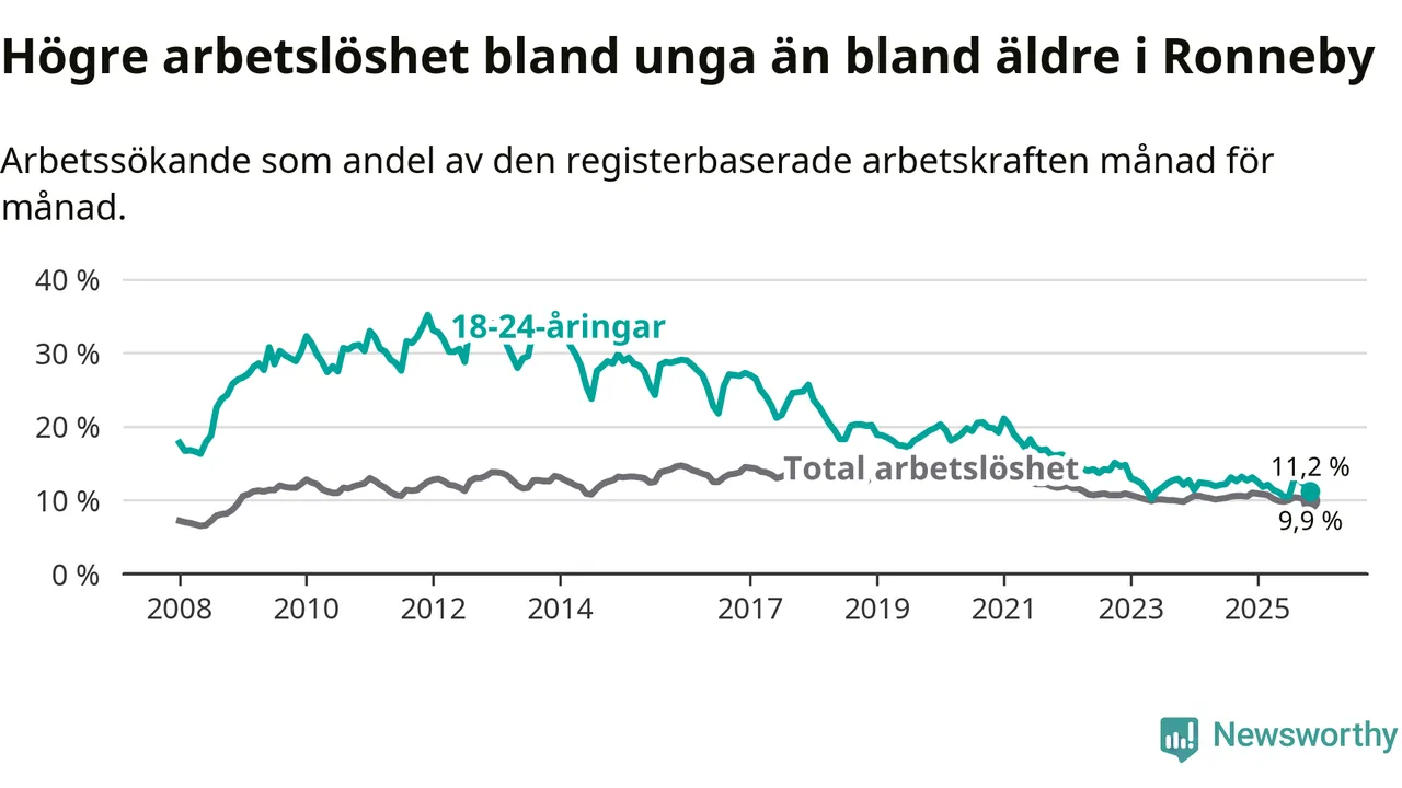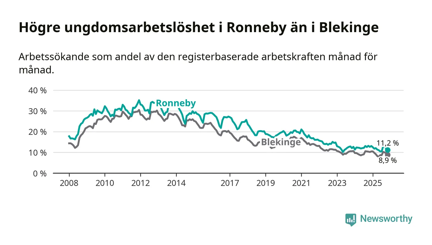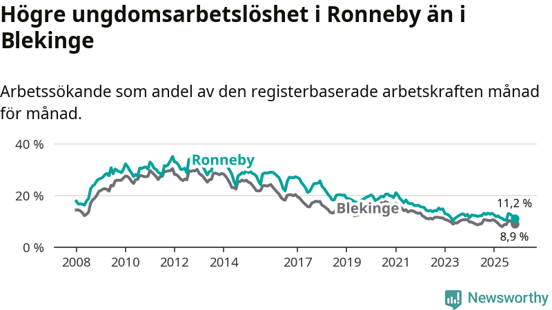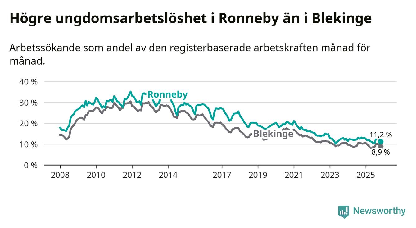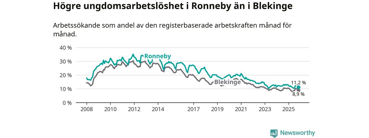 Precis som den totala arbetslösheten ligger ungdomsarbetslösheten i Ronneby högre än i Blekinge som helhet. Skillnaden mellan kommunen och länet är 2,3 procentenheter.