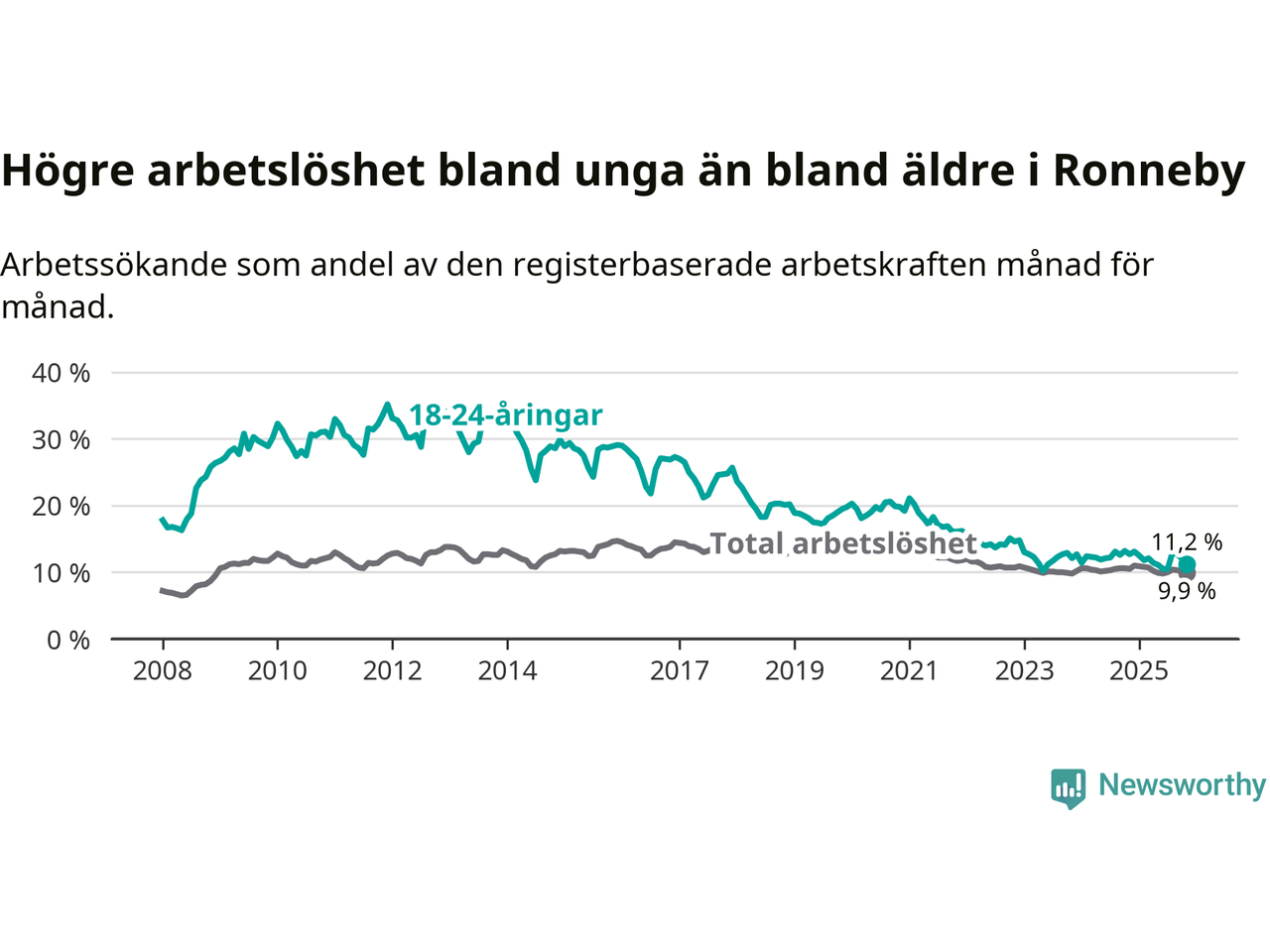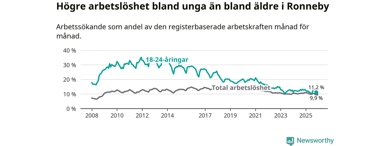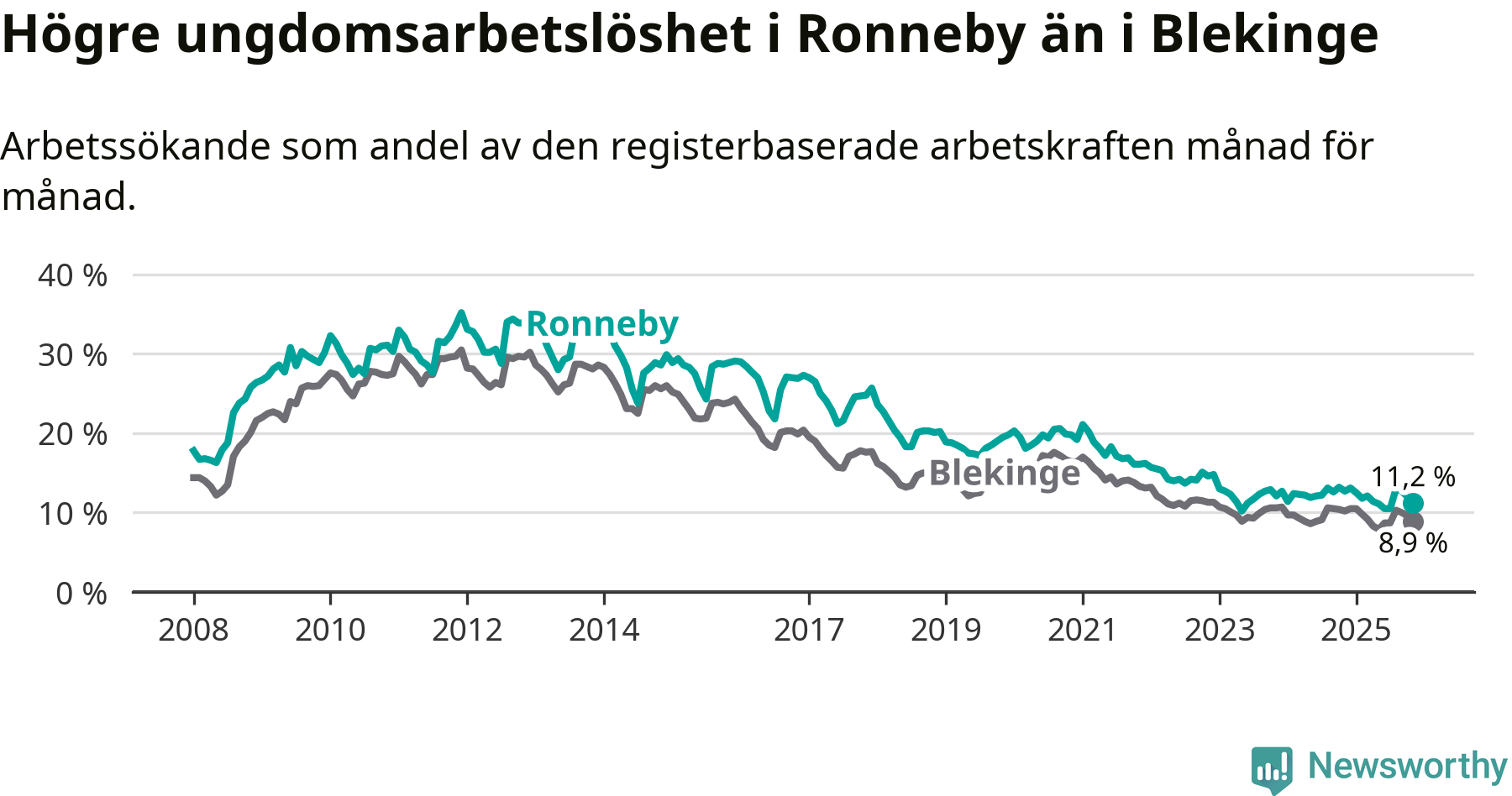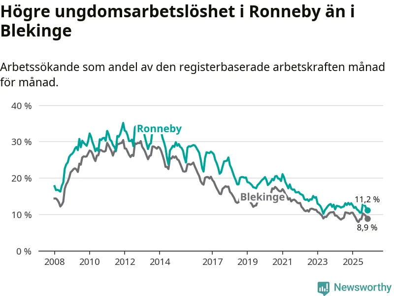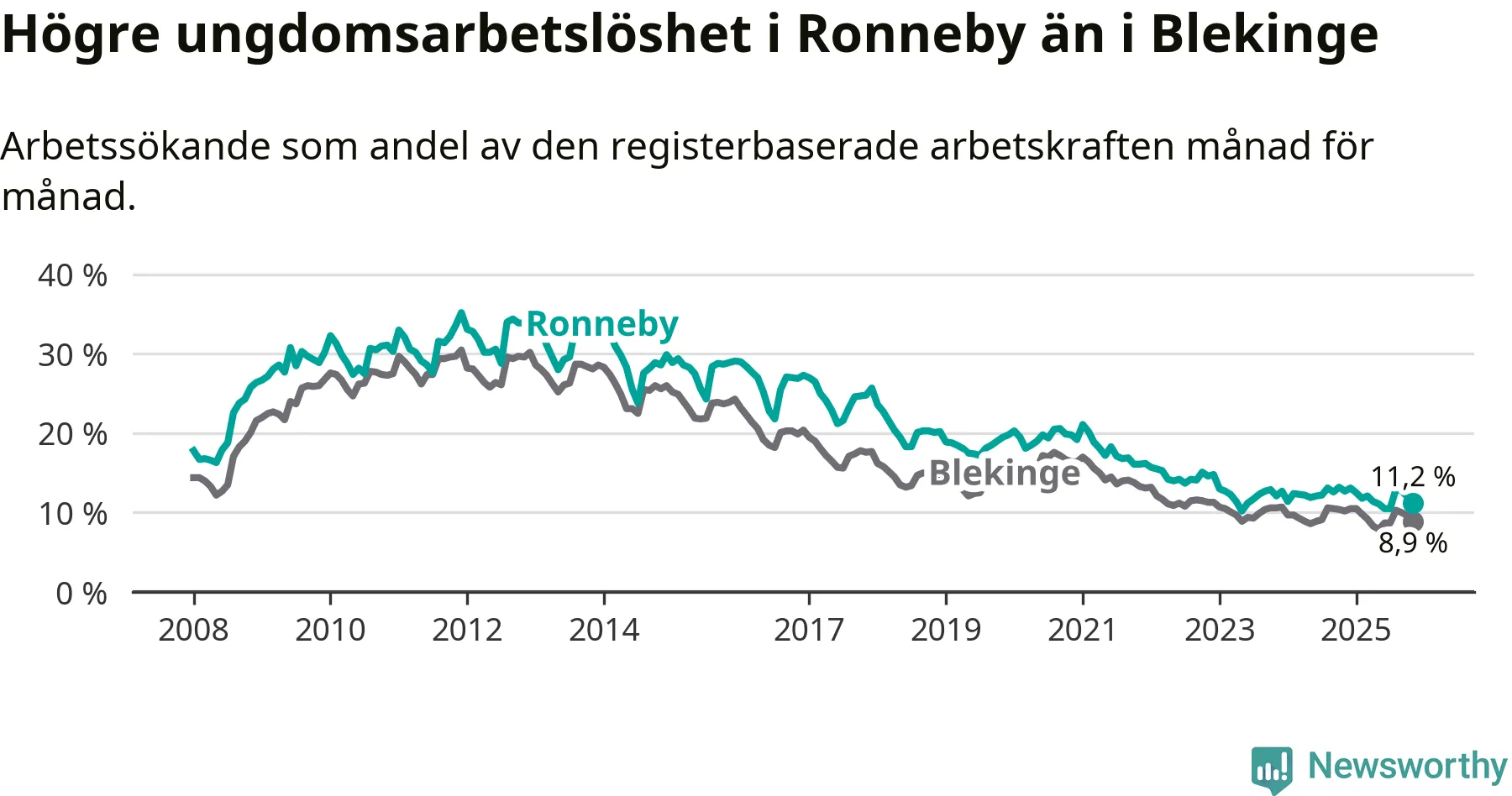Precis som den totala arbetslösheten ligger ungdomsarbetslösheten i Ronneby högre än i Blekinge som helhet. Skillnaden mellan kommunen och länet är 2,3 procentenheter.