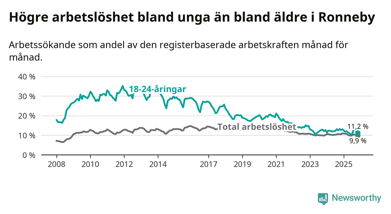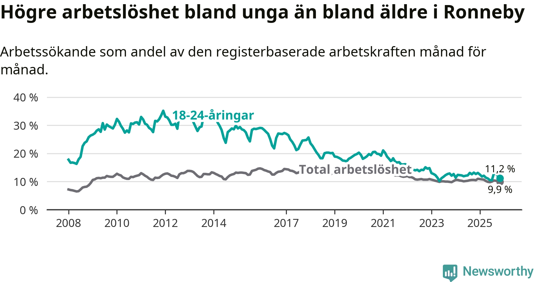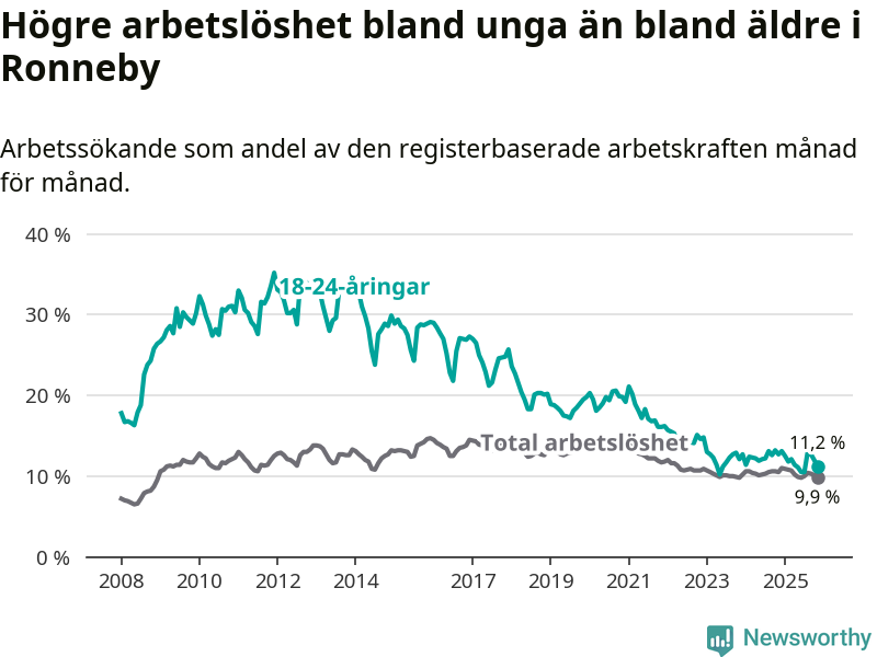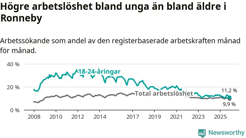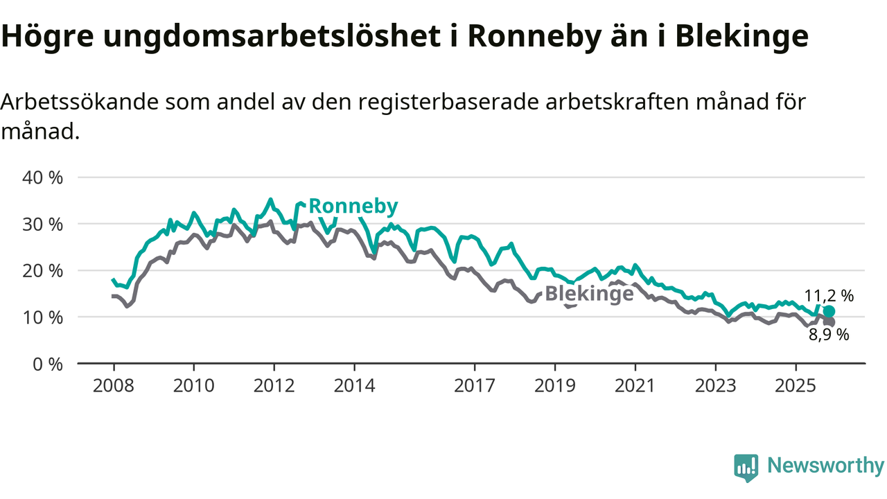 Precis som den totala arbetslösheten ligger ungdomsarbetslösheten i Ronneby högre än i Blekinge som helhet. Skillnaden mellan kommunen och länet är 2,3 procentenheter.