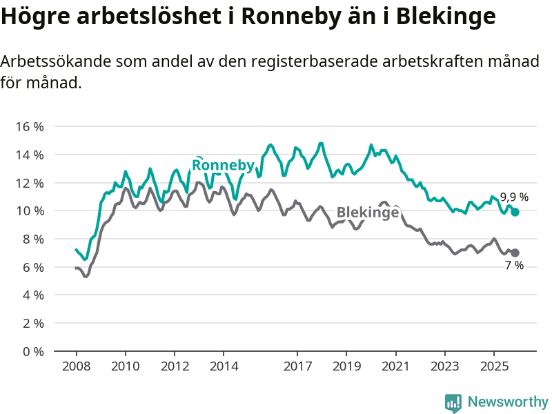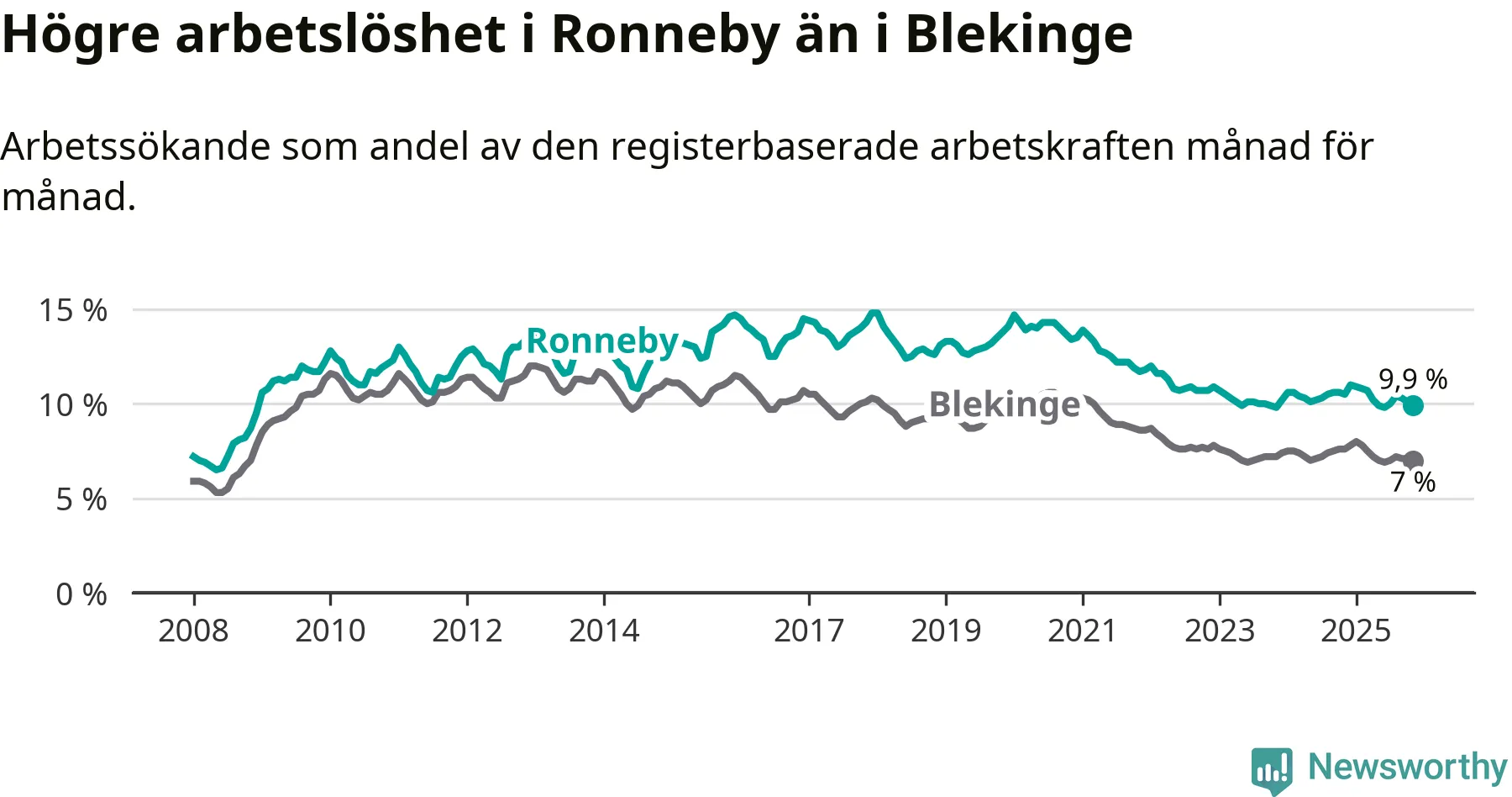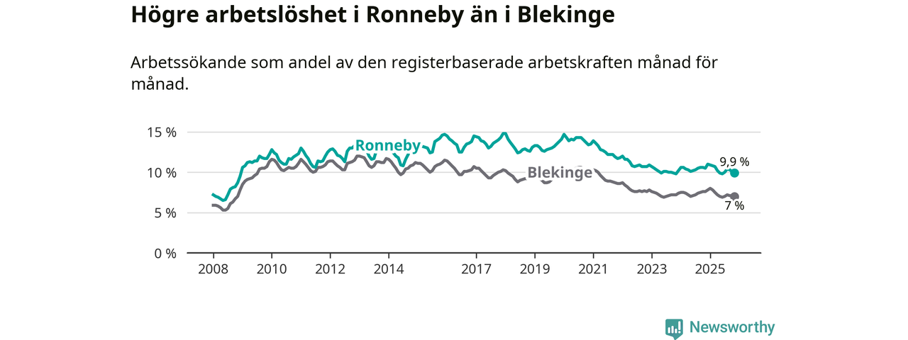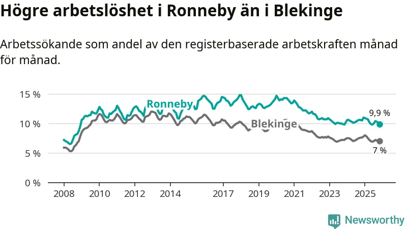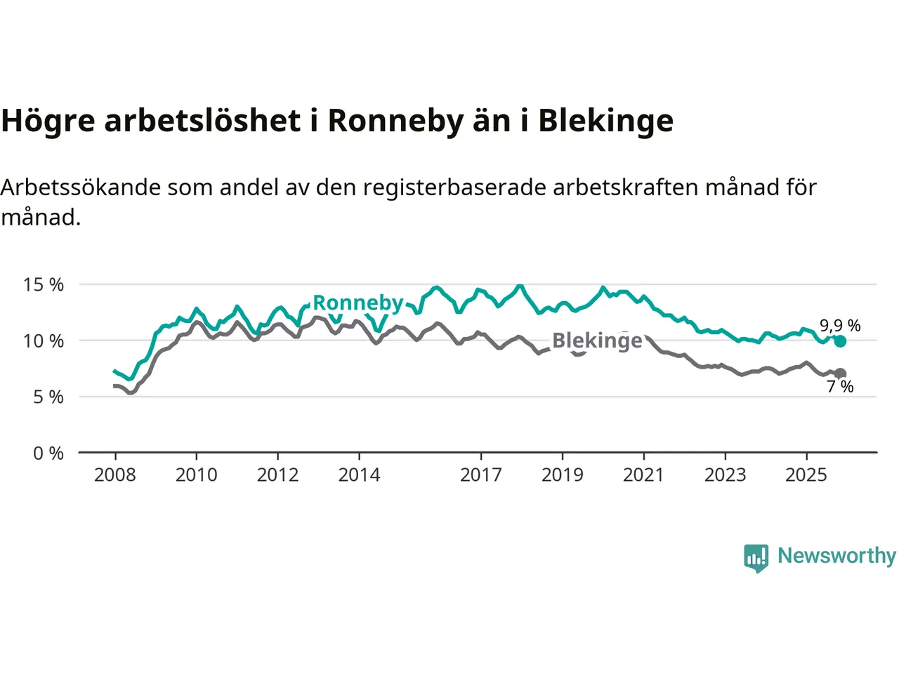 Under november månad rapporterade Ronneby kommun en total arbetslöshet på 9,9 procent. Det är en minskning jämfört med samma tidpunkt i fjol (−0,6 procentenheter). Även i Blekinge län sjunker arbetslösheten .