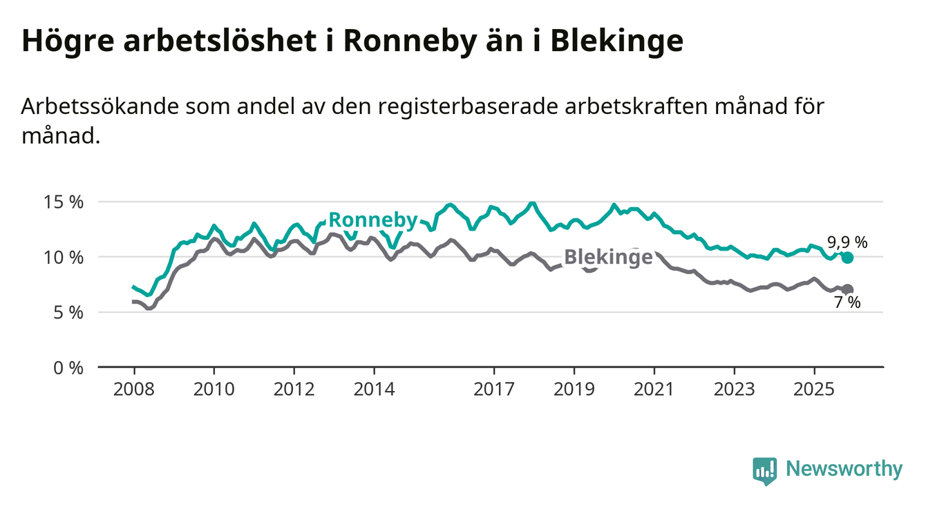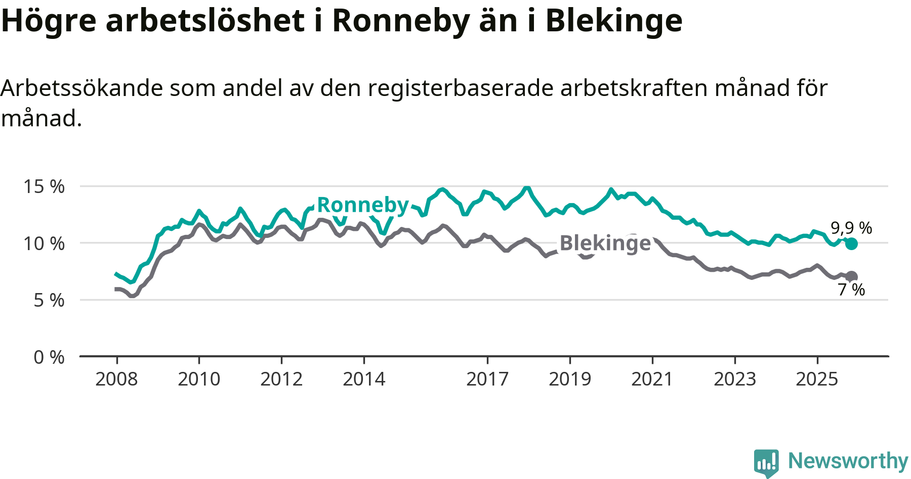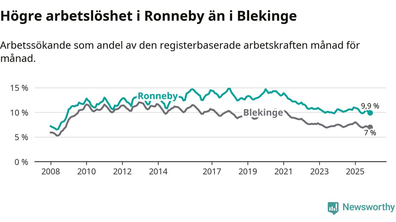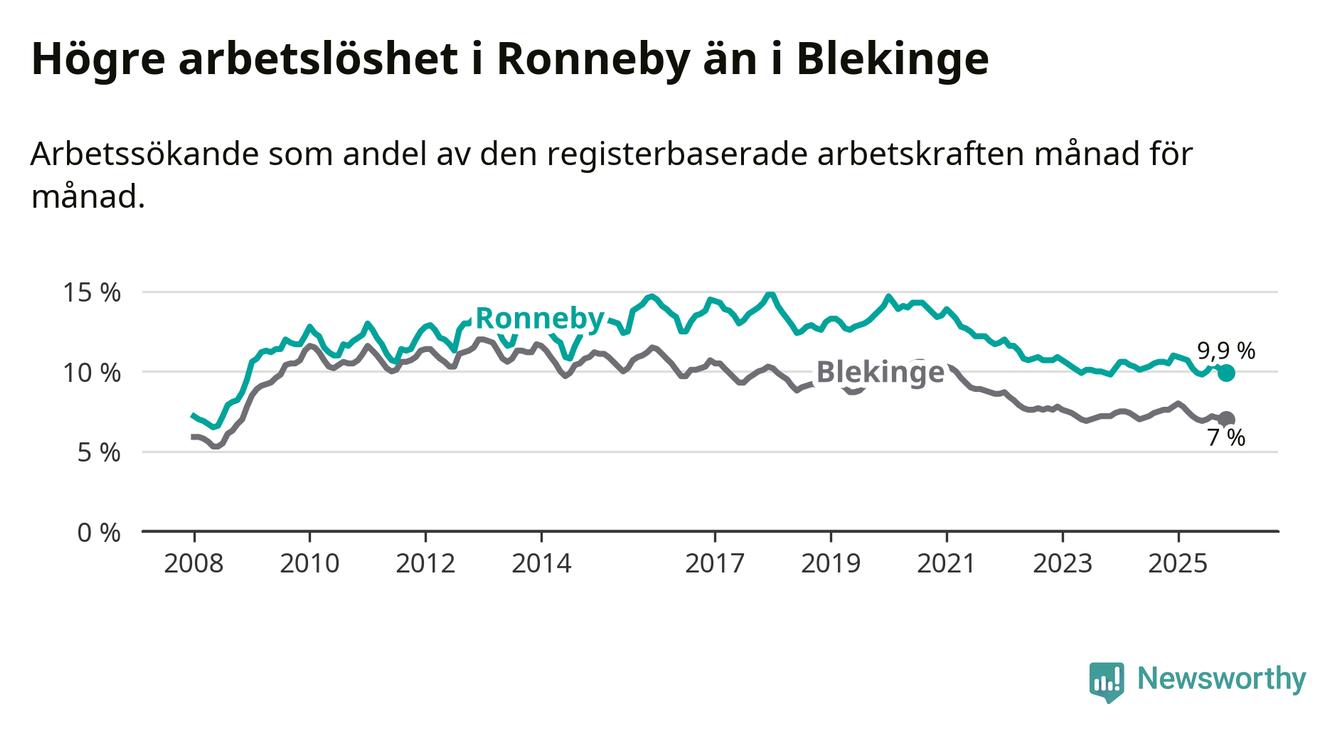 Även om arbetslösheten i Ronneby alltså minskar, så ligger den fortfarande över snittet i hela Blekinge län (9,9 procent i kommunen, jämfört med 7,0 procent i hela länet). Ronneby har därmed även den högsta arbetslöshetsnivån i länet. Karlskrona har den lägsta (5,3 procent). För att Ronneby skulle komma ner i samma arbetslöshetsnivå som Karlskrona skulle 604 personer behöva sysselsättas.