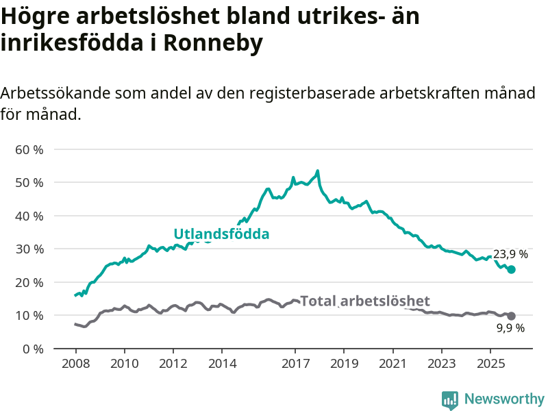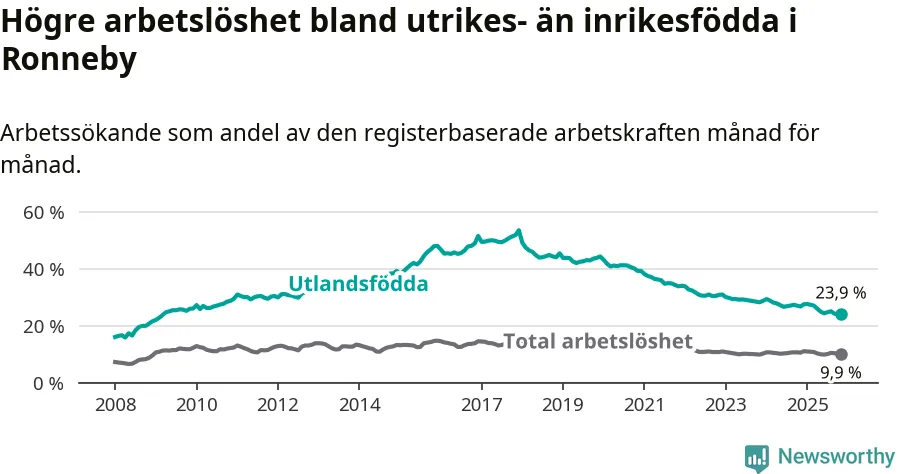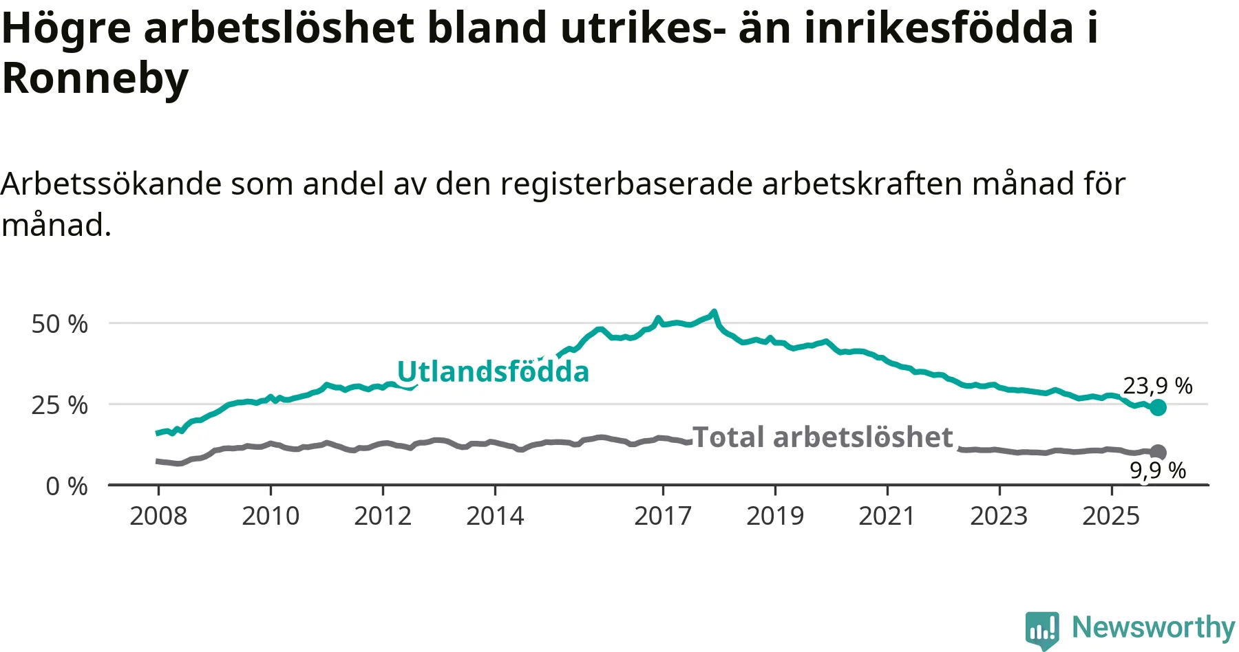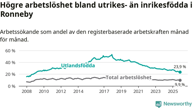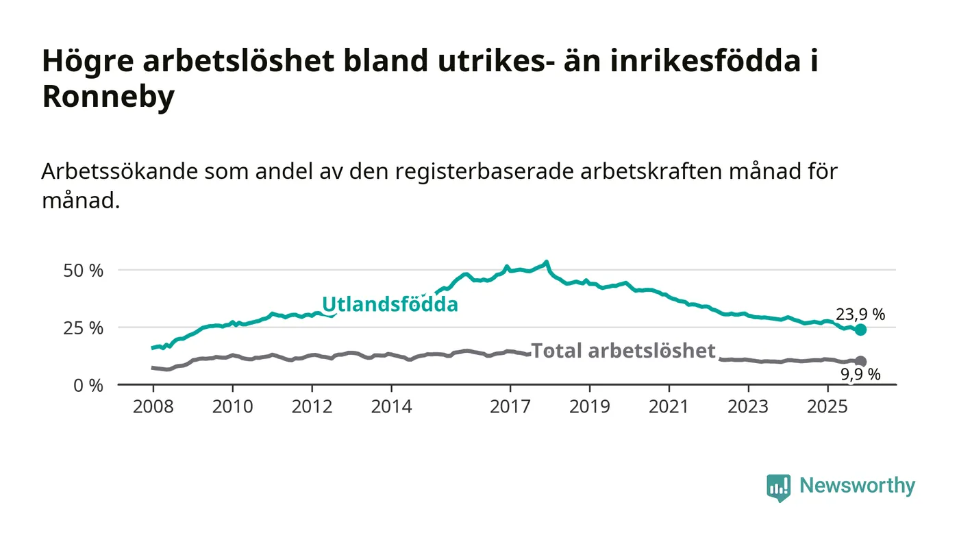 Arbetslösheten bland utlandsfödda var 23,9 procent i Ronneby under november månad, motsvarande 648 av 2 711 personer. Det är 2,8 procentenheter färre än vid samma tidpunkt i fjol (−80 om man räknar personer). Därmed har de utlandsföddas arbetslöshet varit lägre än vid samma tidpunkt i fjol i över sju år i sträck. Sedan december 2017 har arbetslösheten bland utlandsfödda minskat från 53,5 till 23,9 procent. Den nuvarande arbetslöshetsnivån är den lägsta sedan mars 2009.